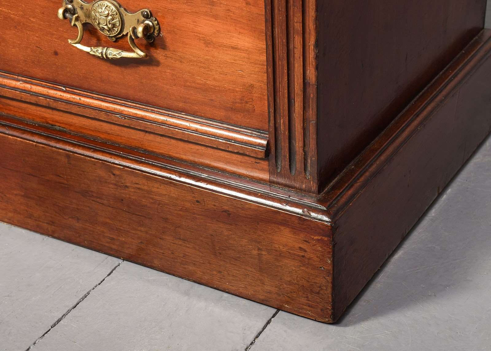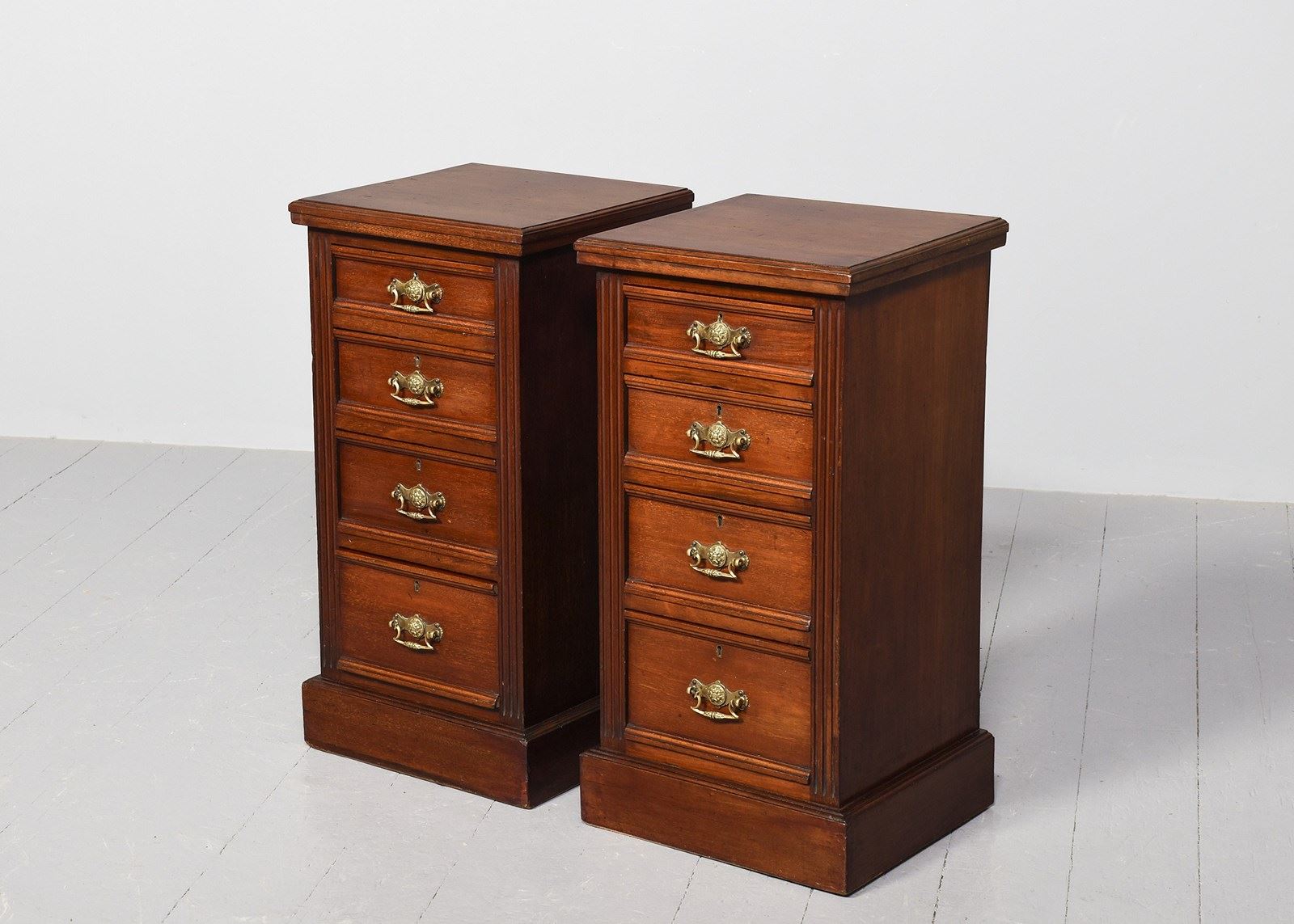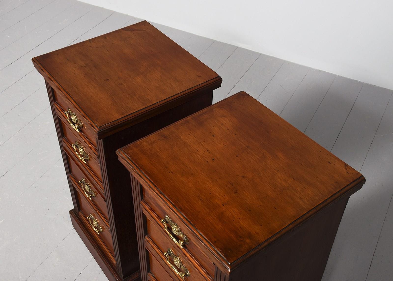 Circa 1880. Pair of late Victorian 4-drawer, walnut bedside lockers. The rectangular tops with moulded edges above four graduated drawers flanked by fluted pilasters. The drawers with moulded fronts and lovely foliate-designed brass loop handles, brass locks and solid mahogany drawer linings (sign of quality). All sitting on moulded enclosed plinth bases.