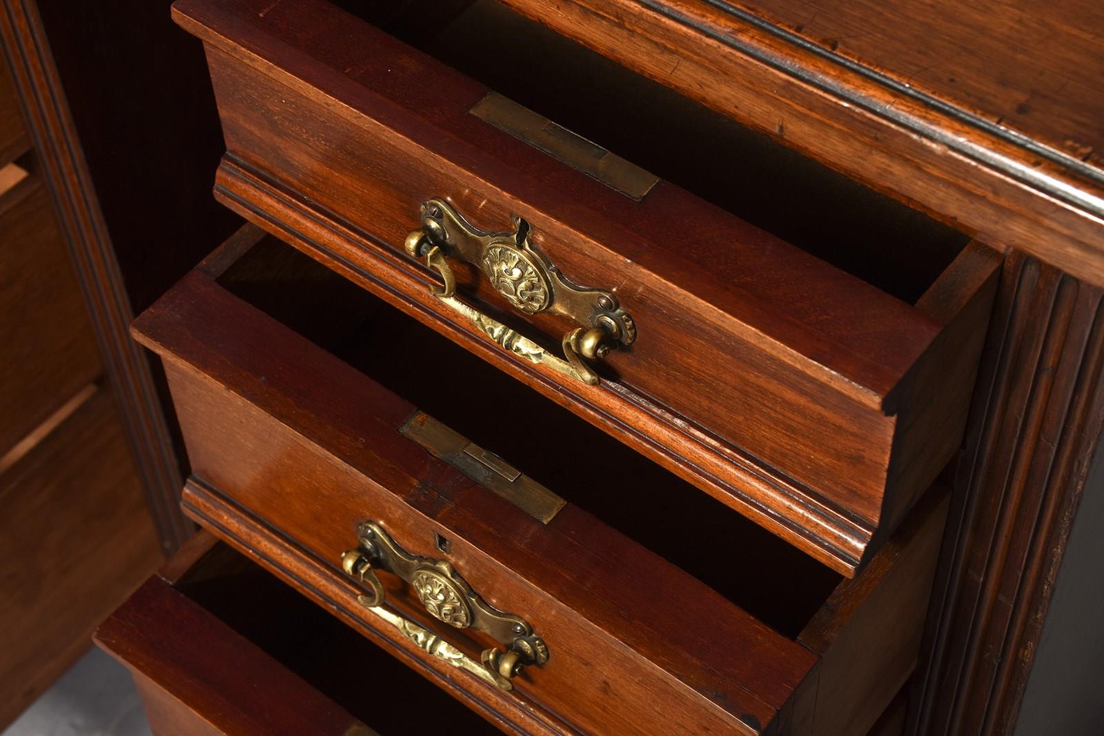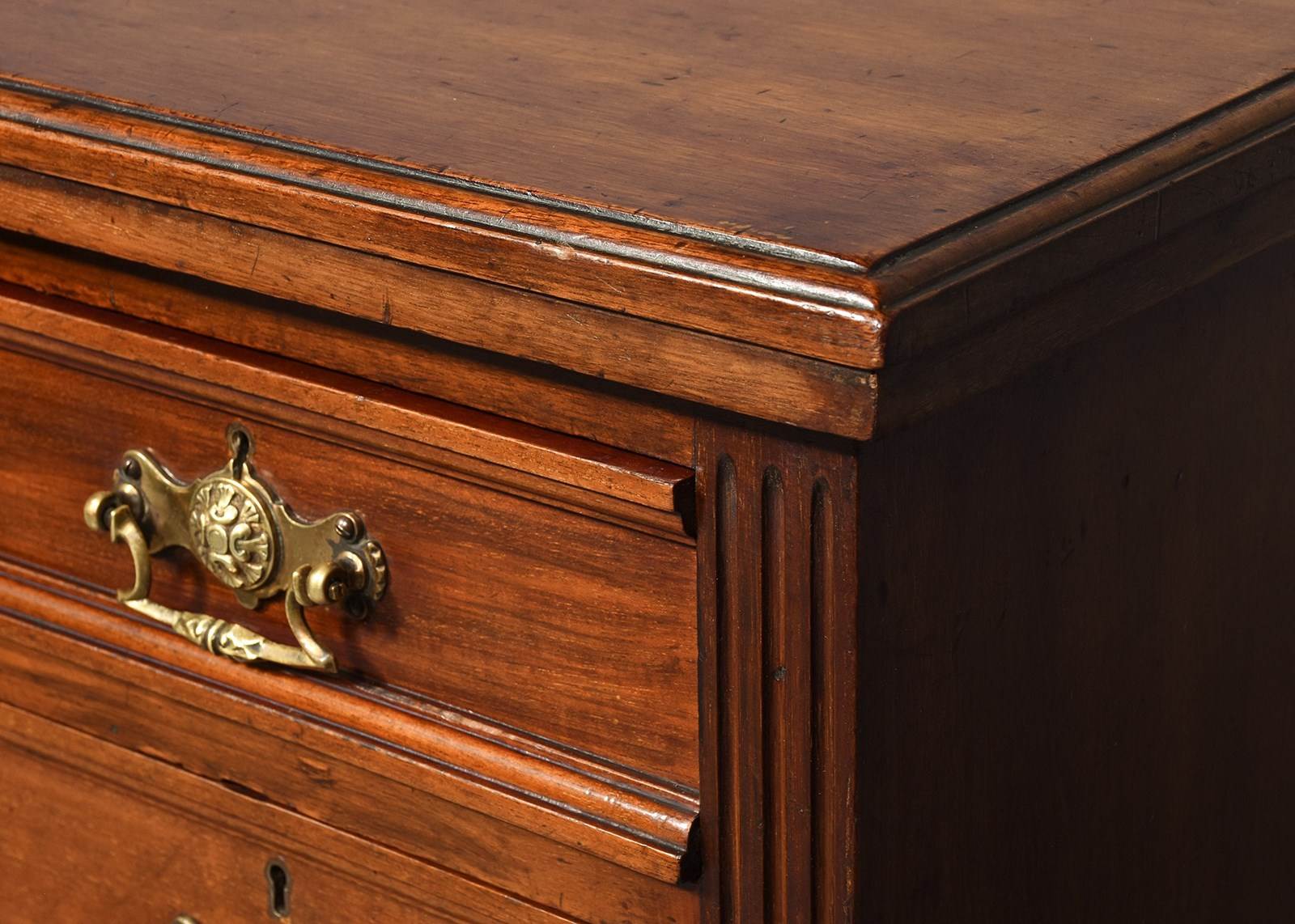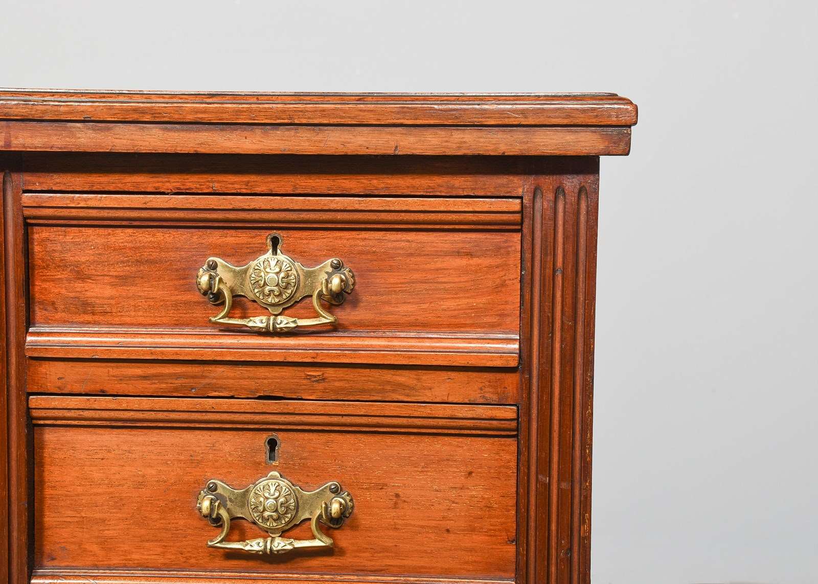 Circa 1880. Pair of late Victorian 4-drawer, walnut bedside lockers. The rectangular tops with moulded edges above four graduated drawers flanked by fluted pilasters. The drawers with moulded fronts and lovely foliate-designed brass loop handles, brass locks and solid mahogany drawer linings (sign of quality). All sitting on moulded enclosed plinth bases.