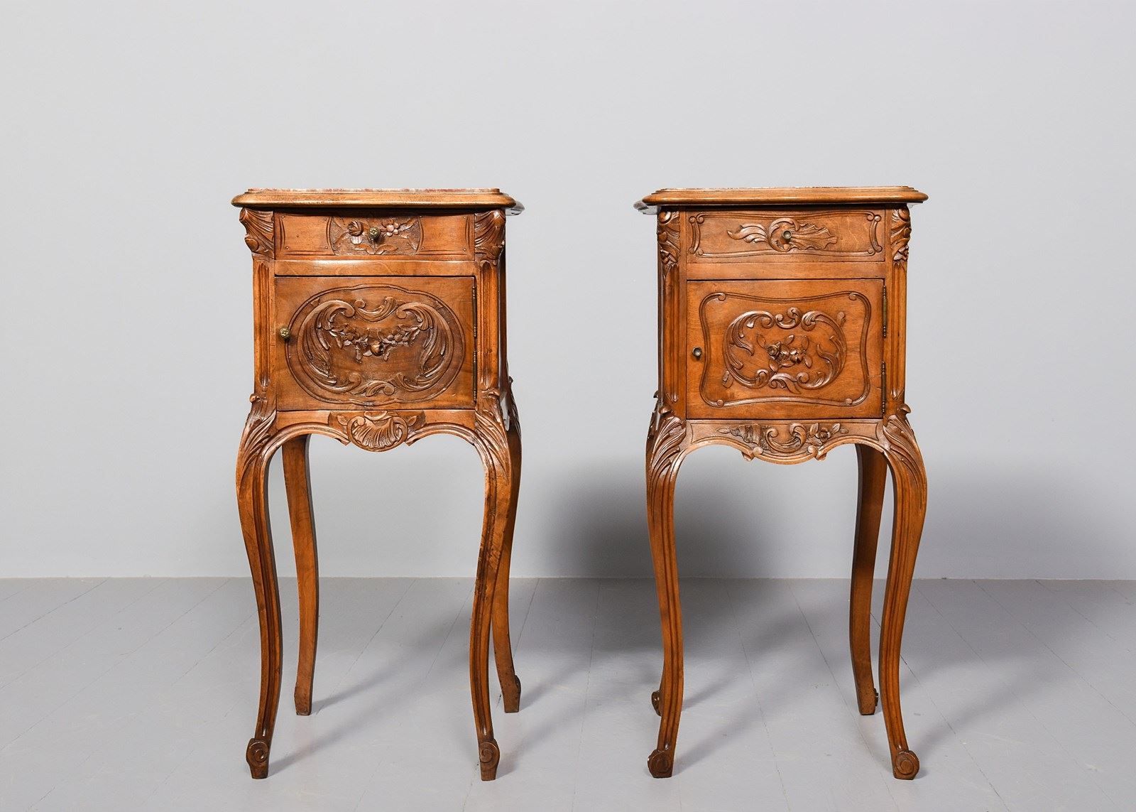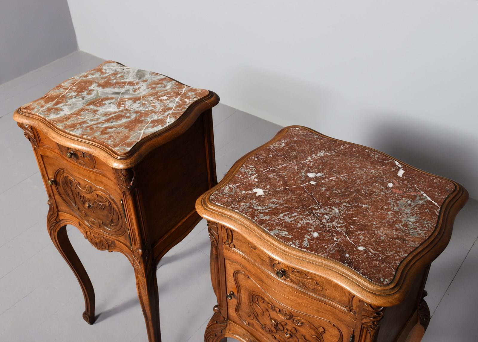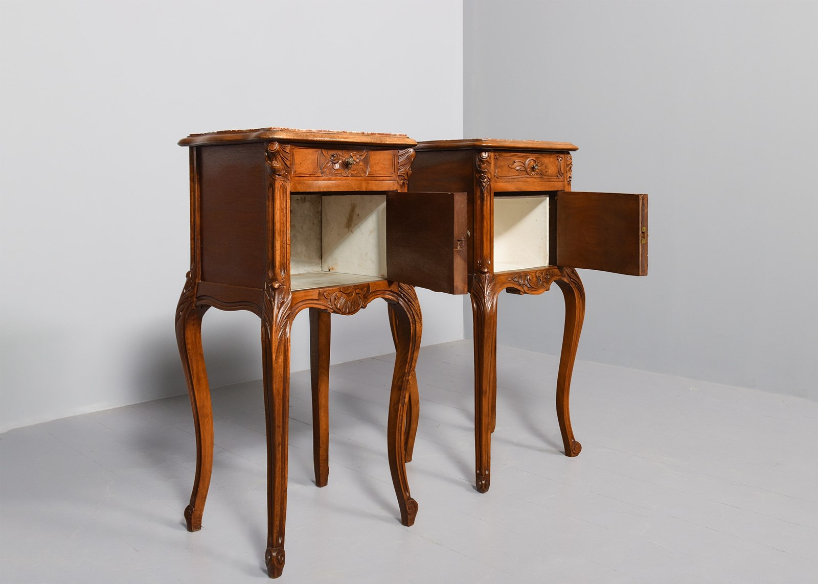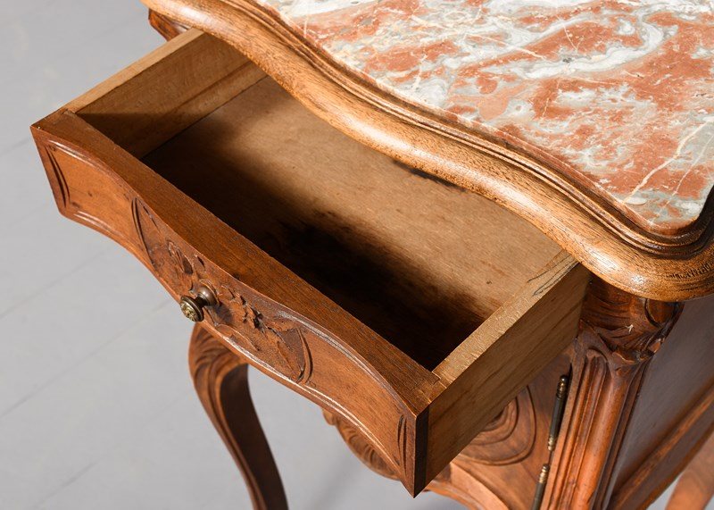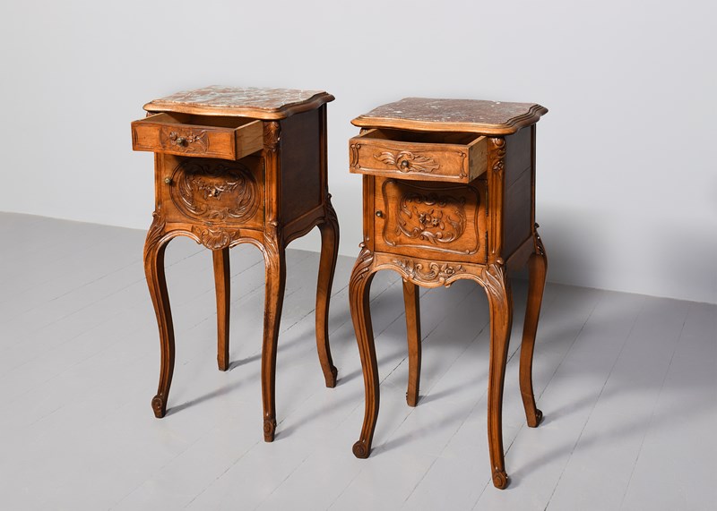 Circa 1880. Pair of late Victorian, Louis XIV style marble top freestanding bedside cabinets. The tops with pink variegated marble inserts with a fine moulded fore edge, the front with serpentine drawers with foliate carving and stylish cast knobs. The serpentine door with similar carving opens to a marble-lined interior. With a shaped and carved apron over elegant carved cabriole legs finishing on well-curved feet.