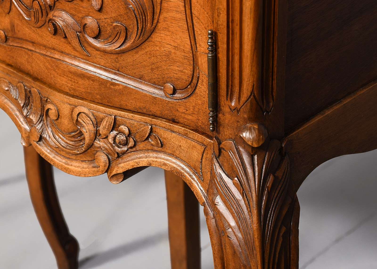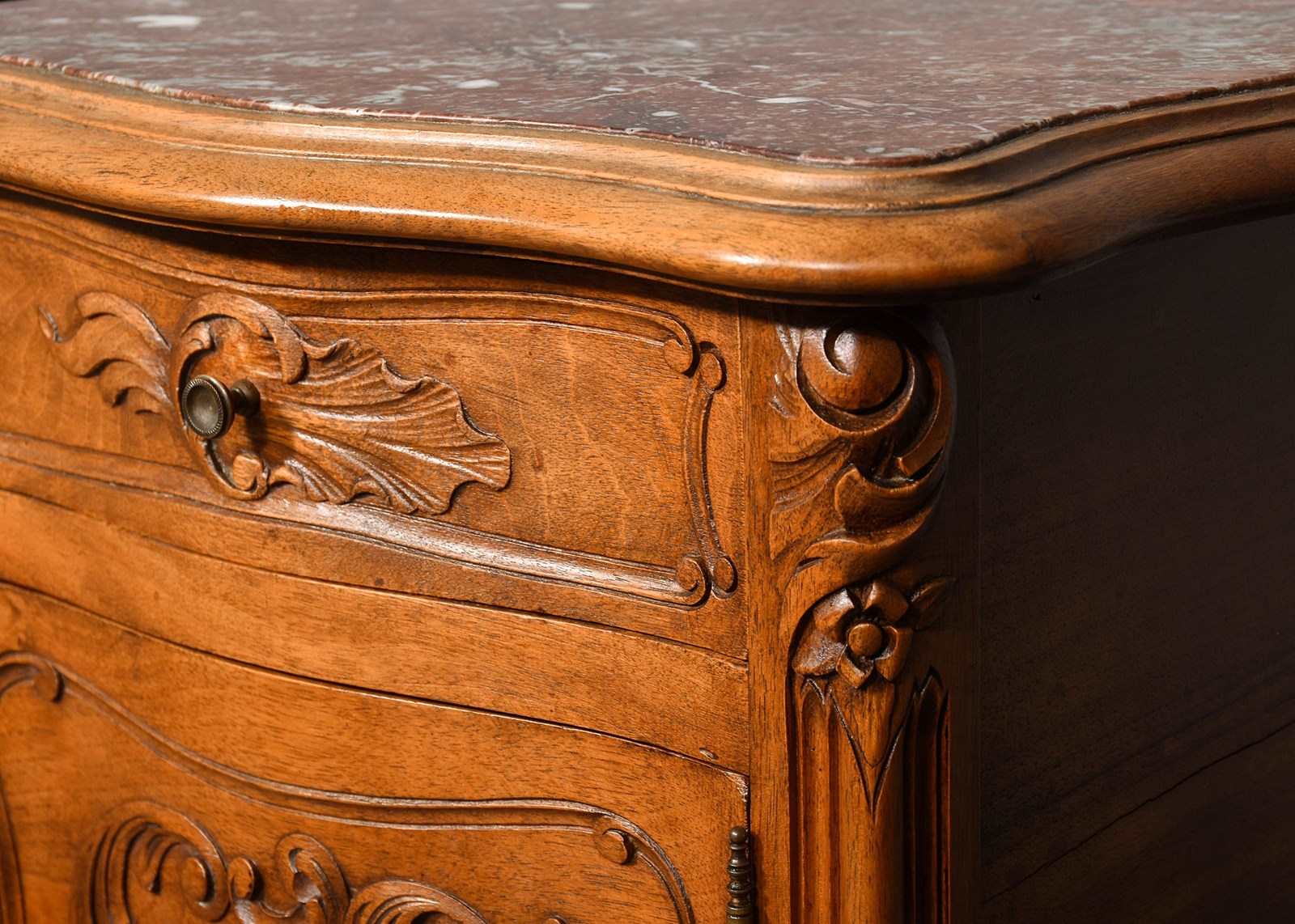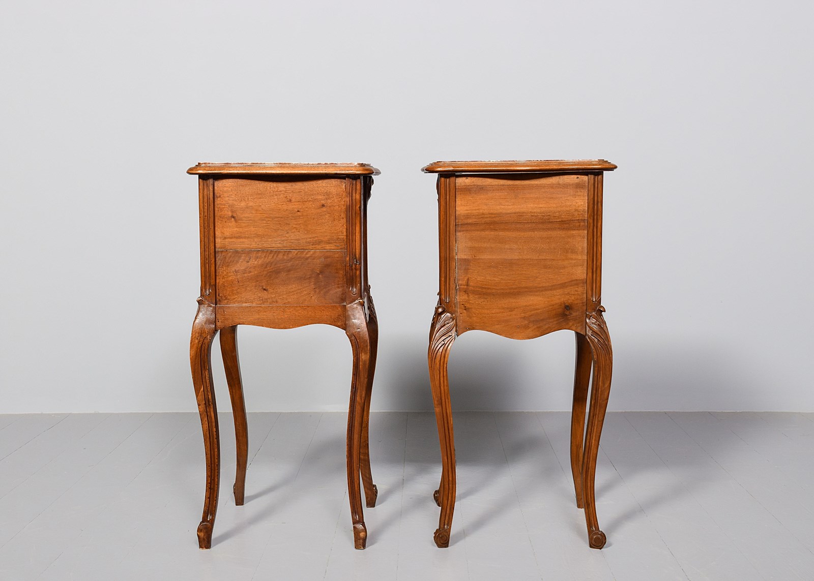 Circa 1880. Pair of late Victorian, Louis XIV style marble top freestanding bedside cabinets. The tops with pink variegated marble inserts with a fine moulded fore edge, the front with serpentine drawers with foliate carving and stylish cast knobs. The serpentine door with similar carving opens to a marble-lined interior. With a shaped and carved apron over elegant carved cabriole legs finishing on well-curved feet.