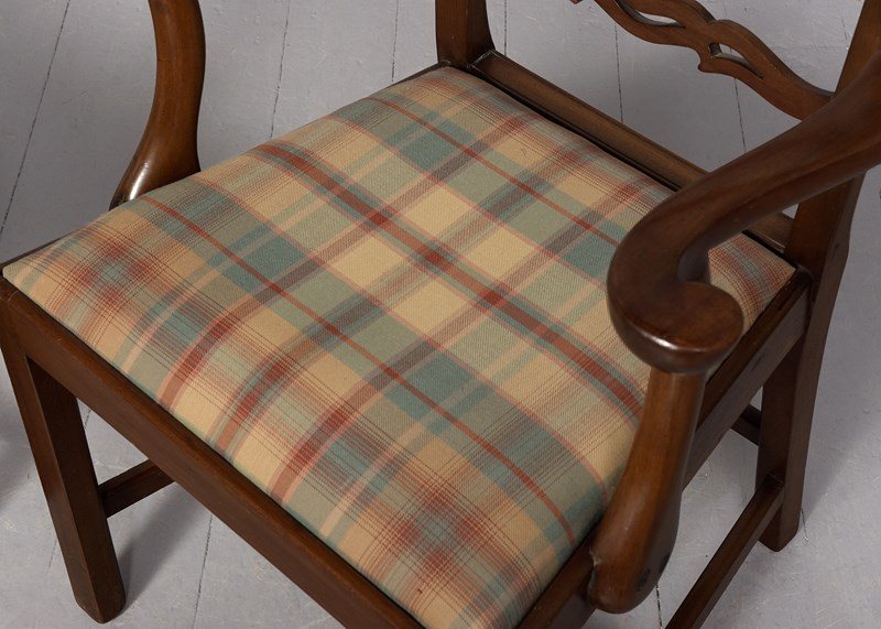 Circa 1920s. A pair of George III style mahogany ladder-back chairs, the shaped and pierced cresting rail with three pierced rails beneath, the curvaceous arms supported on shaped uprights, the drop in upholstered seat with simple seat rail, back legs are square and slightly out swept, the front legs are square with a small chamfer on the inside, all braced by conforming stretchers.
