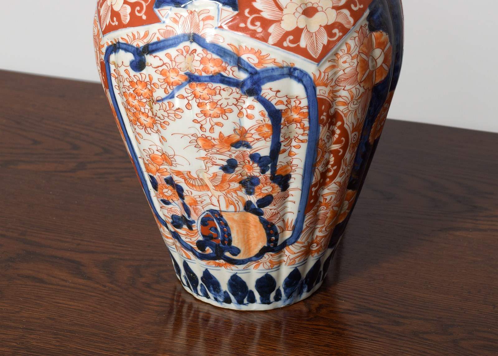 Circa 1890. Pair of Meiji period fluted Imari vases recently converted into lamps, the tapering and fluted bodies with classic Imari patterns, and the