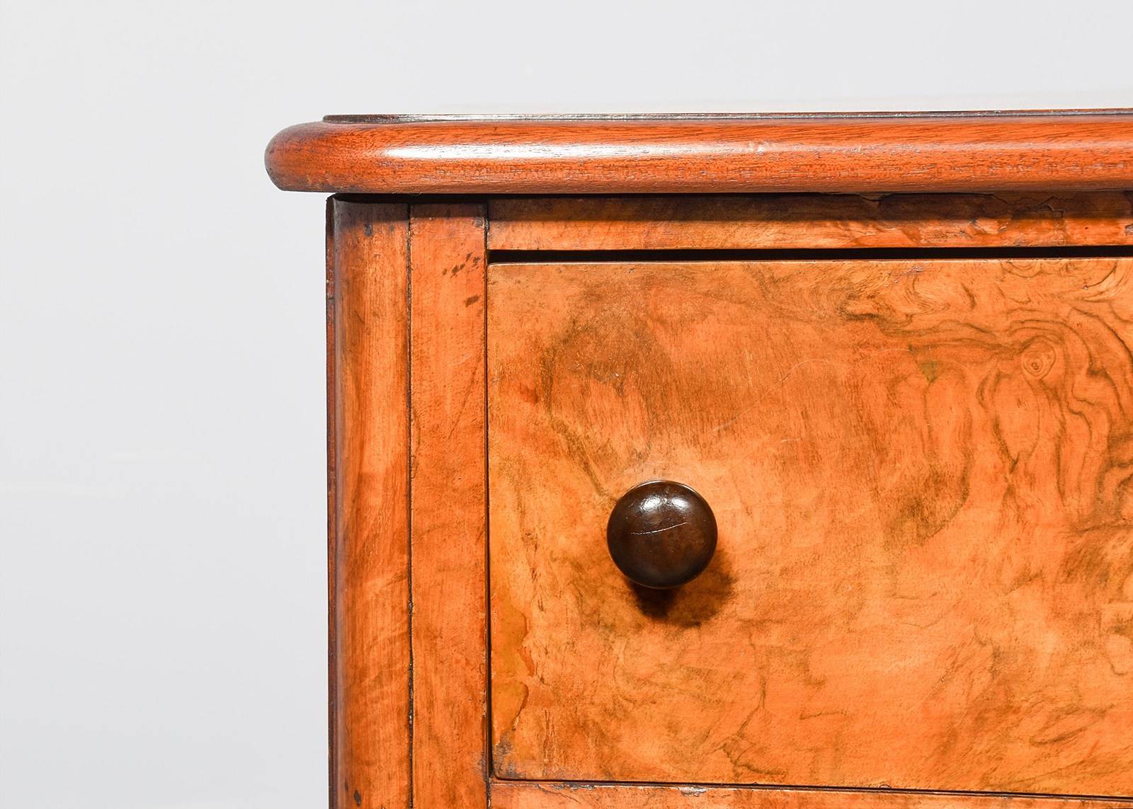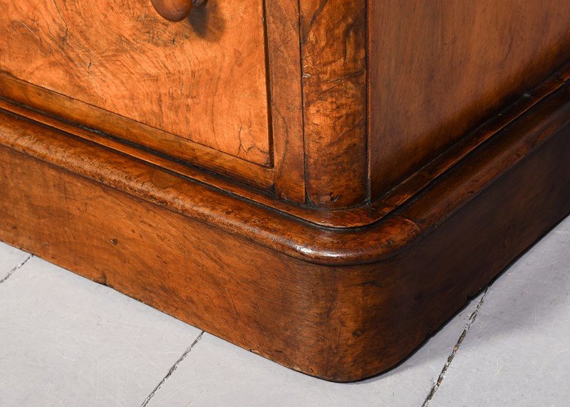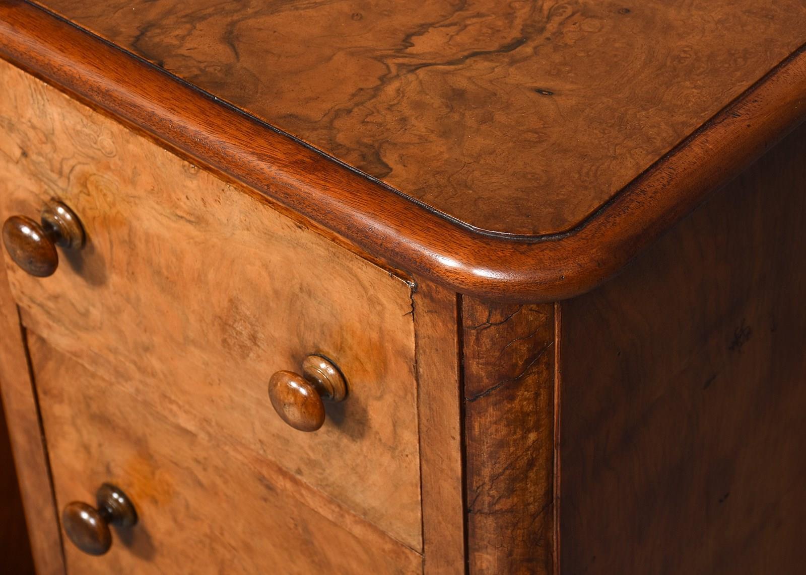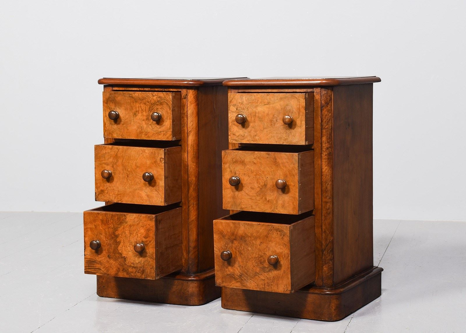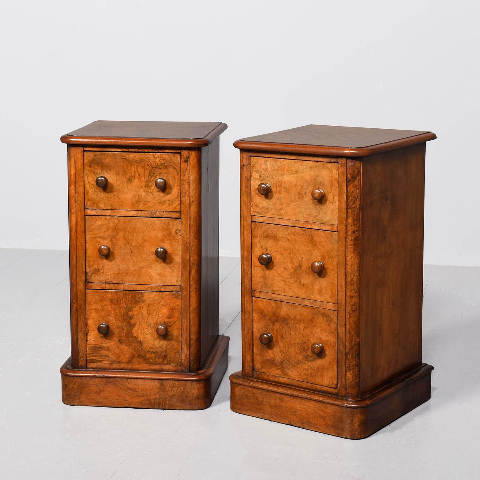 Circa 1860 with modifications. Pair of mid-Victorian figured walnut bedside lockers with rounded corners. The rectangular tops in nicely figured walnut with rounded fore-edges with three drawers with original turned knob handles and solid mahogany drawer linings (sign of quality) all sitting on moulded enclosed plinth bases.