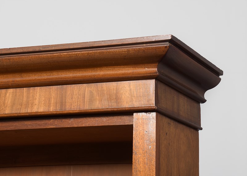 Circa 1870 (with alterations). Pair of Mid-Victorian tall mahogany open bookcases. Surmounted by classical moulded cornices and figured mahogany friezes, the open bookcases each with four adjustable shelves, flanked by simple mahogany pilasters and sitting on enclosed plinth bases. Nice mellow colour and in excellent condition. Attractive, simple design and functional – would suit a contemporary or traditional setting.