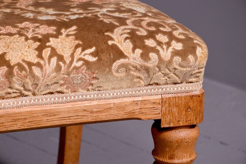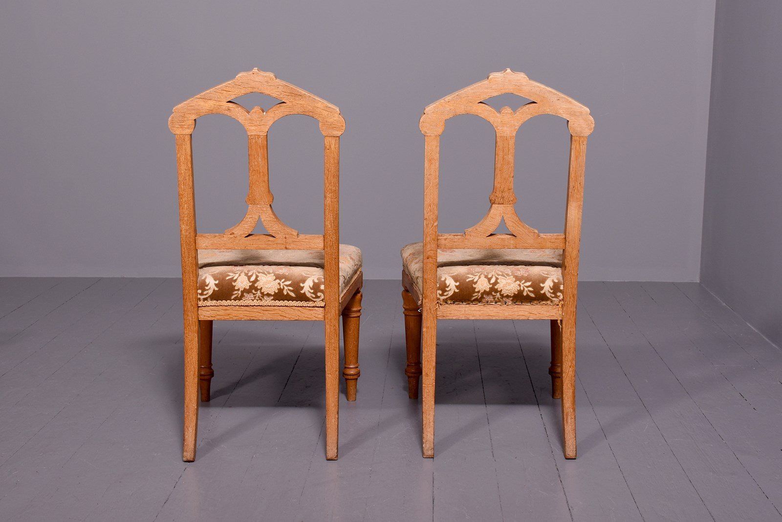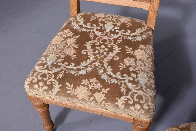 Circa 1870. A pair of Gothic oak chairs stamped, ‘John Taylor & Son, Edinburgh’, the shaped top rail with a pierced back with gothic arches and chamfered fore edges, with a large stuff over seat and simple seat rails, back legs are square and slightly out swept, front legs are turned, ring turned and tapering On the underside of one chair is stamped.
