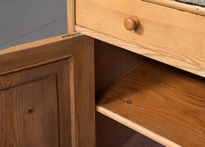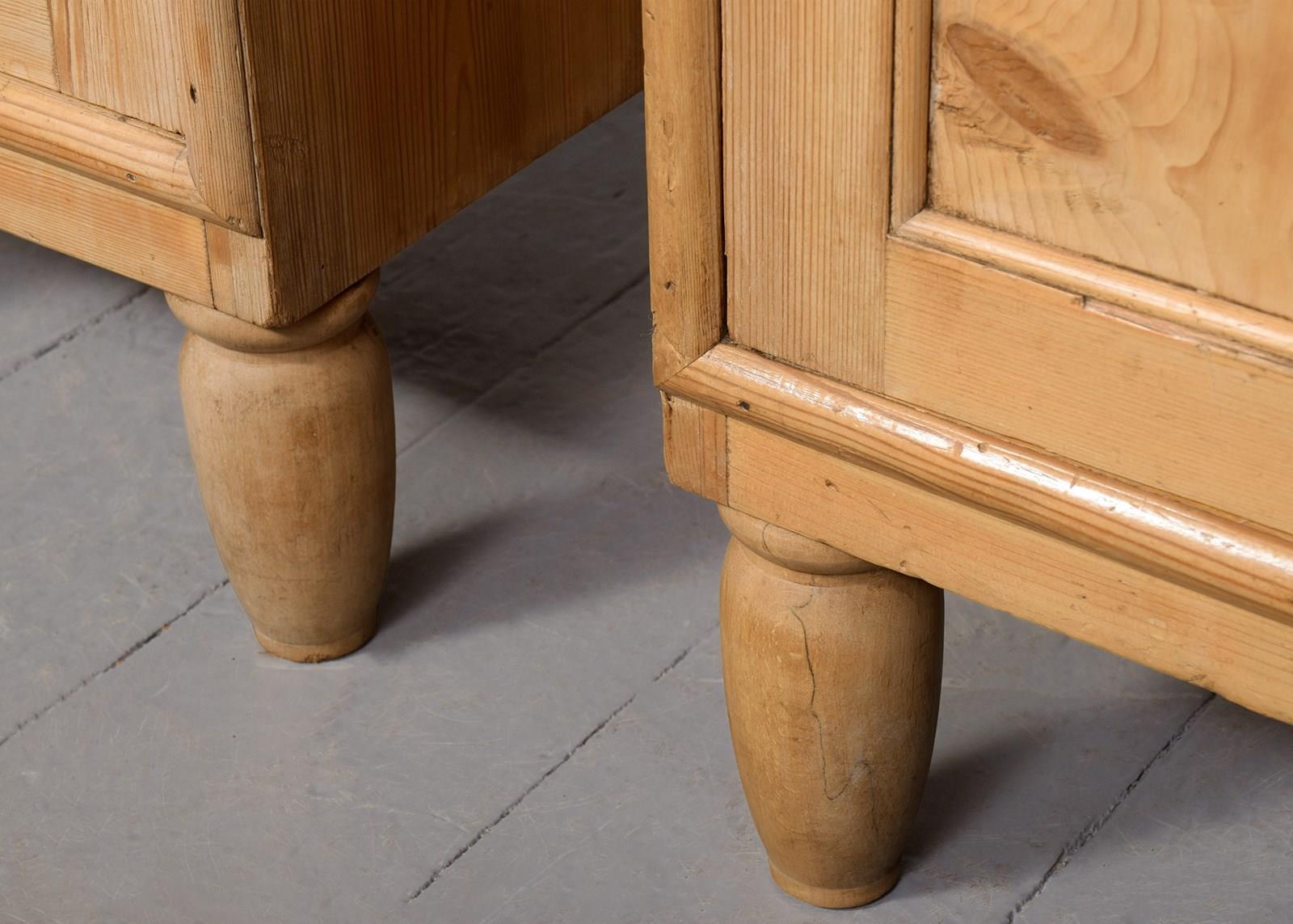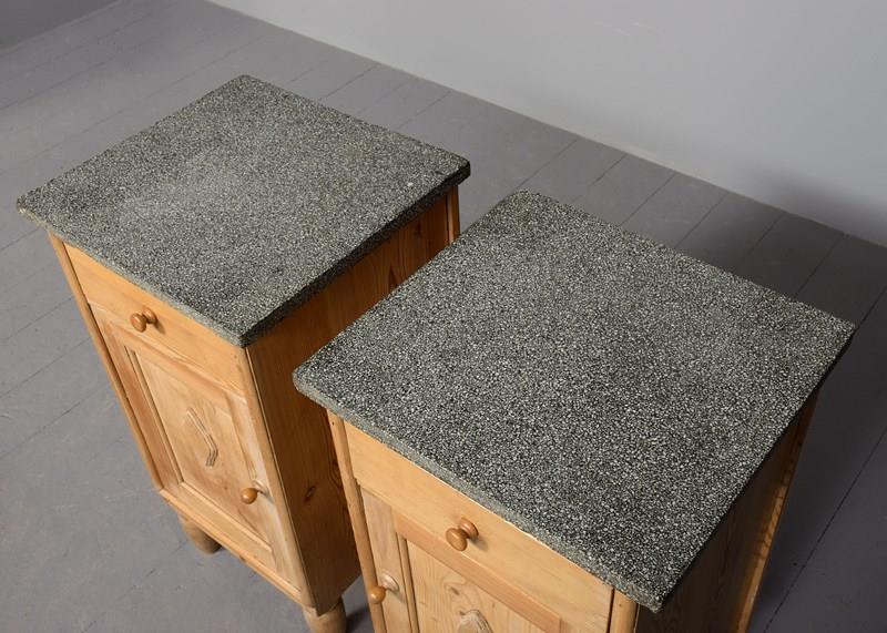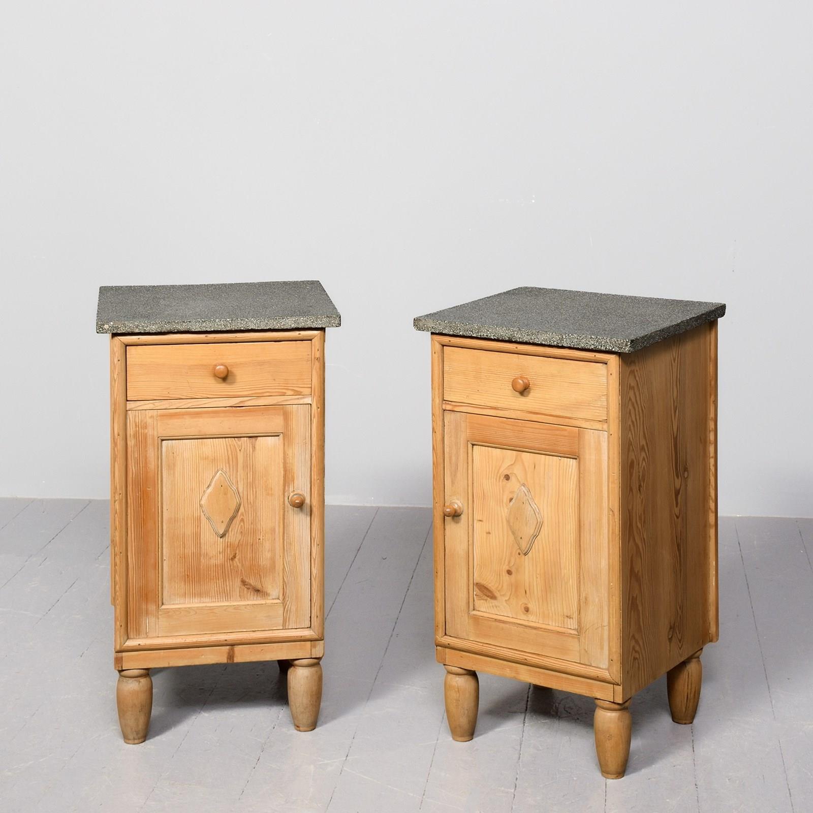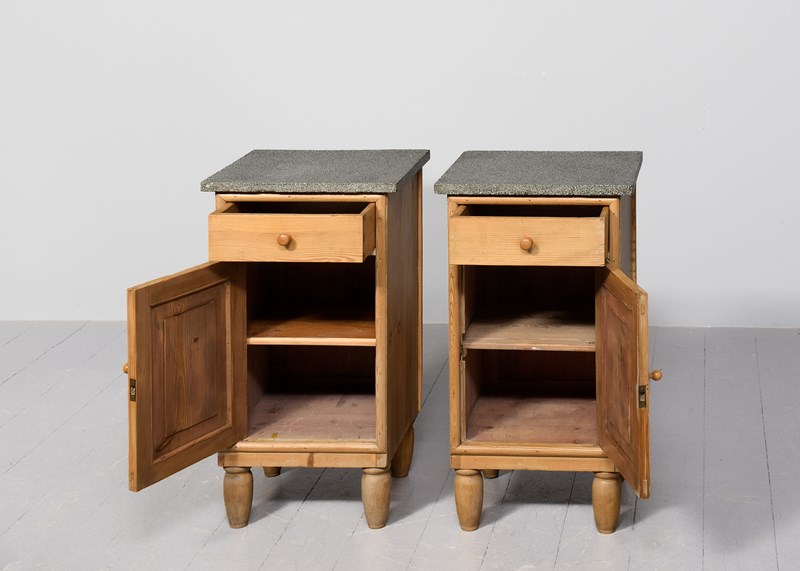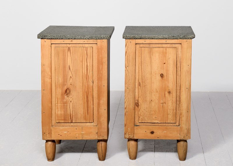 Circa 1890.A stylish pair of late Victorian, pine lockers with attractive speckled marble-tops Circa 1890. A stylish pair of late Victorian marble-top, pine lockers. The rare and attractive, white-speckled, dark green marble tops over frieze drawers with neat, turned knobs, and shelved panel-door cupboards. Supported on turned tulip-shaped feet.