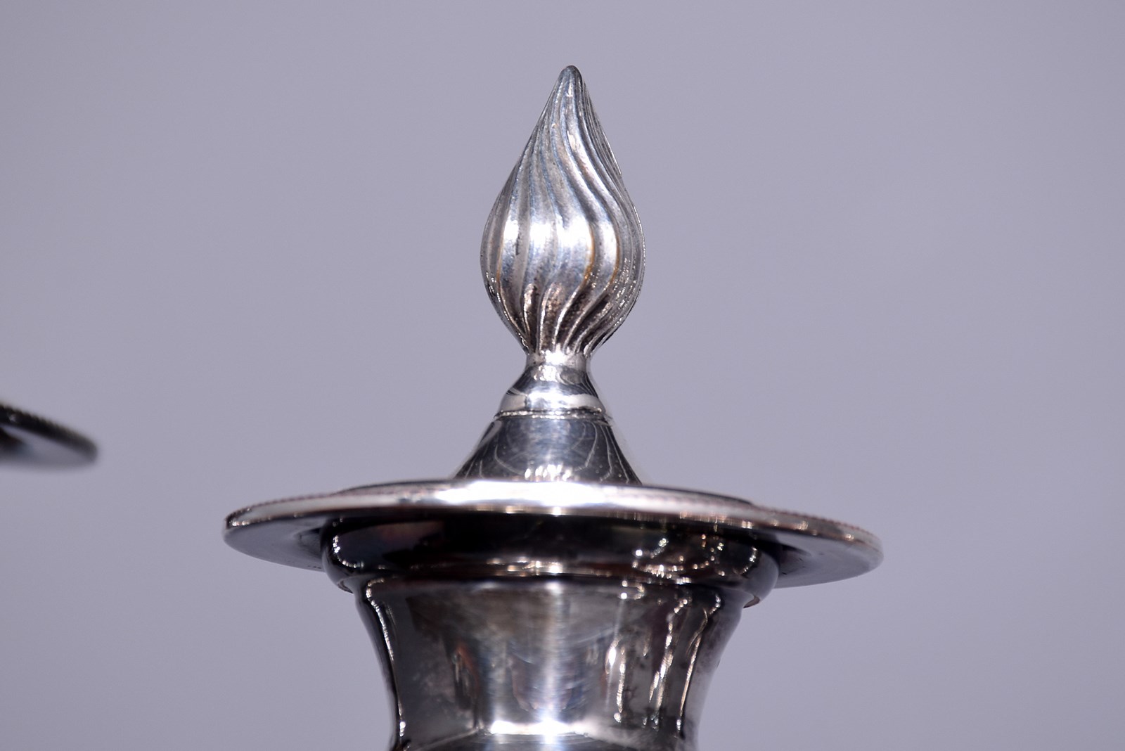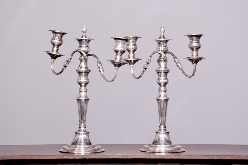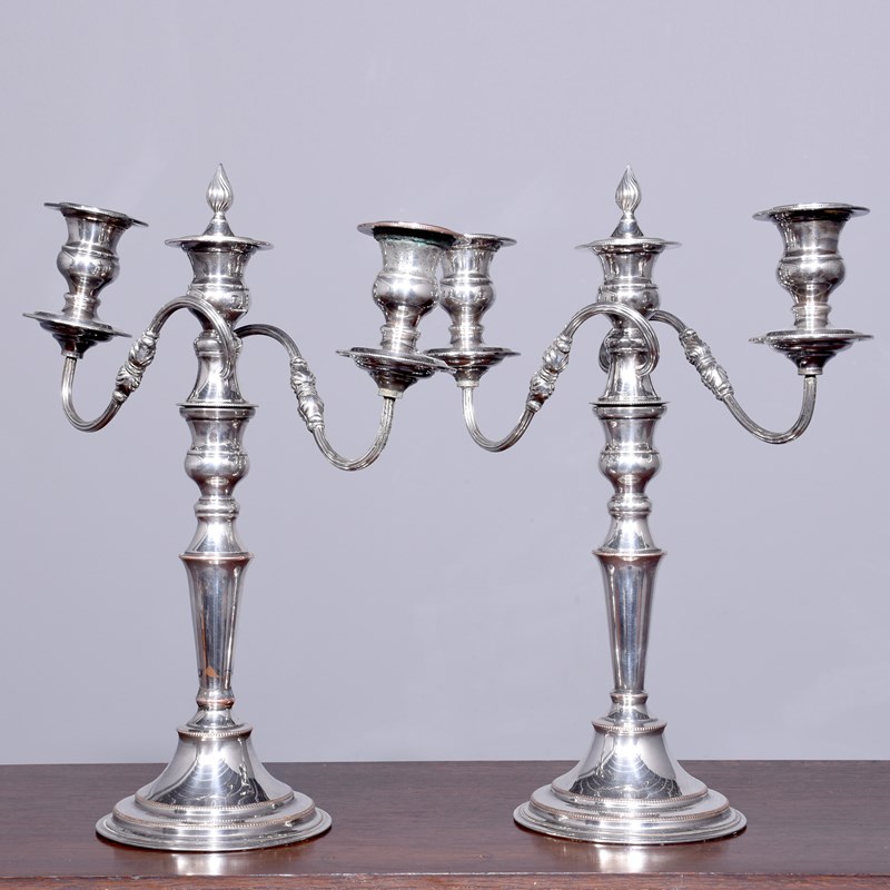 Circa 1890. A pair of Electroplated Nickel Silver (EPNS) candelabra, the central turned stem surmounted by a removable finial, the edges with fine decoration, issuing two shaped arms which support two candle holders with similar drip trays and removable nozzles, the candelabra can be used in 3 combinations