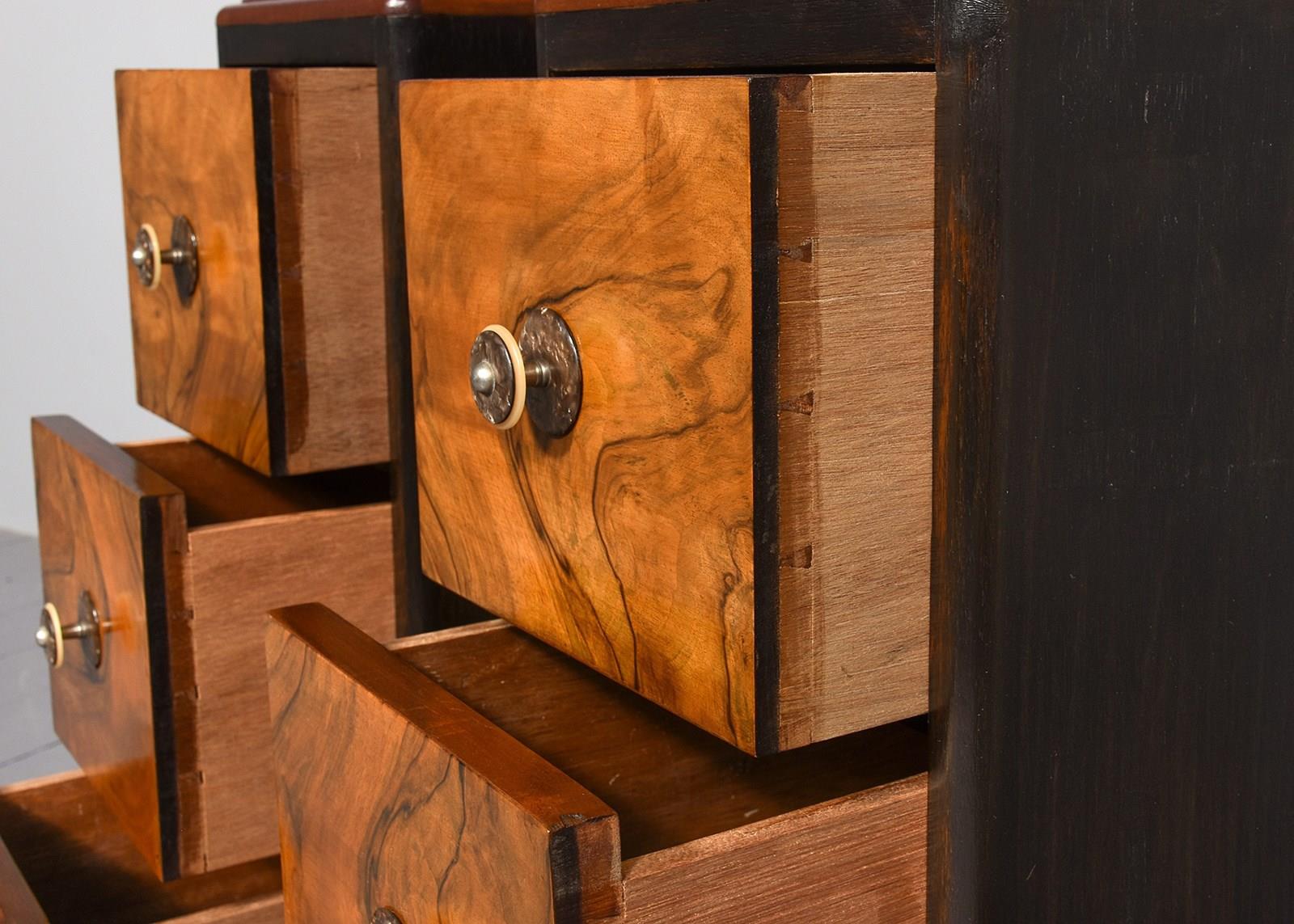 Circa 1930s. A stylish pair of tall, narrow, grained walnut bedside cabinets, the tops in book-matched walnut with a simple rounded fore-edge, the fronts with three square drawers with nice figuring on the facings, all with faux marble handles, the fore-edges and gables in darkened walnut, all resting on stylish concave-shaped plinths.