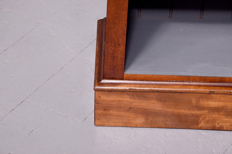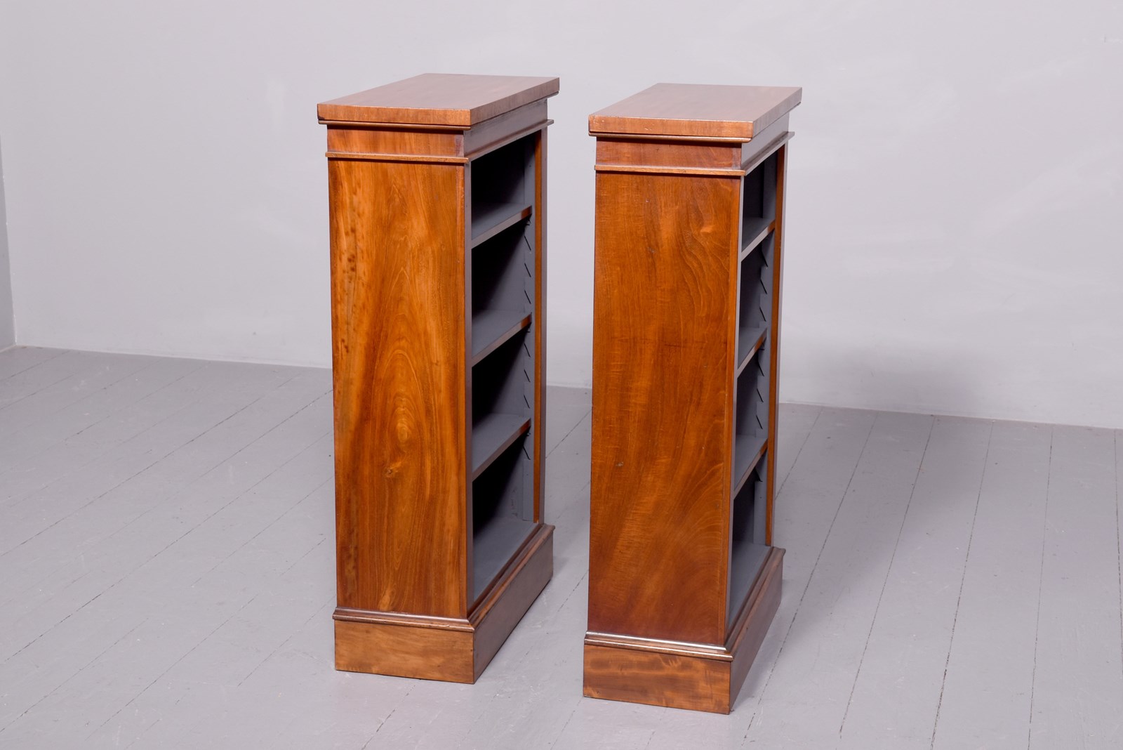 Circa 1880 (adapted). Pair of Victorian mahogany neat sized, open bookcases. Surmounted by a polished mahogany tops with crossbanded fore-edges and beaded friezes. The interiors with three adjustable shelves, flanked by pilasters. Supported on enclosed plinth bases