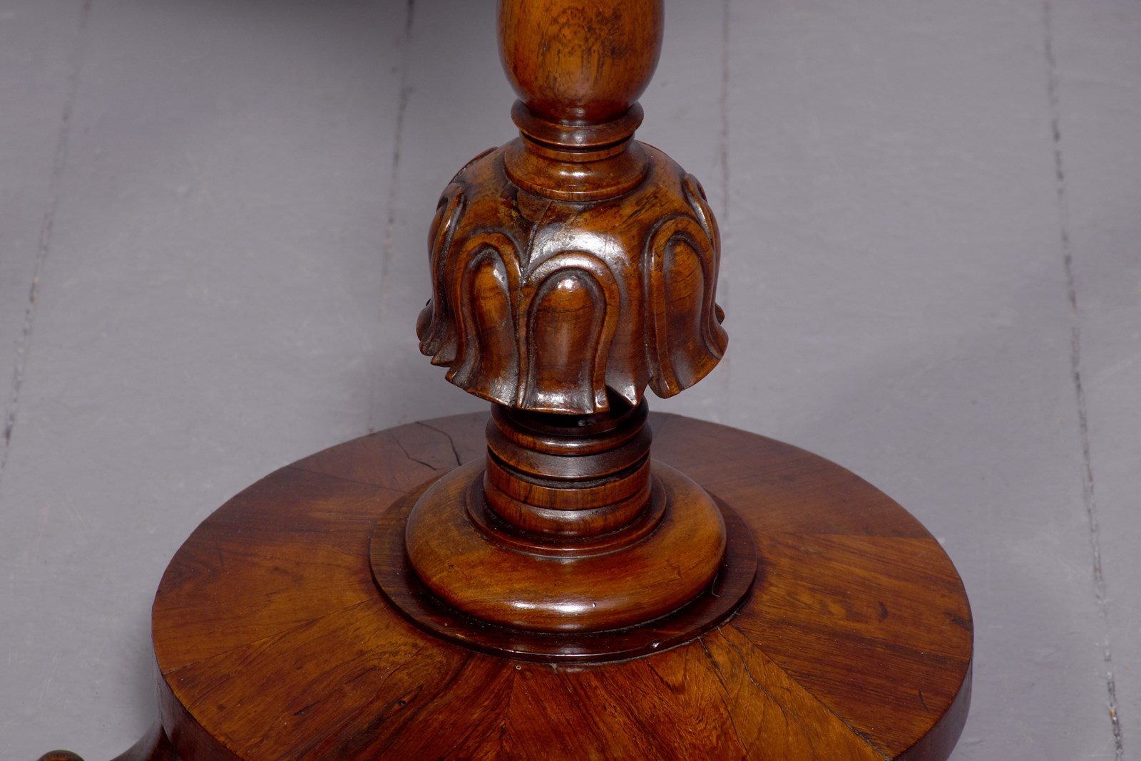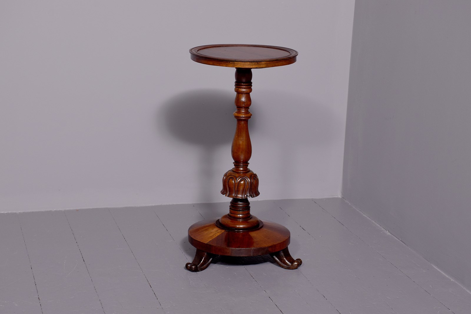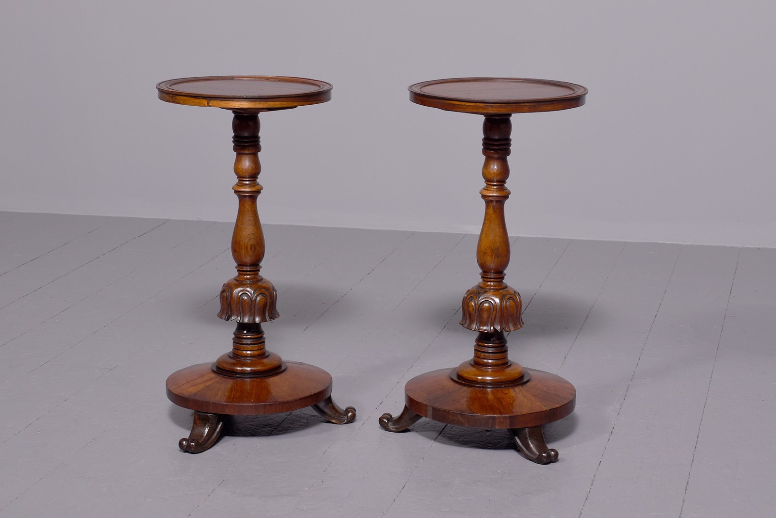Circa 1840. Pair of William IV rosewood wine or occasional tables. The circular tops with turned moulded rims and supported on vasiform-shaped, ring-turned stems over foliate carved curved cup and turned collars over round, slanted crossbanded bases on three neat cabriole feet.