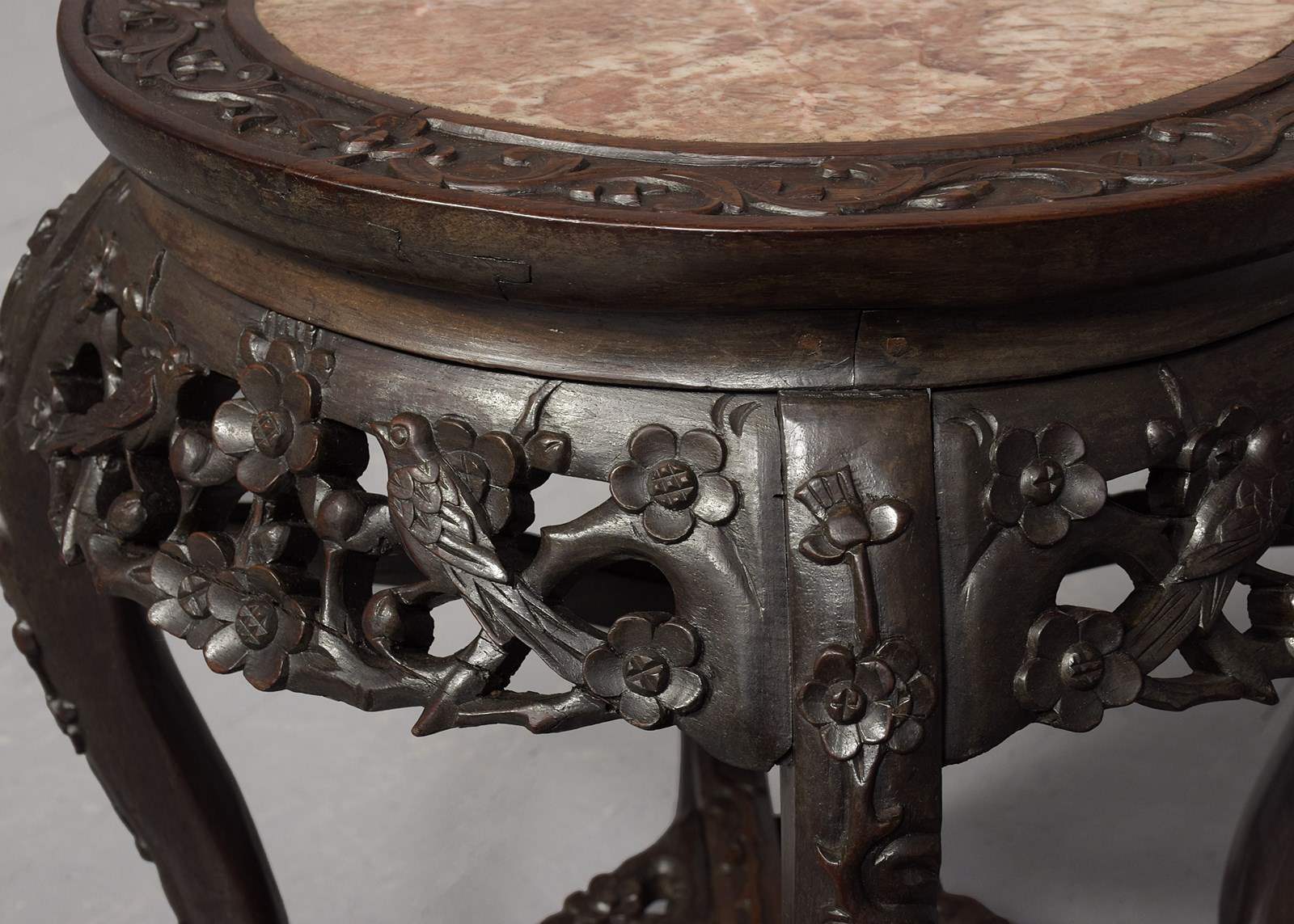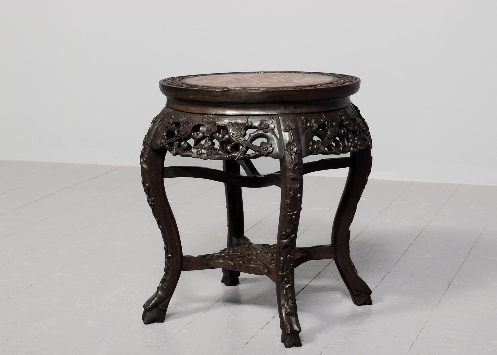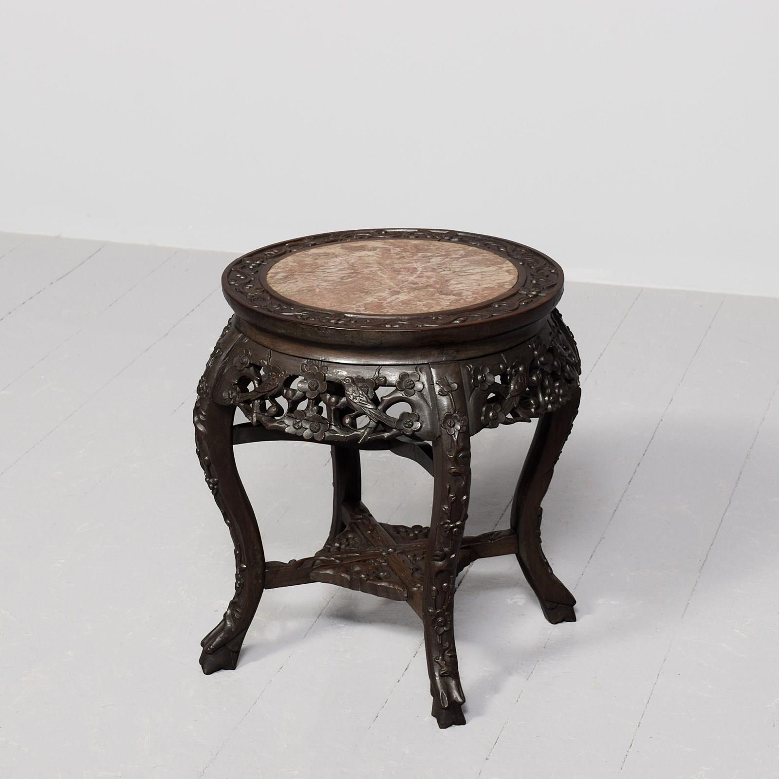 Circa 1890. A Qing Dynasty carved hardwood circular marble top Chinese plant stand, the profusely carved top with an insert pink variegated marble, the shaped, flared and pierced frieze with cherry blossom flowers and birds, all supported on four elegant cabriole legs, which are profusely carved on the facing and legs, braced by cruciform stretchers with a pierced quarter sections forming a small shelf, finishing on a typical primitive Chinese feet.