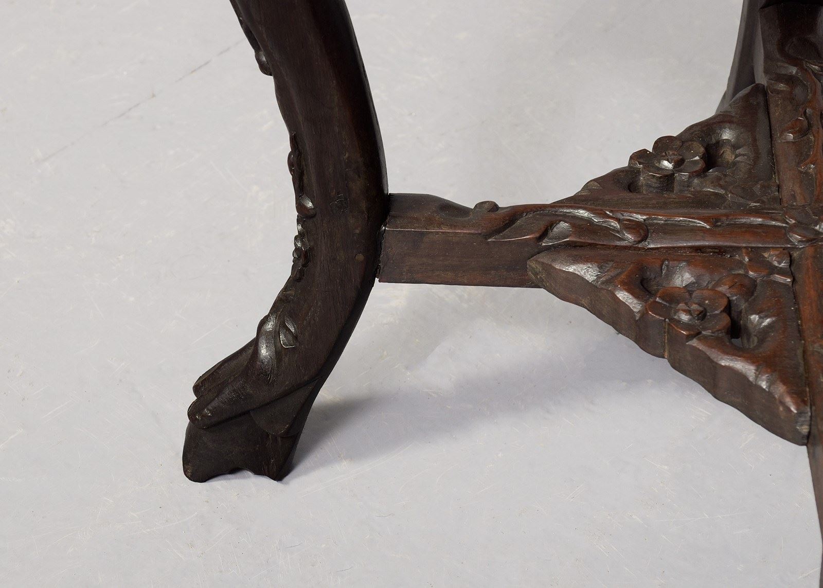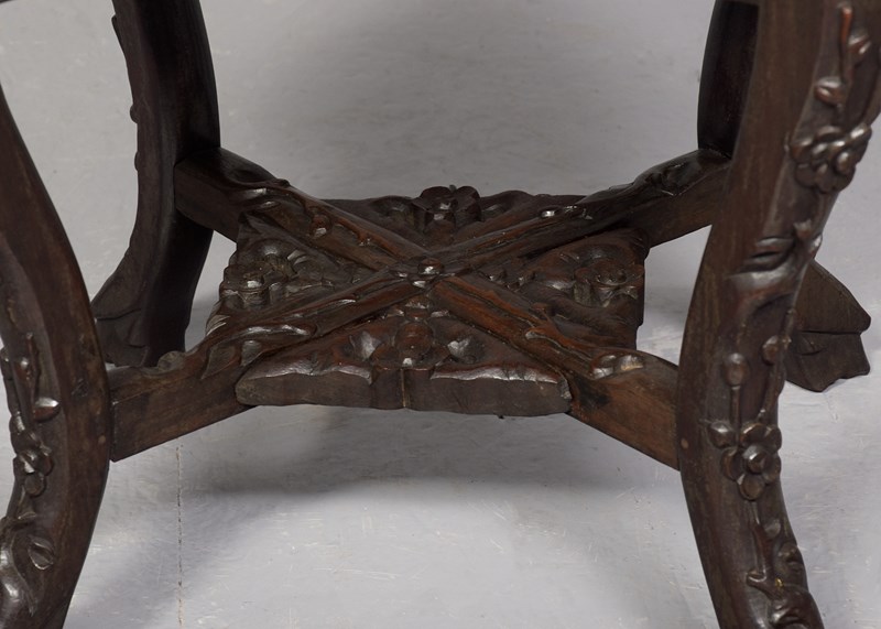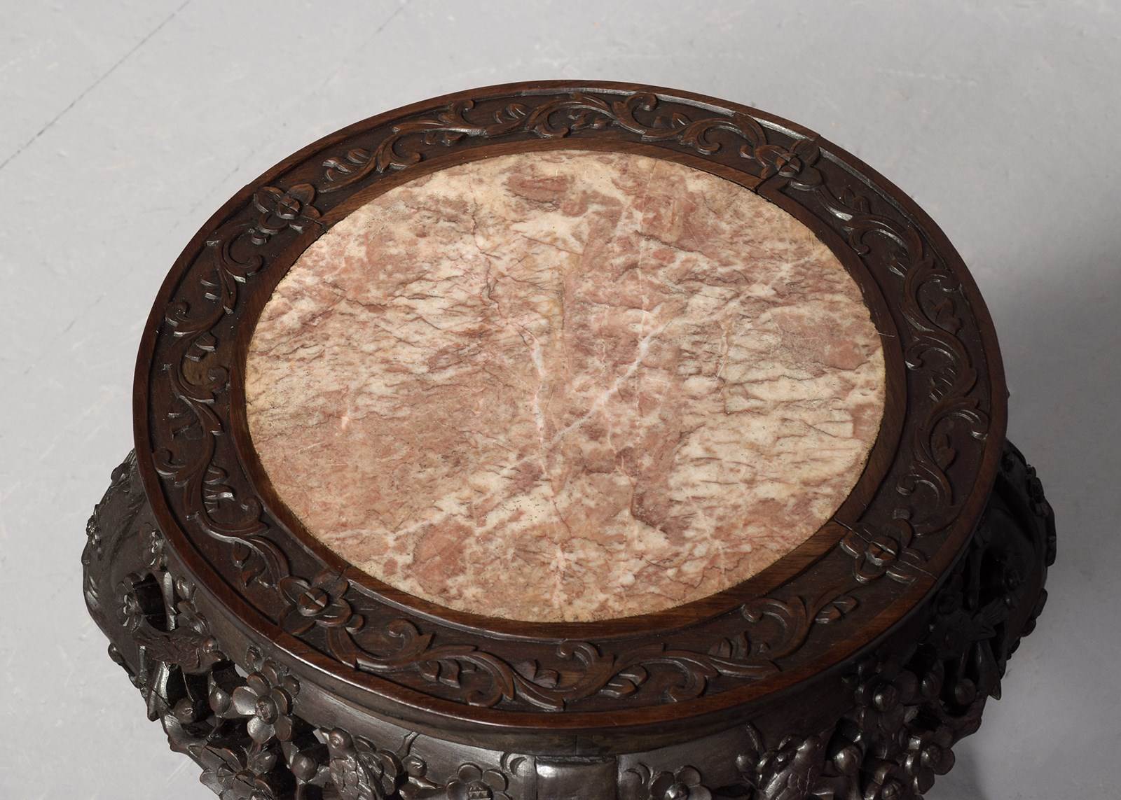 Circa 1890. A Qing Dynasty carved hardwood circular marble top Chinese plant stand, the profusely carved top with an insert pink variegated marble, the shaped, flared and pierced frieze with cherry blossom flowers and birds, all supported on four elegant cabriole legs, which are profusely carved on the facing and legs, braced by cruciform stretchers with a pierced quarter sections forming a small shelf, finishing on a typical primitive Chinese feet.