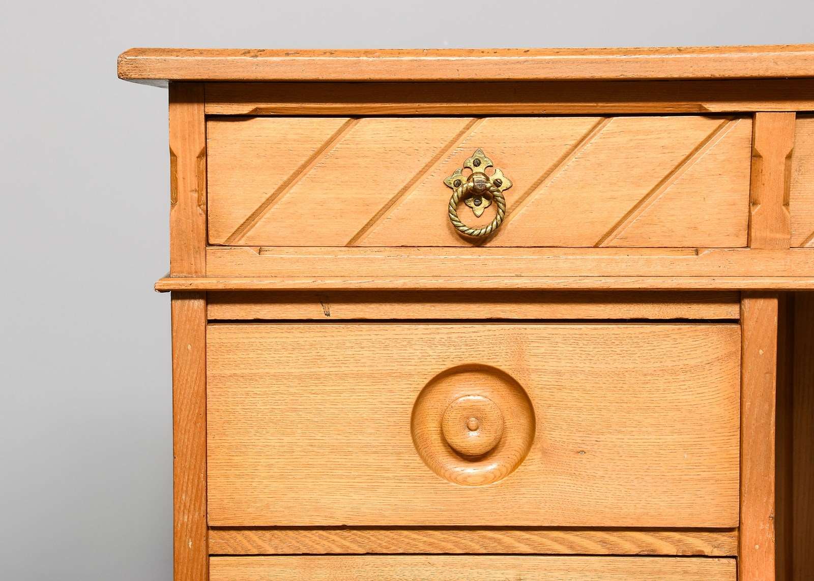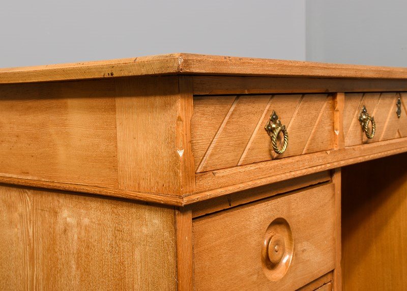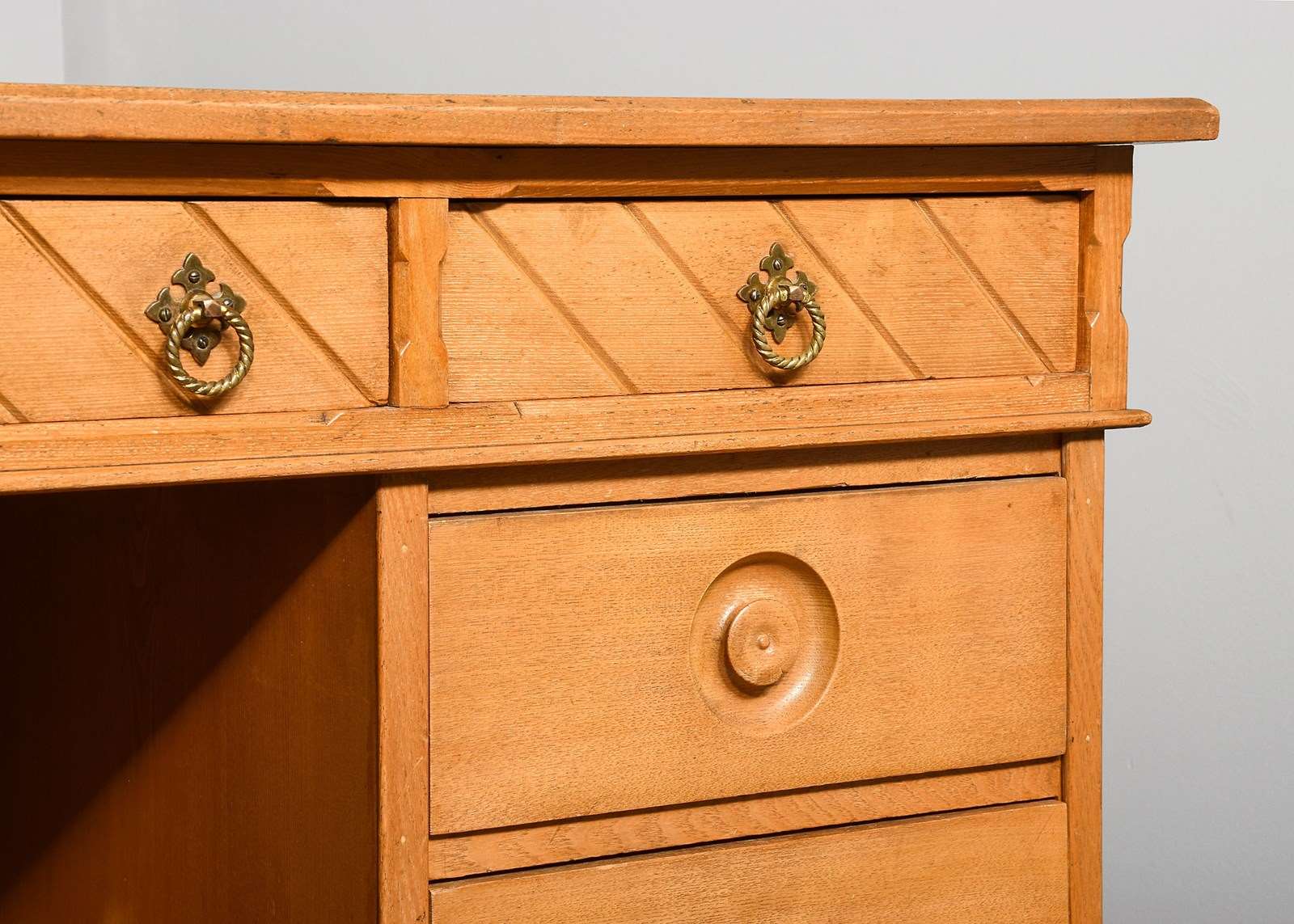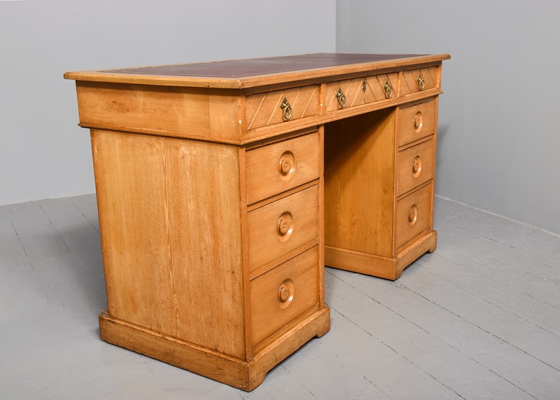 Circa 1880. Quality ash Arts and Crafts style knee hole writing desk in the manner of Charles Bevan. The rectangular top with gilt-tooled burgundy leather writing surface above three frieze drawers with Arts and Crafts diagonal grooving and original gilded brass handles, supported on two banks of graduated drawers with unusual inset turned handles, and drawer linings in solid ash (sign of quality Scottish cabinetmaking). In excellent condition.