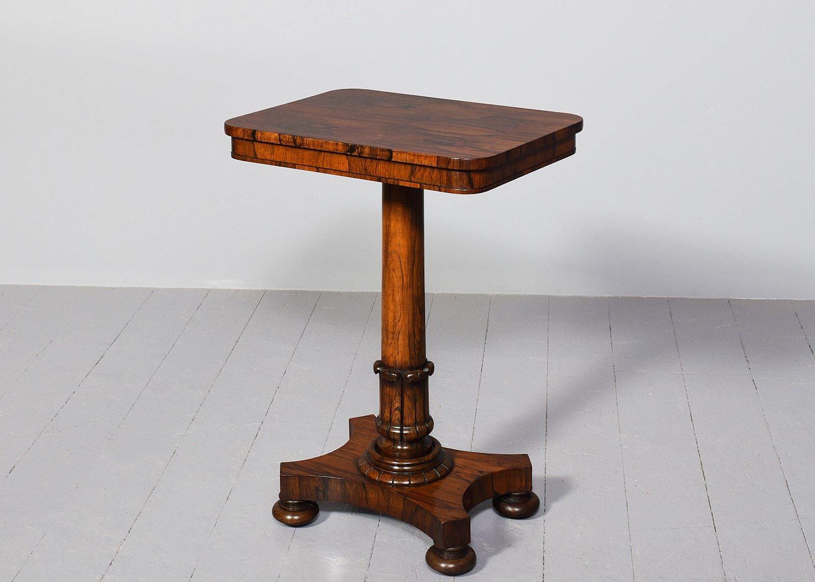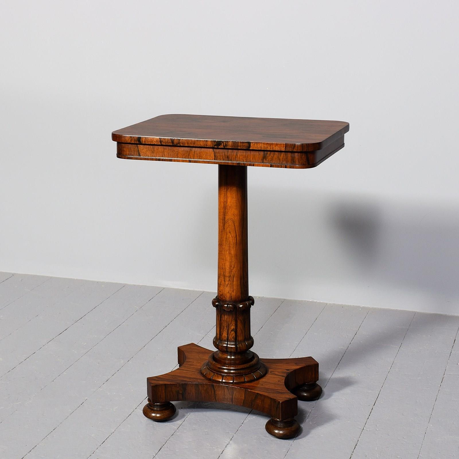 Circa 1825. An exhibition-quality George IV rosewood occasional table, the rectangular top in book-matched vibrant rosewood, with rounded corners and a simple fore-edge and frieze, supported on a cannon barrel stem with overlapping foliate carving and a carved collar, resting on a concave quad partite platform base with four squat bun feet with original brass concealed castors.
