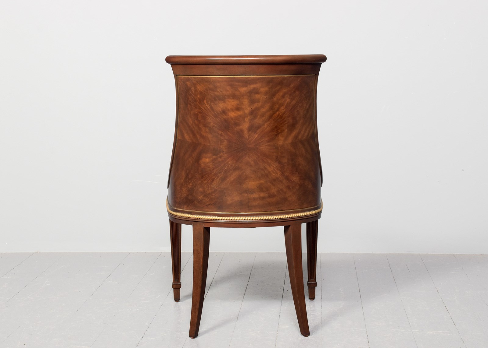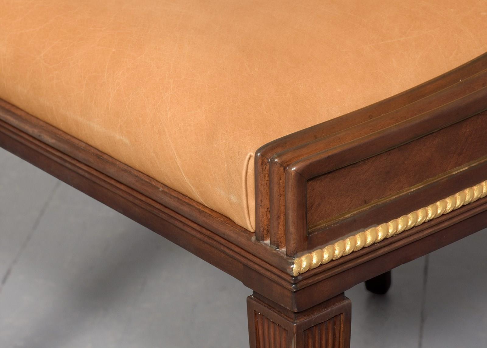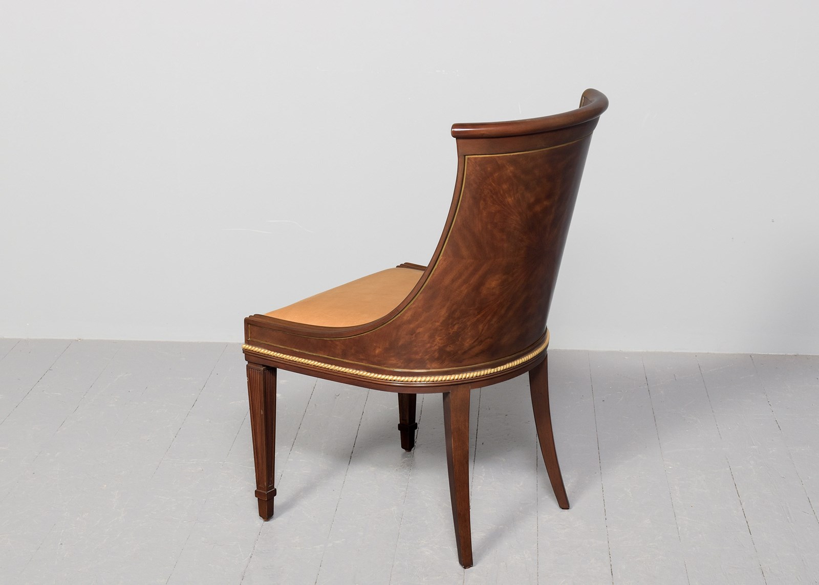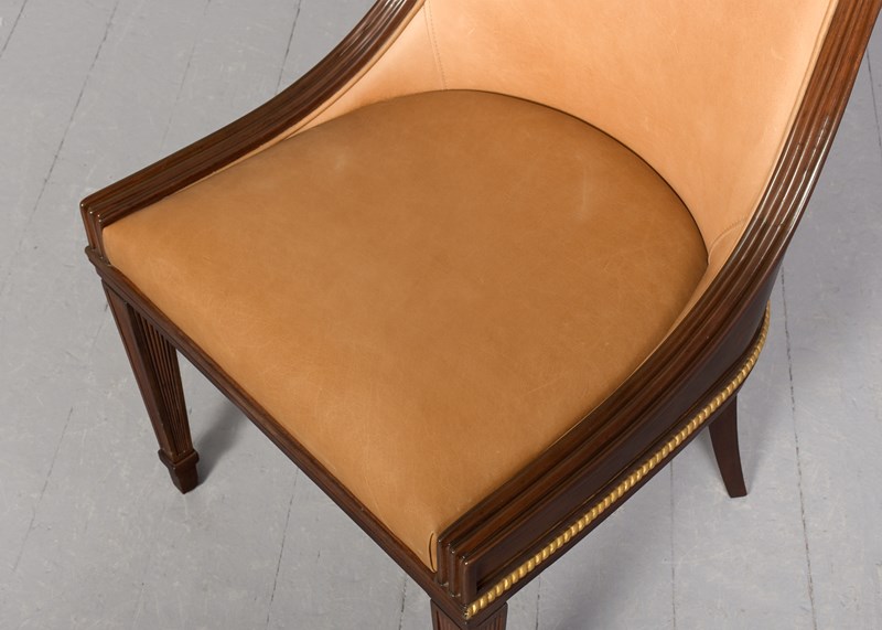 Circa 1990's. A very stylish leather upholstered and mahogany chair by 'Brights of Nettlebed', with curved shaped top rail, the back and seat upholstered in piped leather, the fore-edges are ribbed from top to bottom, the back in Quarter matched flame mahogany, beneath the seat there is a gilded beaded rail which follows the form of the chair, back legs are square tapering and out swept, the front legs are square with beaded edges, finishing on extended spayed toes