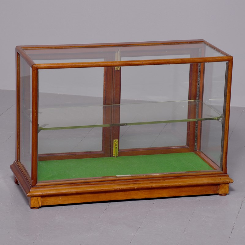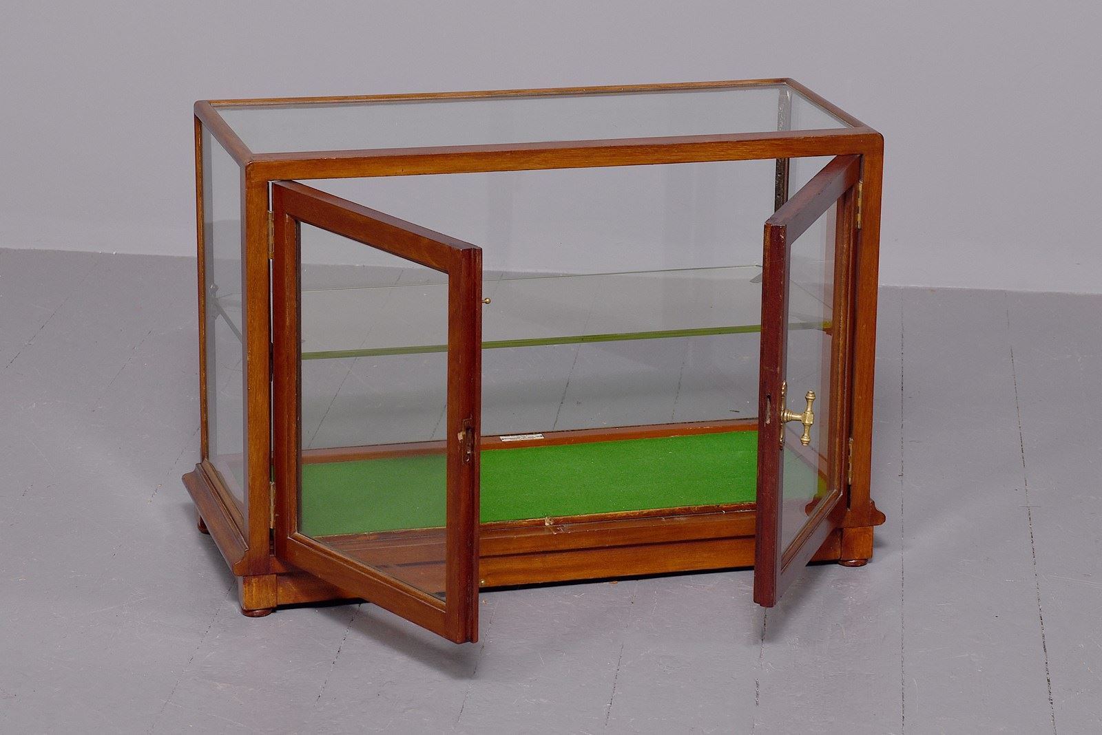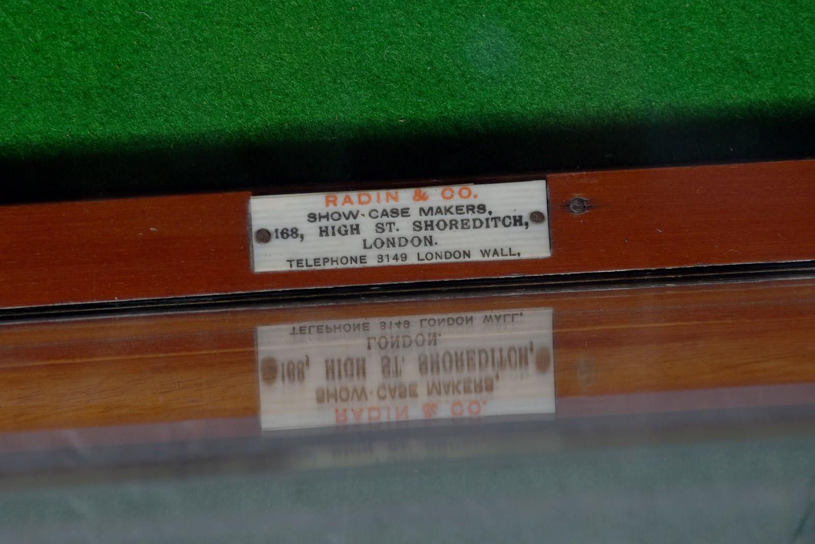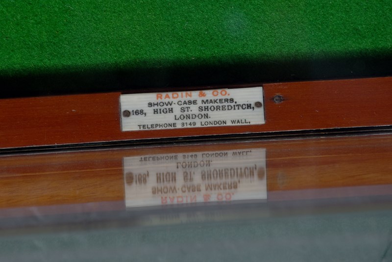 Circa 1900. Quality mahogany table-top display case, by Radin & Co., London. With a glazed top and sides, the back with doors and brass handle, fitted with a single glass shelf above a green baize-lined base, on moulded base raised on short feet, with an ivorine trade label Radin & Co., Showcase Makers, 168 High St. Shoreditch, London.
