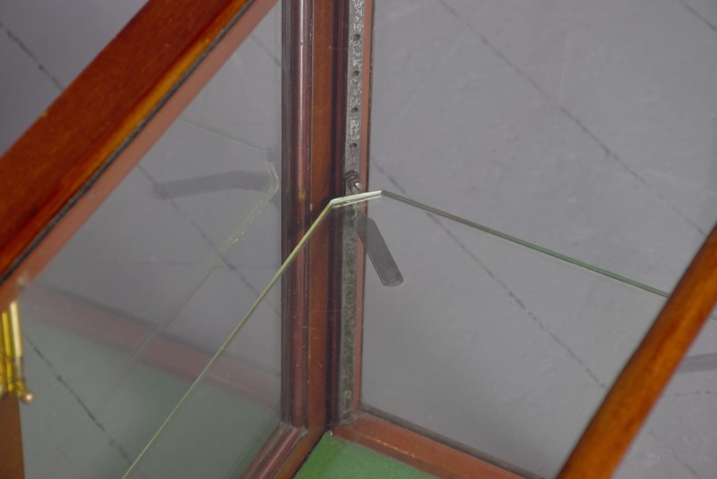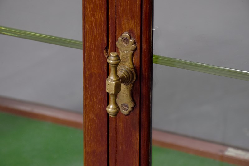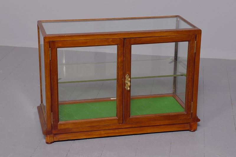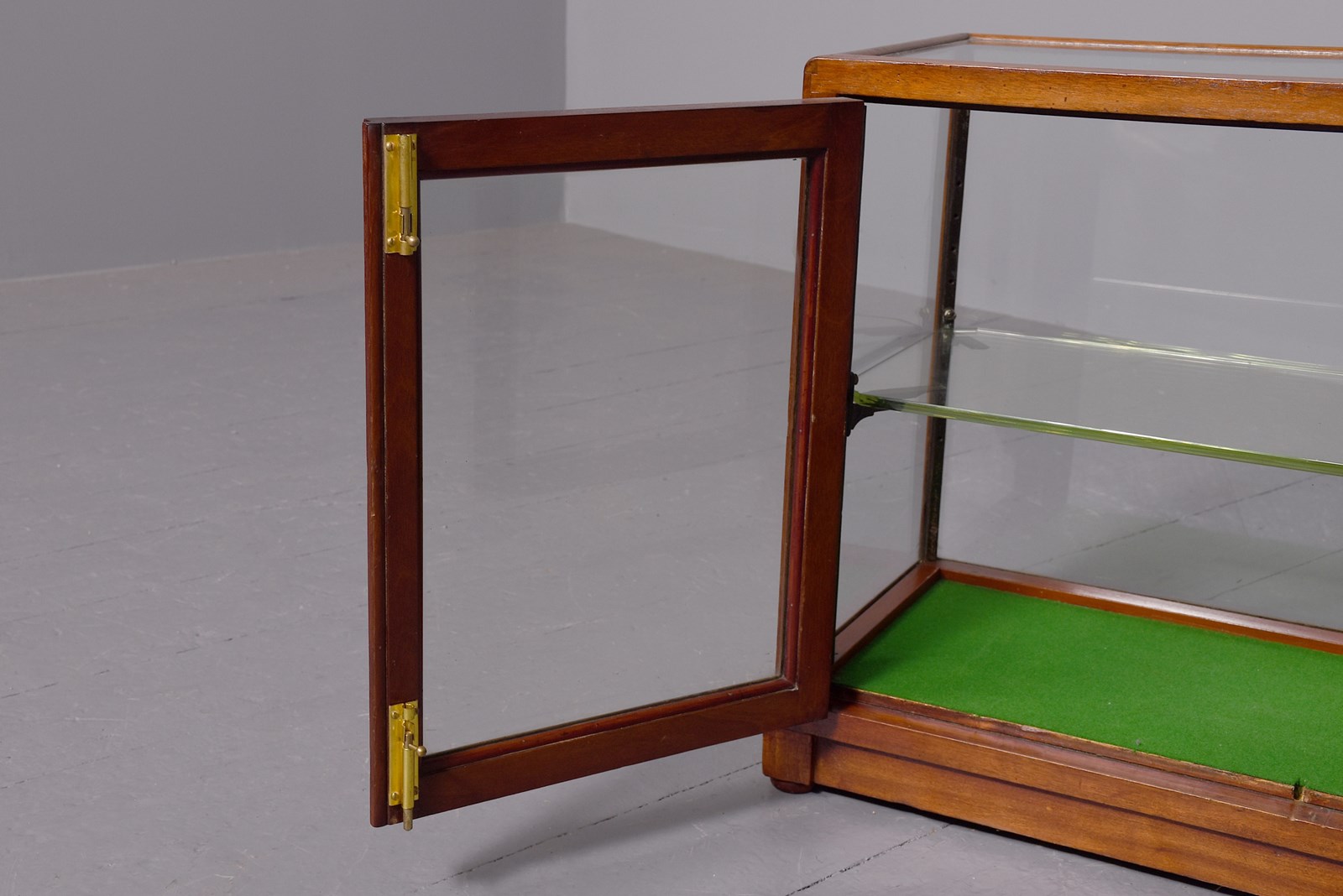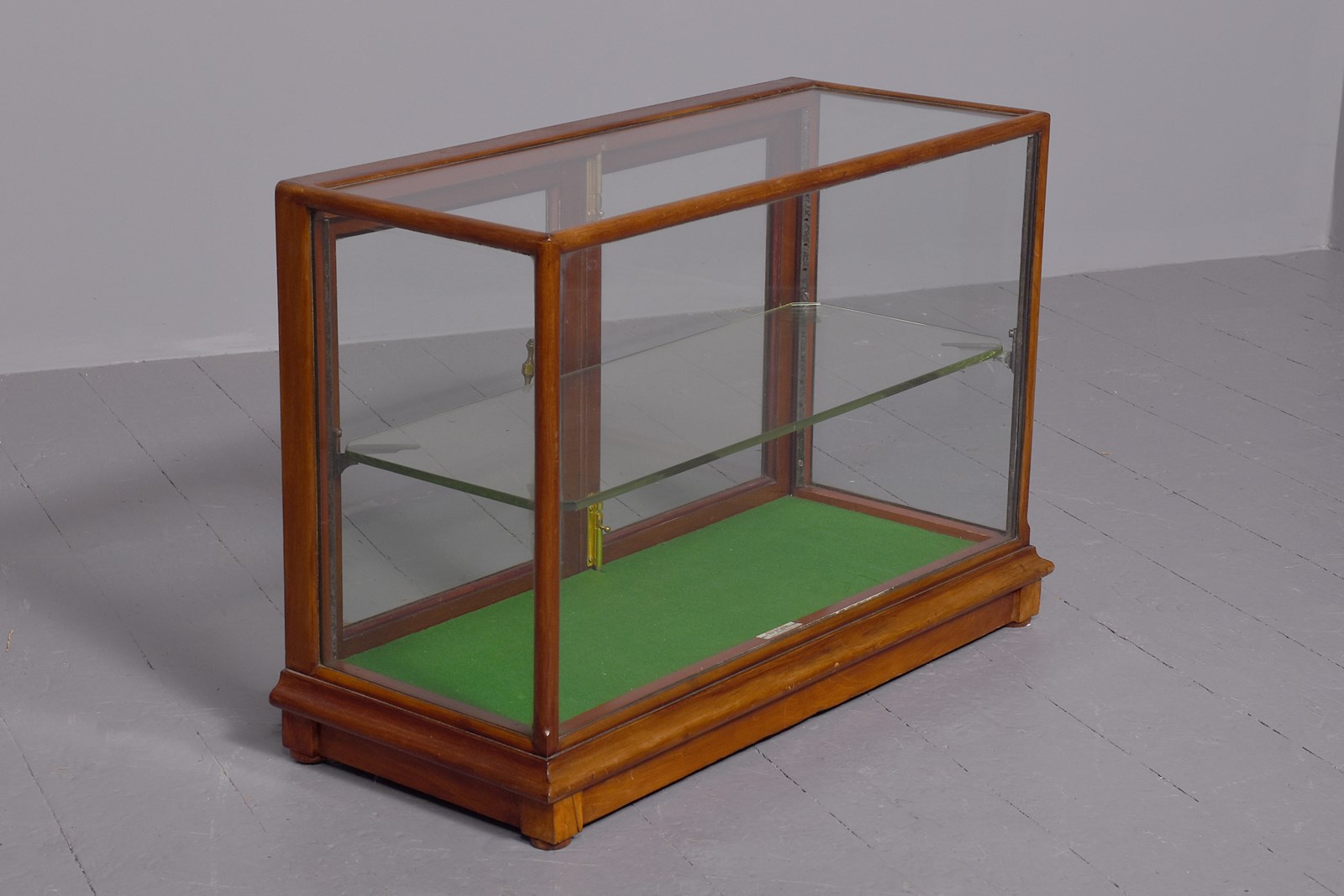Circa 1900. Quality mahogany table-top display case, by Radin & Co., London. With a glazed top and sides, the back with doors and brass handle, fitted with a single glass shelf above a green baize-lined base, on moulded base raised on short feet, with an ivorine trade label Radin & Co., Showcase Makers, 168 High St. Shoreditch, London.