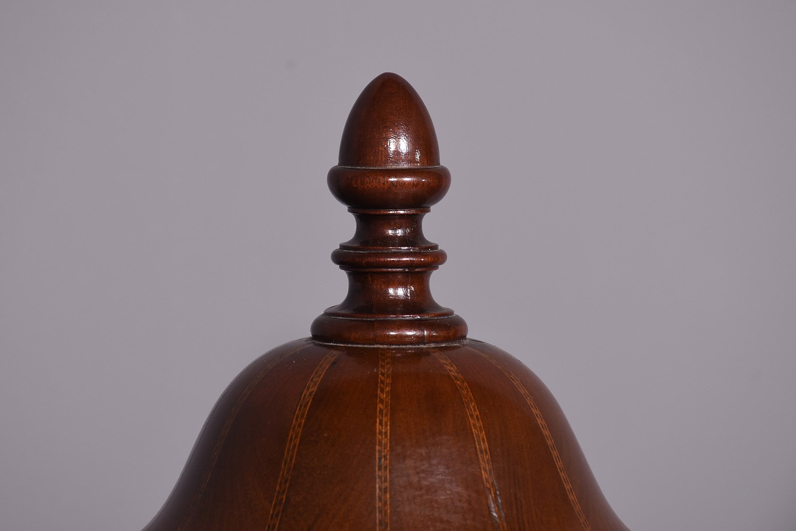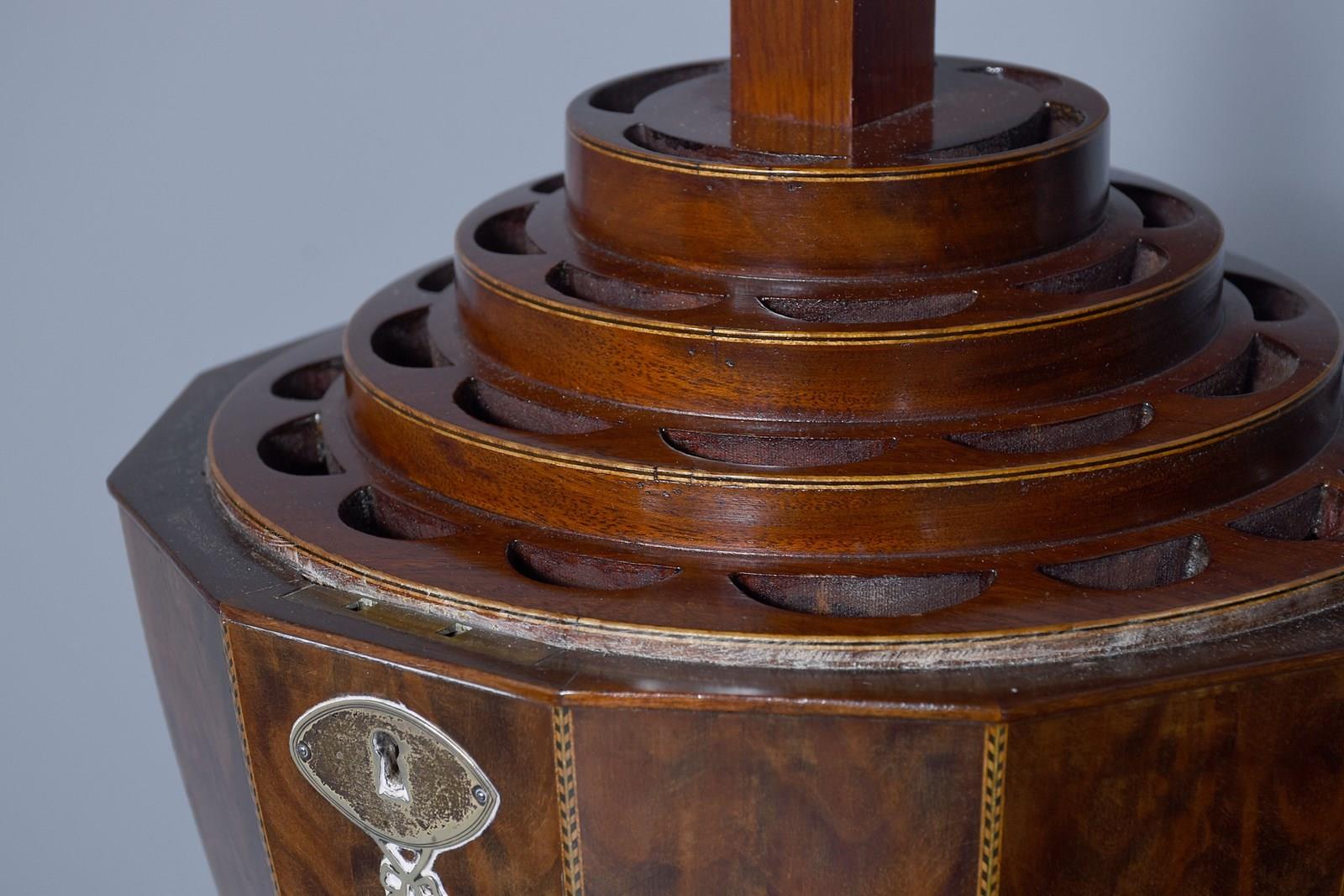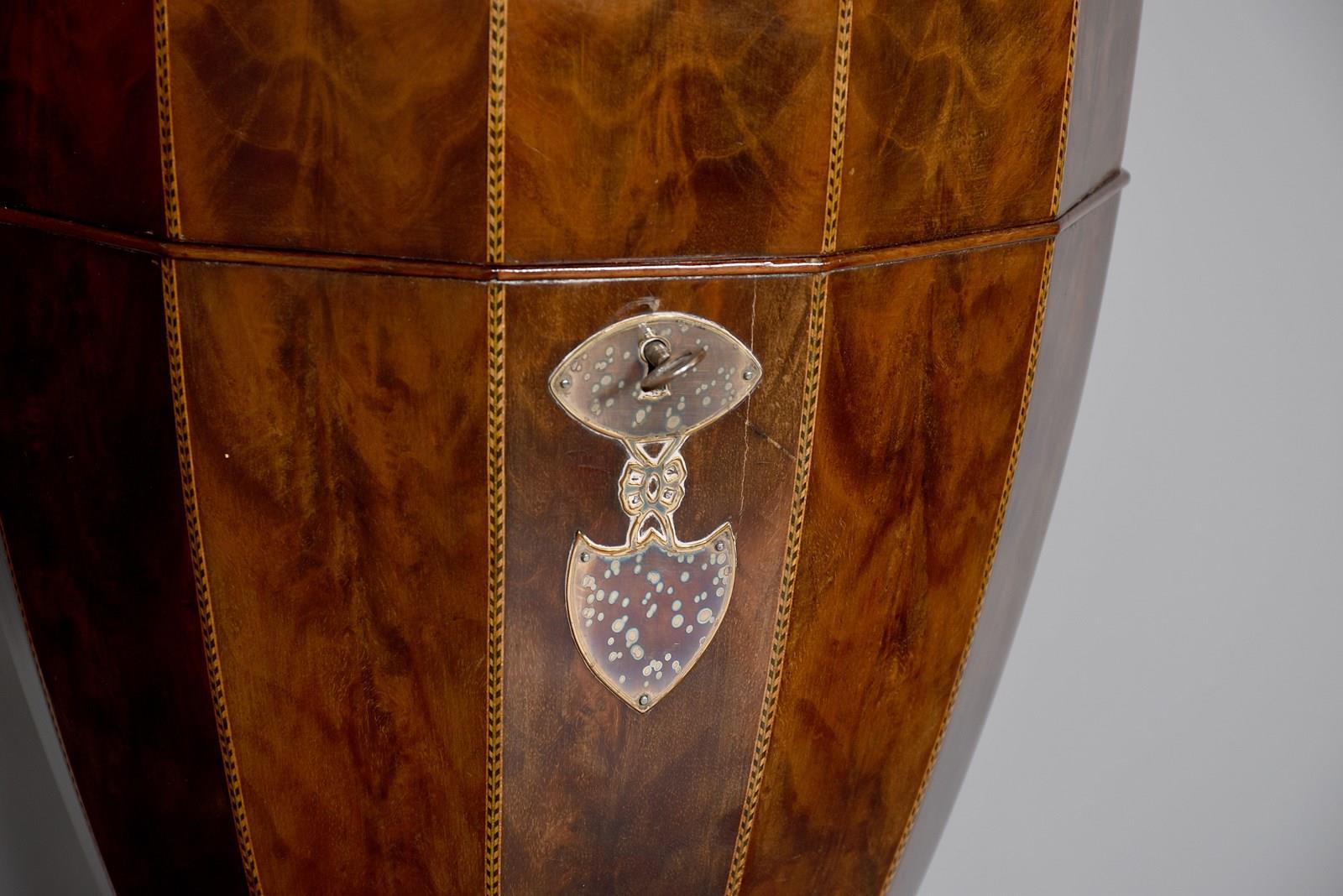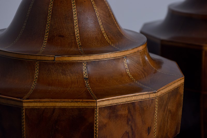 Circa 1890.A pair of George III style mahogany and inlaid and sliver mounted urn shaped cutlery stands, each surmounted by a stylish finial, the lids with chequered chevron inlay with curvaceous concave sections, the deep shaped lid with a central upright on the inside, open to a stepped and fitted interior with four tiers, fitted out for different shapes of cutlery, the front with a double escutcheon, in white metal or silver, the tapering body with similar inlay as the top, with a large circular foot resting on a square inlayed platform base, all supported on four squat ogee bracket feet. Fantastic colour and patination and great style.