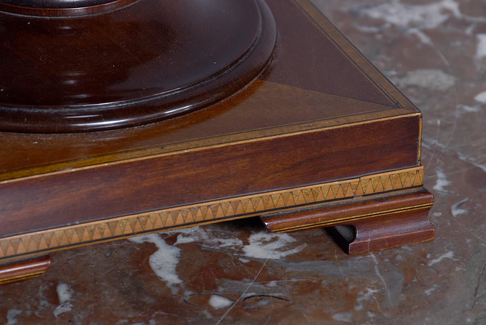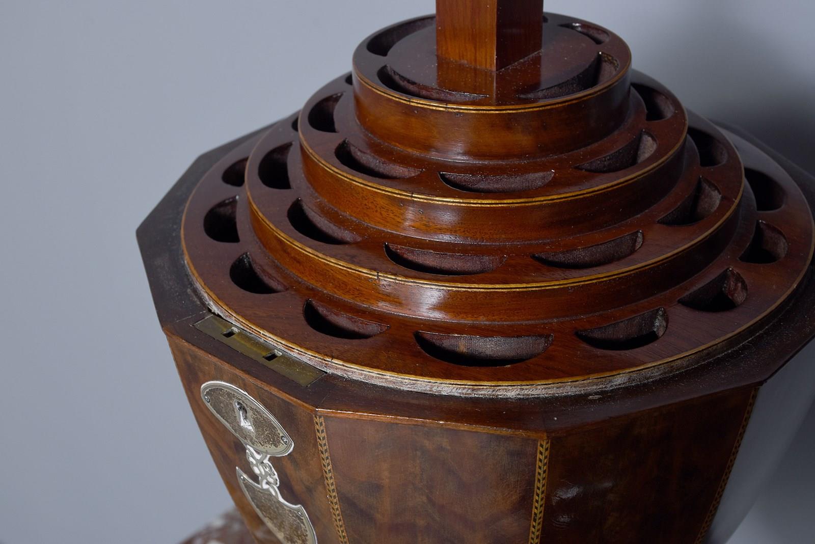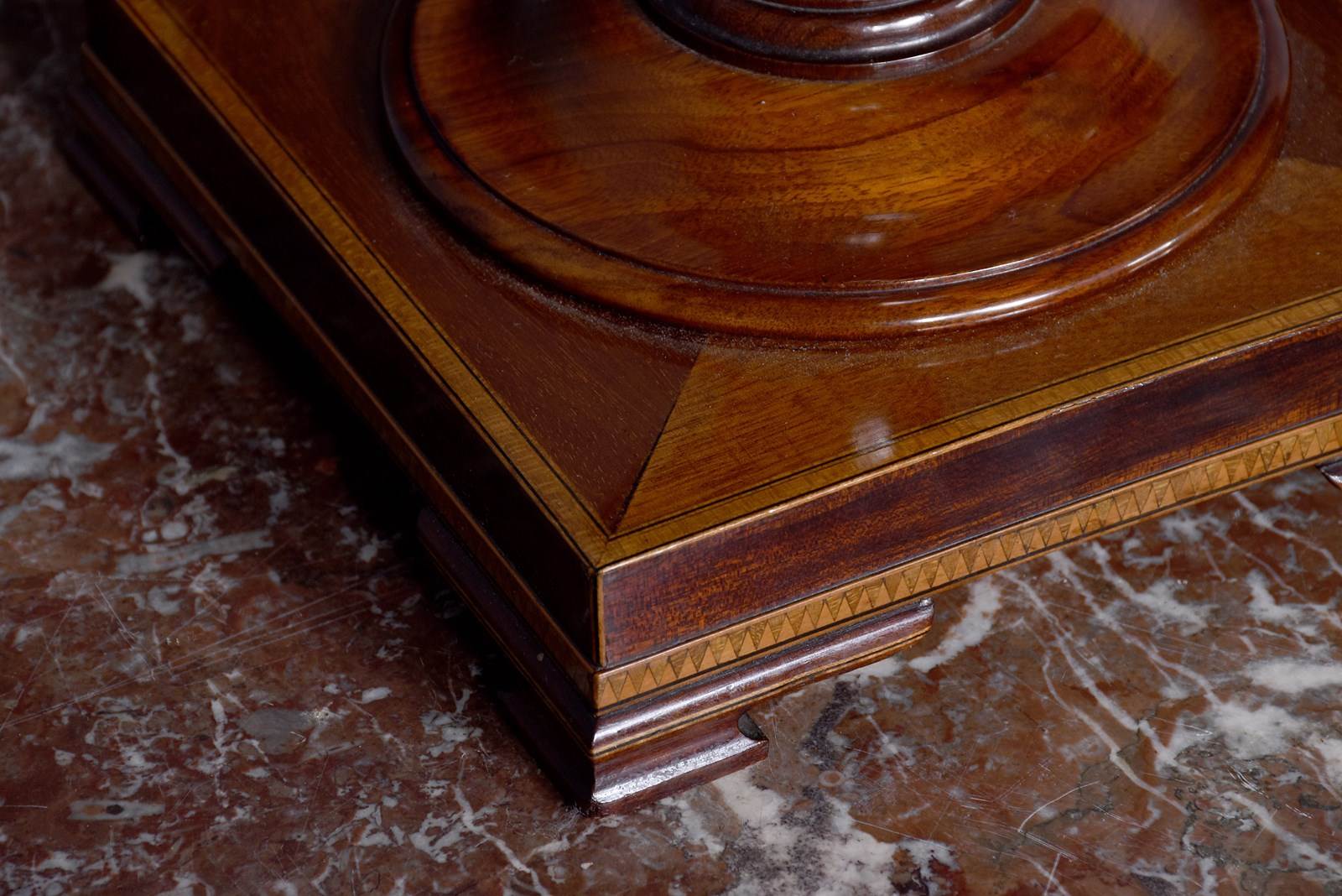 Circa 1890.A pair of George III style mahogany and inlaid and sliver mounted urn shaped cutlery stands, each surmounted by a stylish finial, the lids with chequered chevron inlay with curvaceous concave sections, the deep shaped lid with a central upright on the inside, open to a stepped and fitted interior with four tiers, fitted out for different shapes of cutlery, the front with a double escutcheon, in white metal or silver, the tapering body with similar inlay as the top, with a large circular foot resting on a square inlayed platform base, all supported on four squat ogee bracket feet. Fantastic colour and patination and great style.