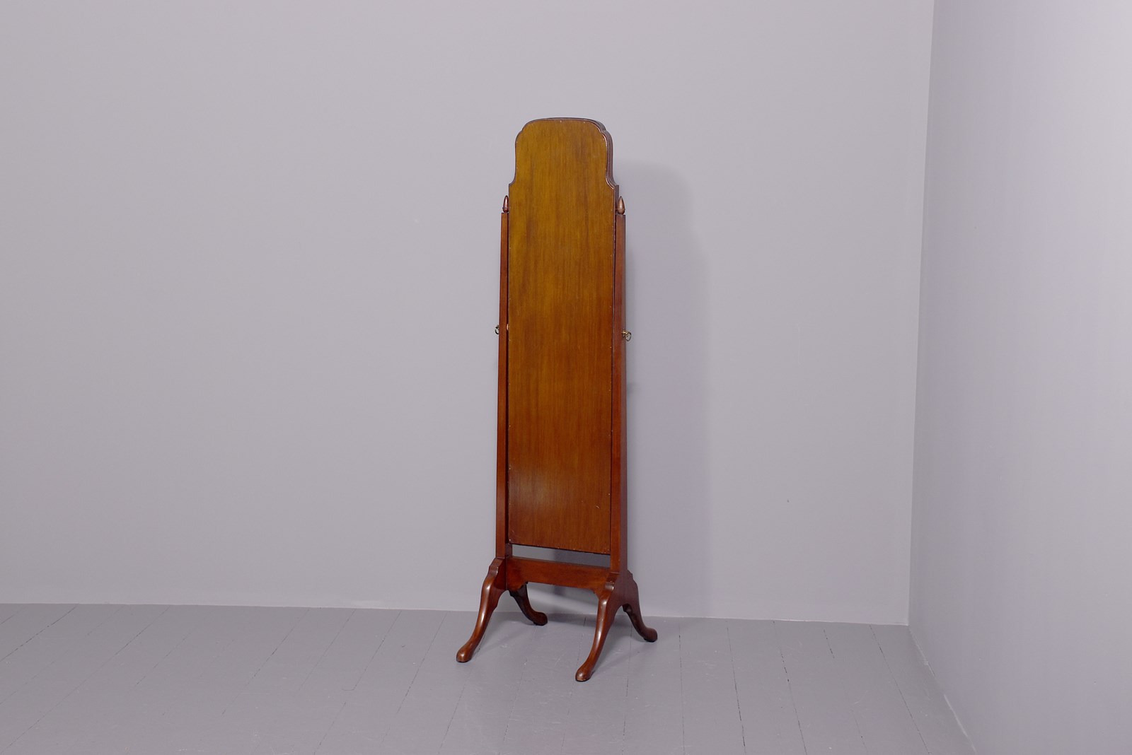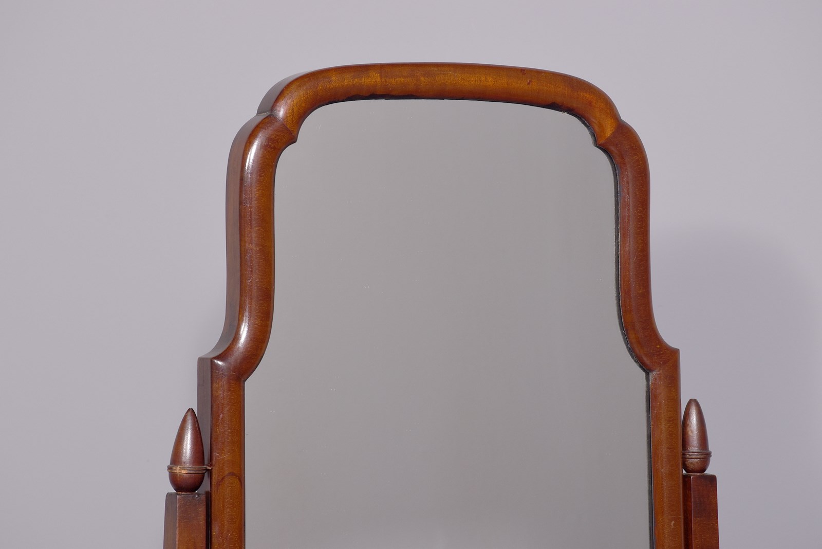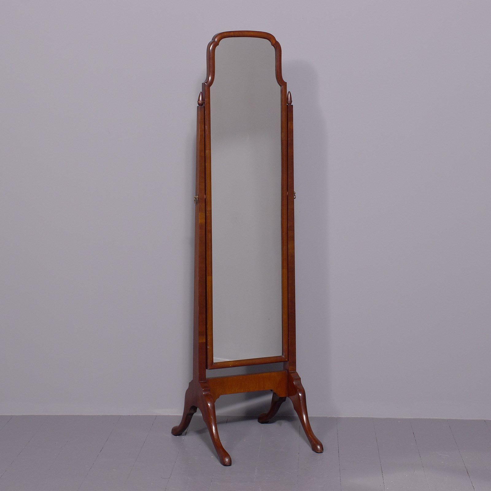 Circa 1920 Quality Queen Anne style neat-sized mahogany cheval mirror in Spanish mahogany. The tall rectangular mirror with a shaped top and its mirror plate in perfect condition within moulded flame mahogany frame. On square tapering supports with acorn finials and brass axe head handles over a shaped stretcher and supported cabriole legs with pad feet