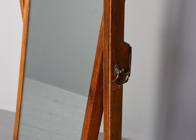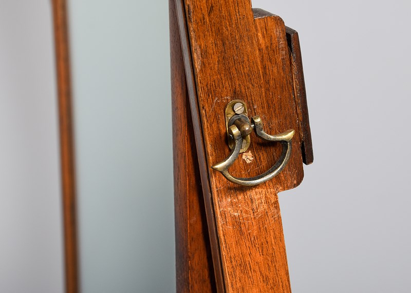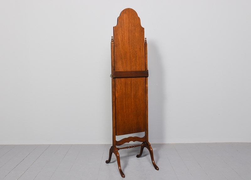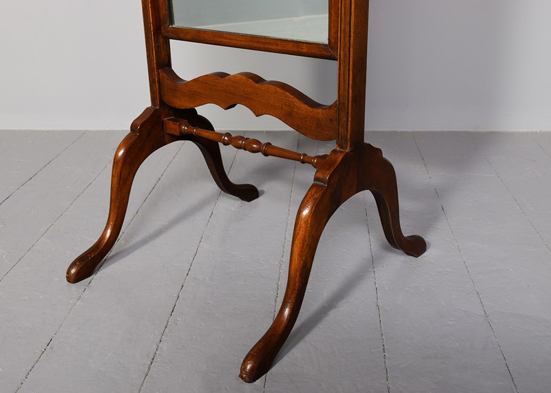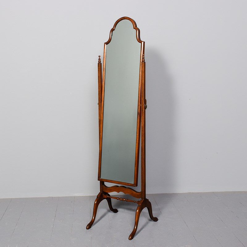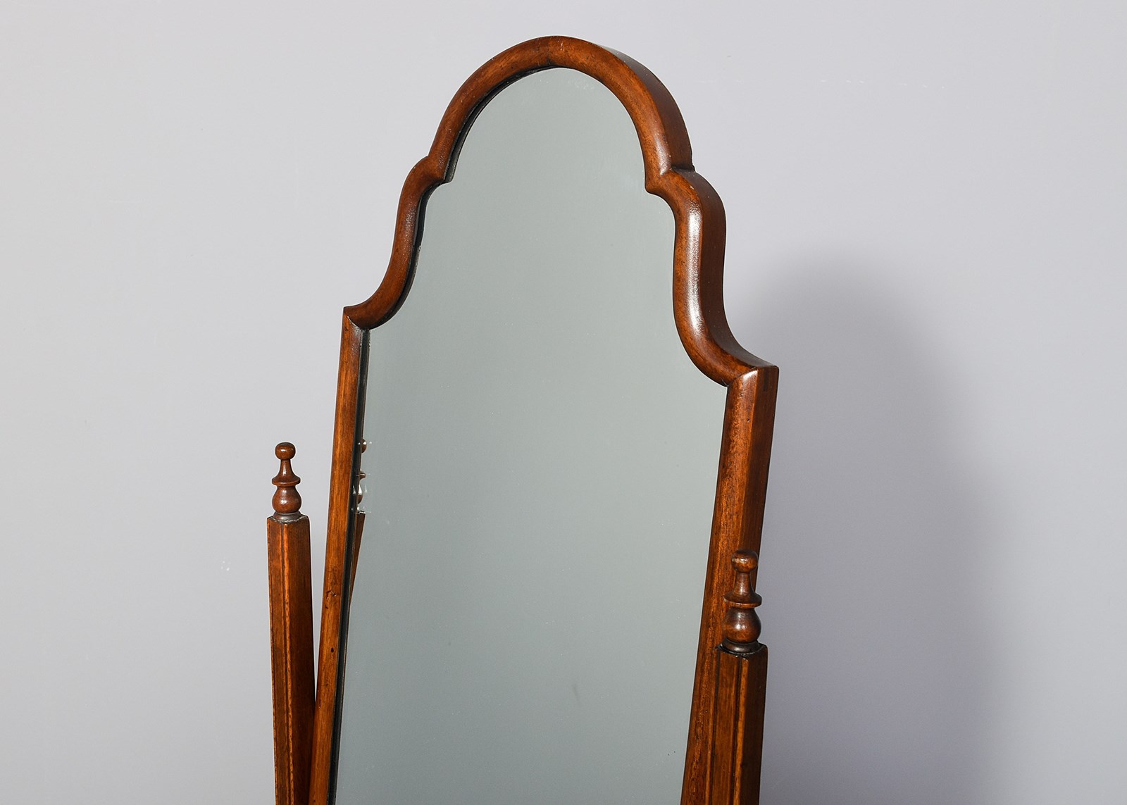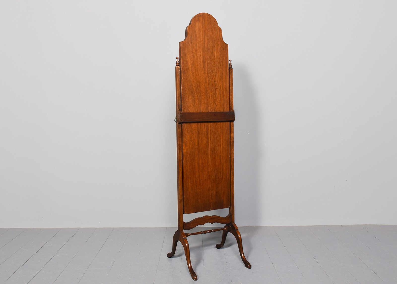 Circa 1930s. Mahogany framed Queen Anne style cheval mirror, the framed mirror with a simple frame with stylish arched top, supported on uprights with reeding on the facing, surmounted by elegant finials, with cast brass axe heads for adjusting the mirror, the base with a shaped and wavy stretcher with turned stretcher beneath bracing the two uprights, resting on four splayed cabriole legs finishing with an extended foot.