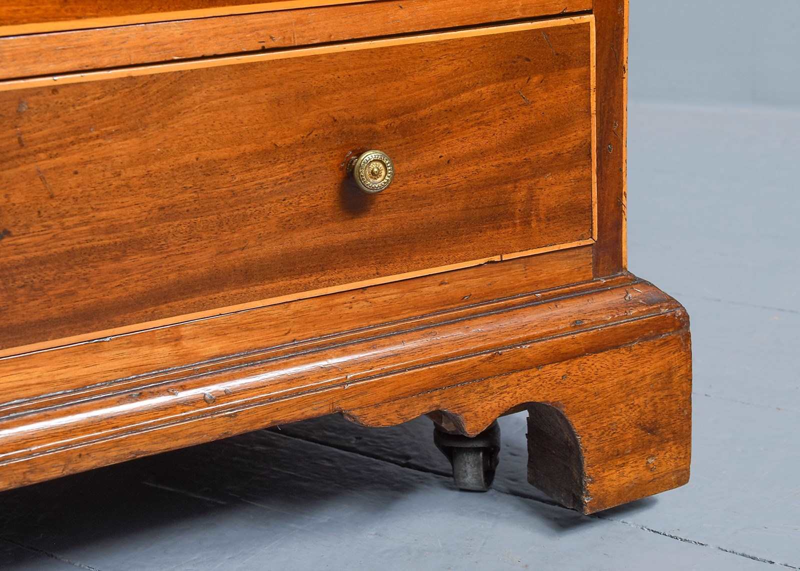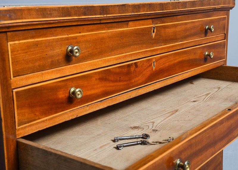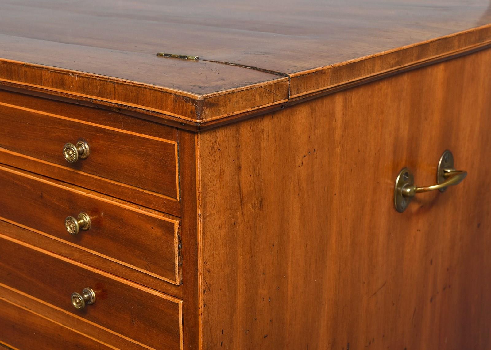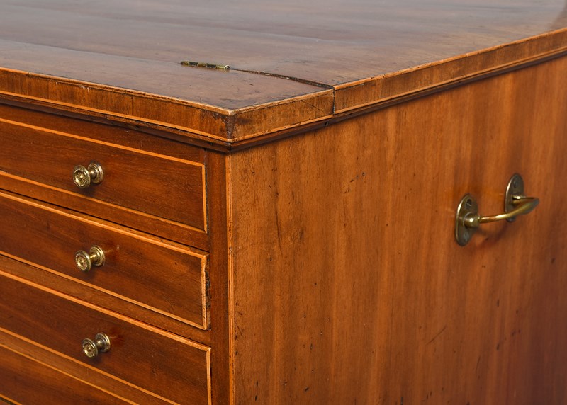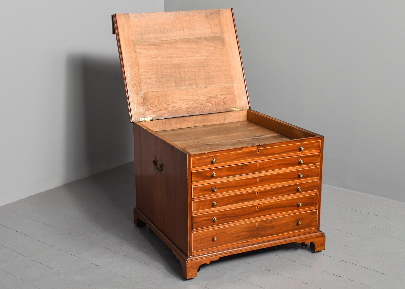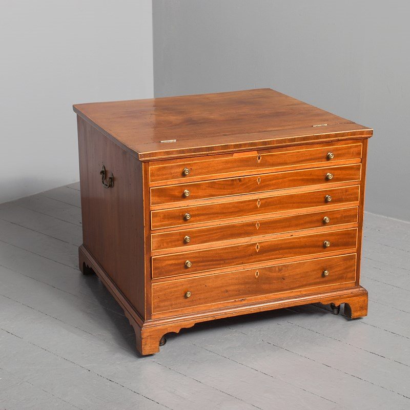 Circa 1790. A rare George III mahogany and inlaid floor standing folio cabinet, the hinged oak top veneered in flame mahogany with a folding section to the front, with boxwood fore-edge banding, the front with a faux drawer on the top with five full-sized graduating drawers beneath, each with a pair of cast brass handles and diamond shaped boxwood escutcheons, beneath the bottom drawer there is a stylish ogee moulding and the piece rests on 4 four stylish bracket feet with castors behind for ease of movement, the sides with a pair of cast brass swan neck lifting handles.