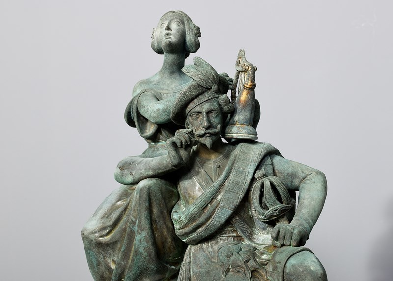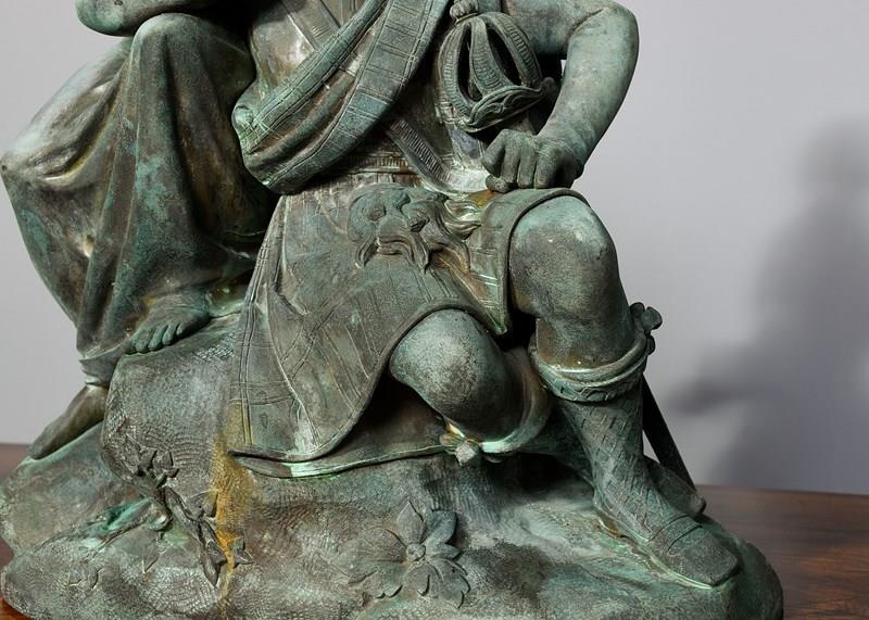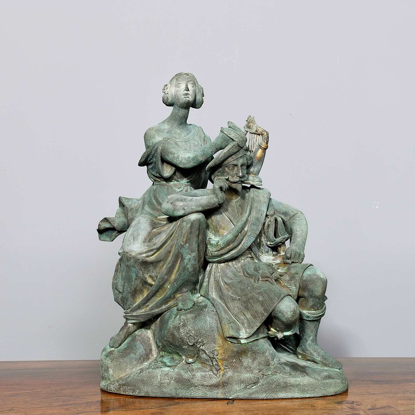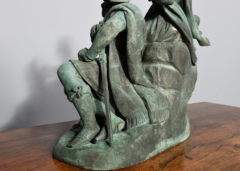 Circa 1880. Rare large bronze figure of a seated Highland chief and a muse playing him a musical instrument, all in a rustic setting. Substantial (weighs 14.9kg!) quality item