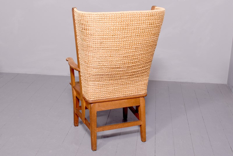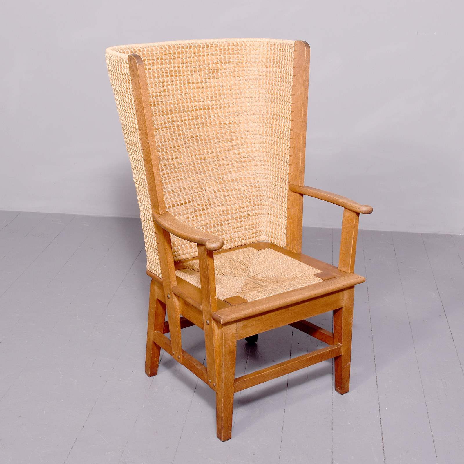 Circa 1960. Rare, outsized mahogany framed Orkney chair in perfect condition. Handmade in Orkney with classically woven oaten straw and marram grass bindings, with a lift out rattan seat. The arms with the classic Kirkness scrolled ends all on square supports with stretchers