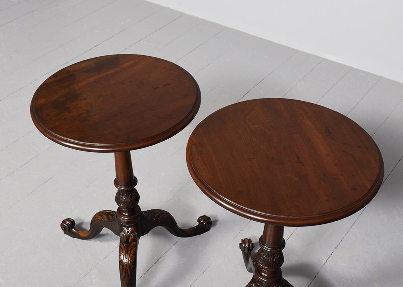 Circa 1860 (with restorations). Rare pair of 19th Century, George 3rd style mahogany occasional tables. The circular tops with moulded edges with a nice colour and degree of wear supported on tapering ring turned stems with acanthus carved bases over three cabriole legs with acanthus carved knees and scrolled toes. Provenance: these were “select items from the estate of the late Lady Penn and Sir Athur Penn, sold by Puttick and Simpson, December 1932 for £4-14s-06d the pair. Puttick and Simpson was a famous London auction house.