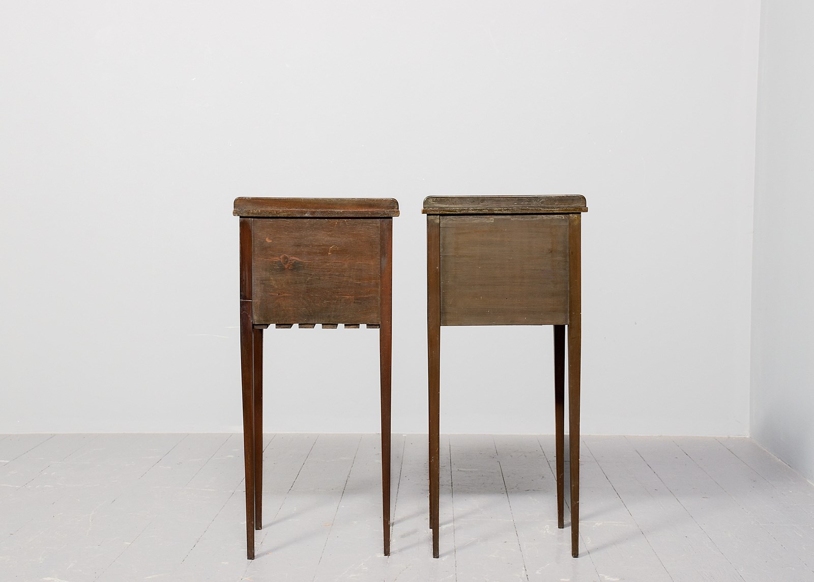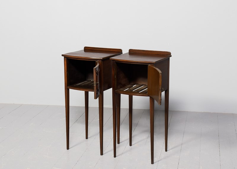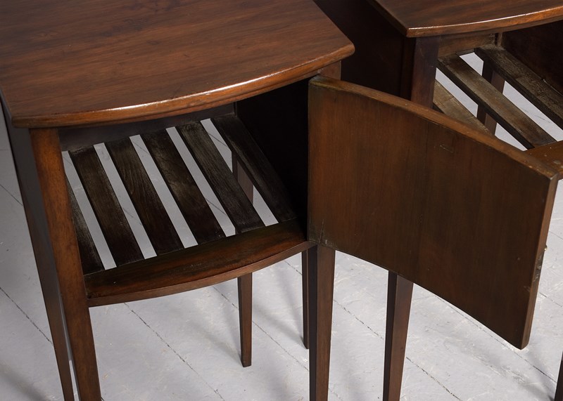 Circa 1880. Pair of Georgian-style mahogany bow-front lockers. The bow front tops in figured mahogany over single, panelled doors with roundel decorations and brass axe-head handles opening to the characteristic slatted interiors. All supported on square tapering legs.
