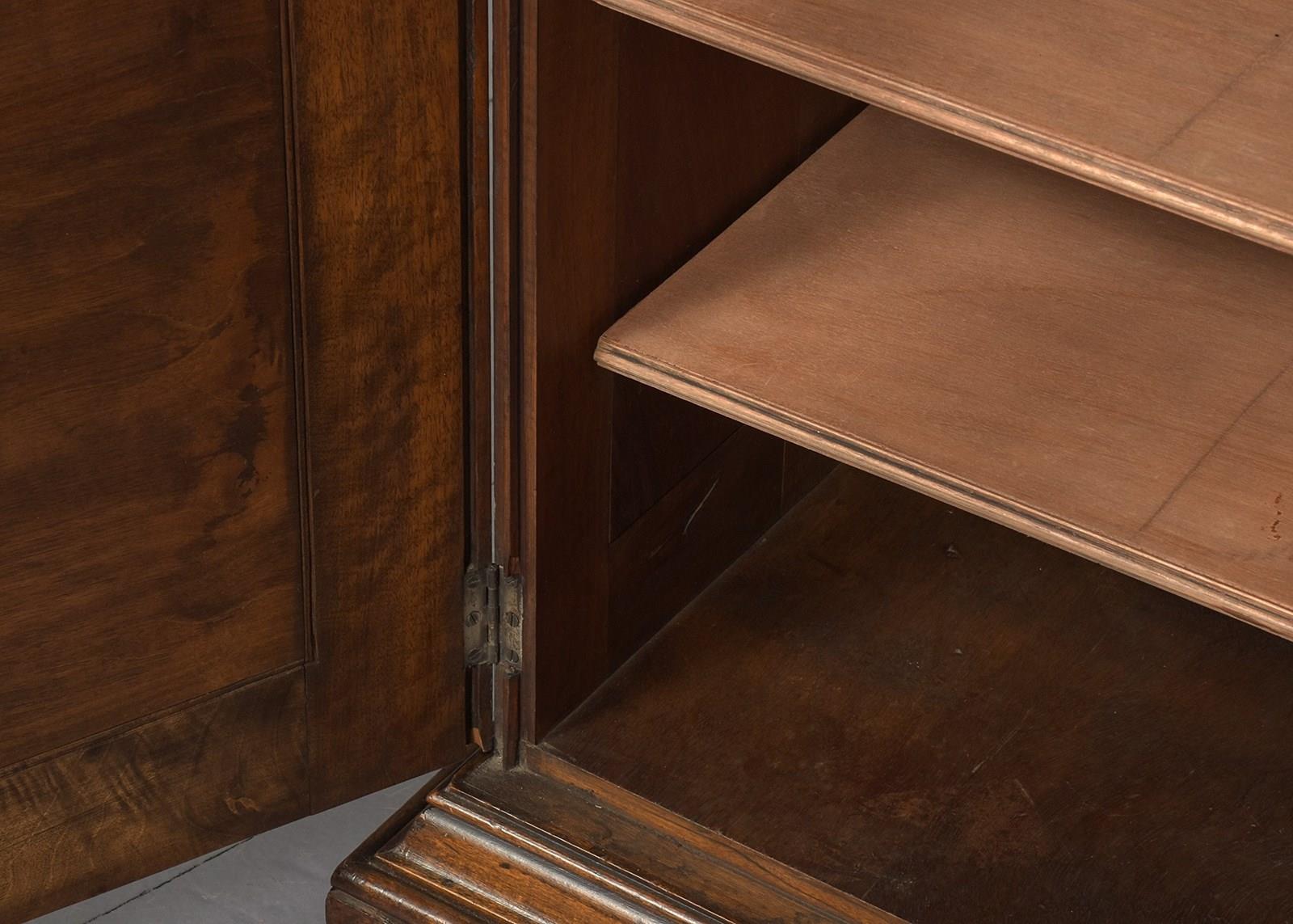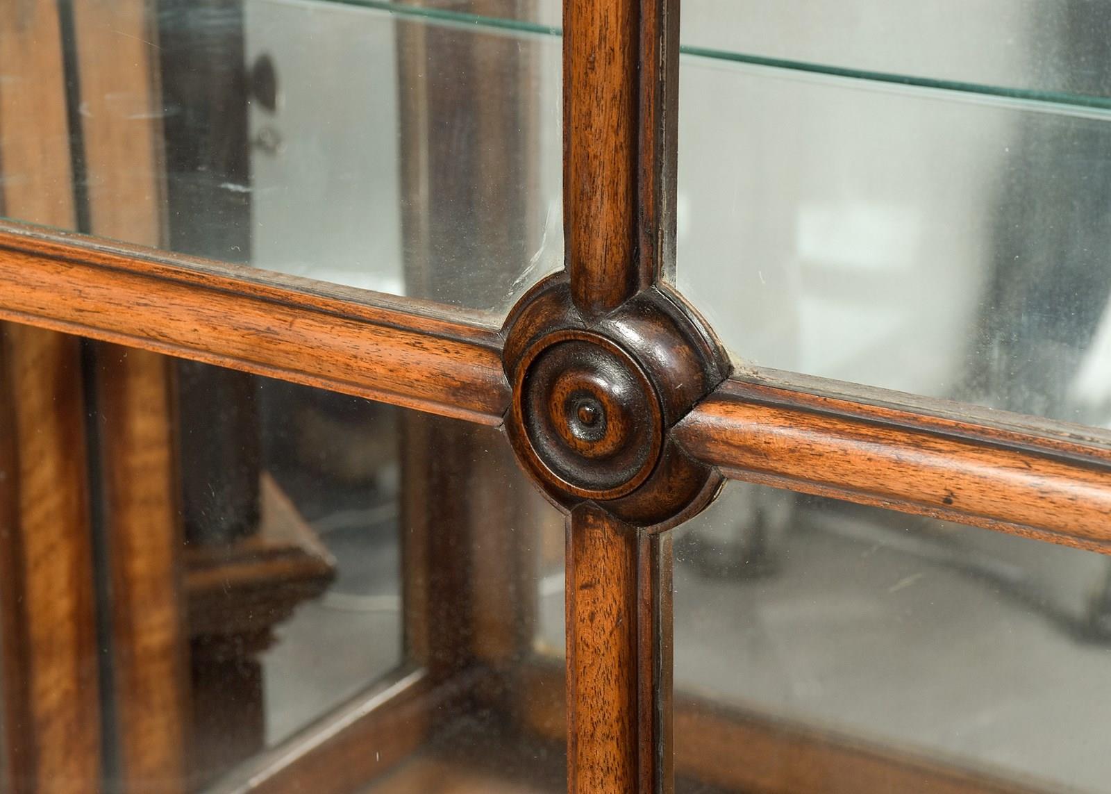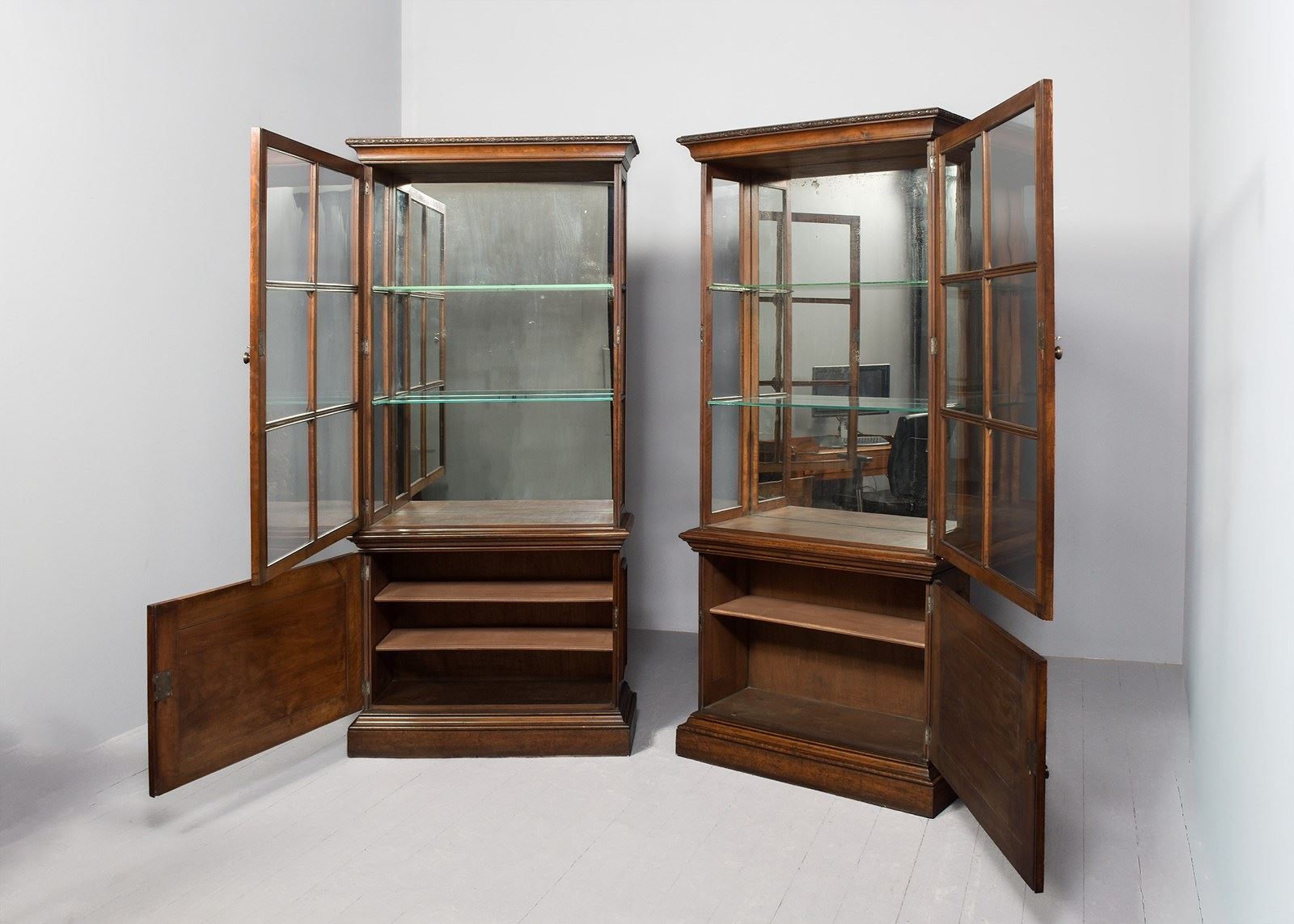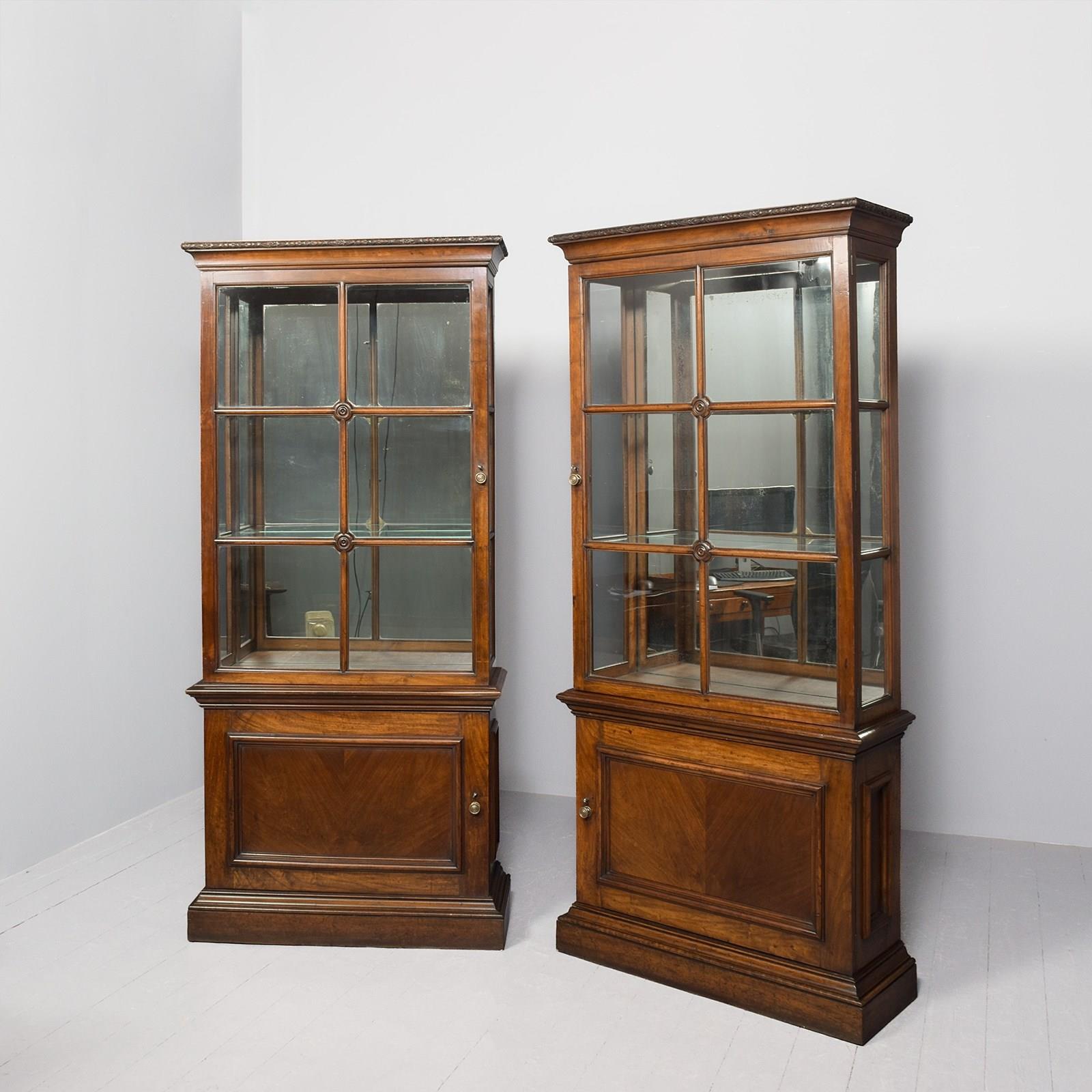 Circa 1870. Rare pair of tall Neo-Classical style display walnut cases. Surmounted by a moulded cornice with neo-classical foliate decoration, the single doors with brass drop handles and brass escutcheons, moulded astragal glazing bars and central roundels open to glazed shelved interiors. The glazed sides with matching astragal bars. The attached bases with deep moulding above single doors with mirror-matched figured walnut panels, brass handles and escutcheons opening to shelved interiors, all sitting on moulded enclosed plinth bases.