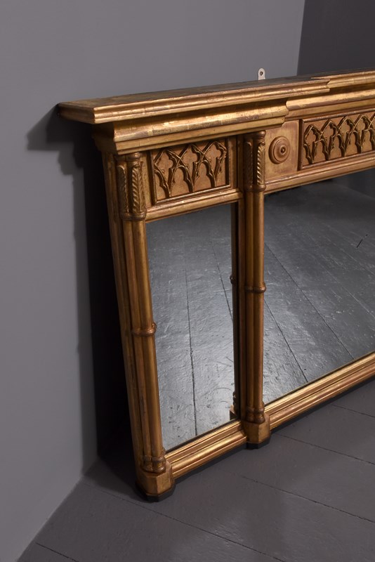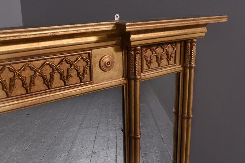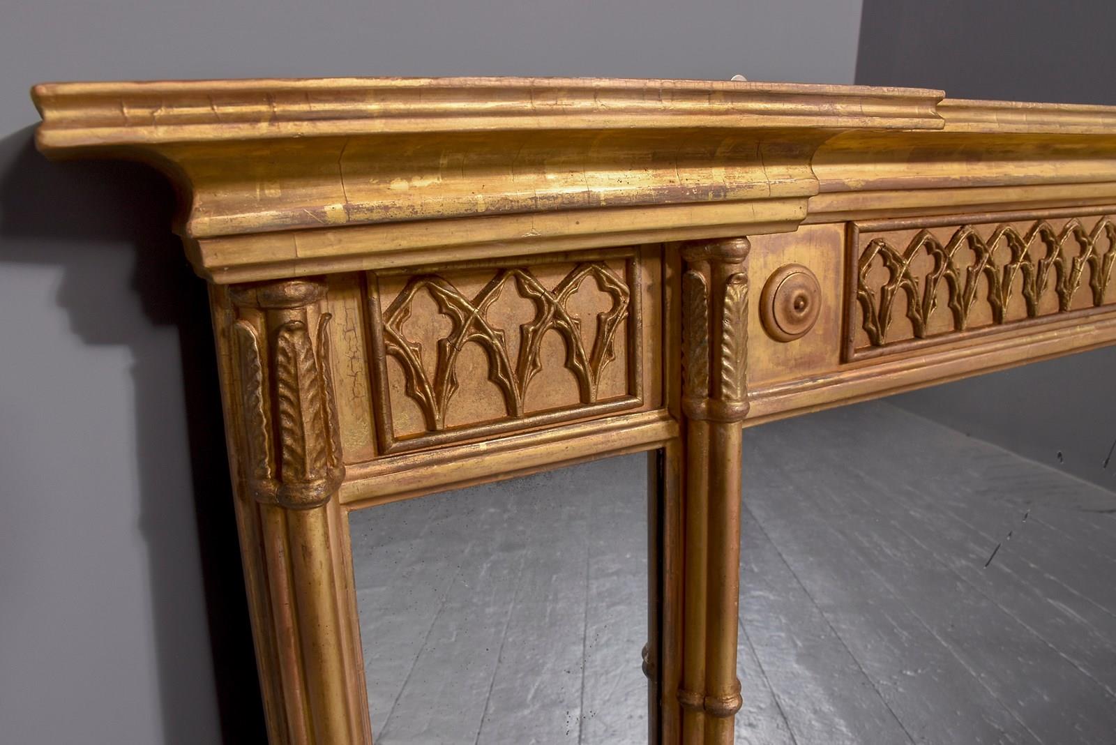 Circa 1815. A quality Regency carved and gilded triptych overmantel mirror, the flat top with an overhanging moulded fore-edge with a concave section beneath, the frieze with fine gothic tracery with gilded rondels, the mirror in the center flanked by a pair of rectangular mirrors, separated by cluster pilasters headed with foliate casting and finishing on turned blocks, the gilded frame retains the original mirror with flecking and imperfections, beneath the mirrors is a gilded stepped base, all resting on an ebonized plinth which follows the form of the top.