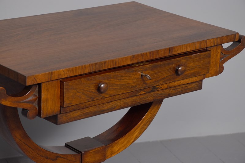 Circa 1820. Regency Rosewood free-standing side or lamp table. The rectangular top in figured rosewood with crossbanded fore-edges and two turned carrying handles. With a frieze drawer to the front with original lock and key and finely turned knobs and faux drawers on the rear. On an arched support with a bulbous hexagonal stem and quadripartite base with turned feet with hidden original brass castors