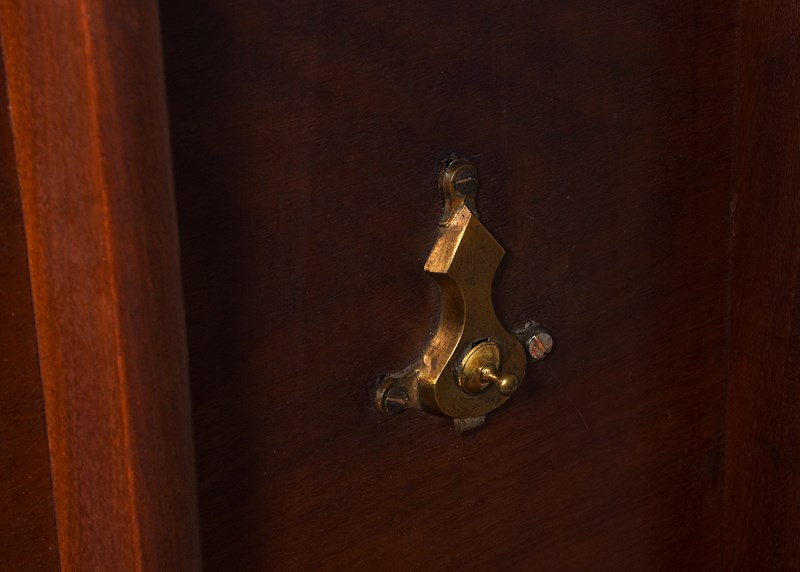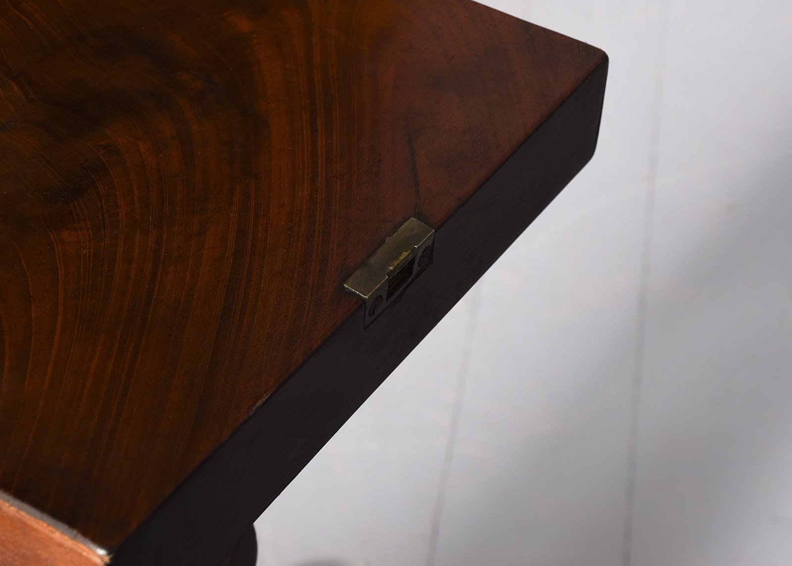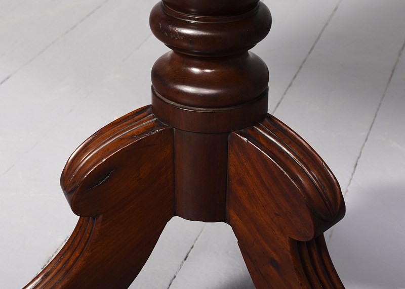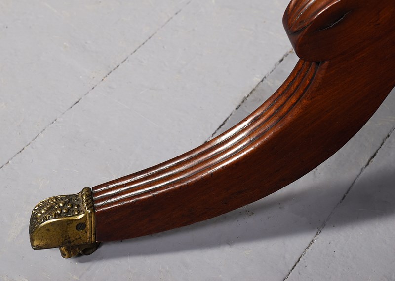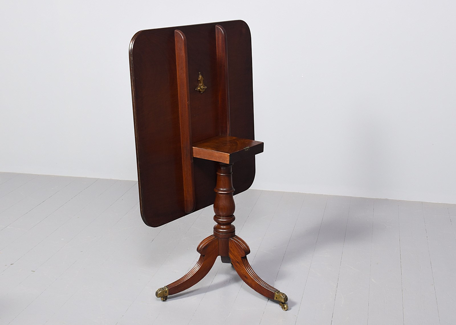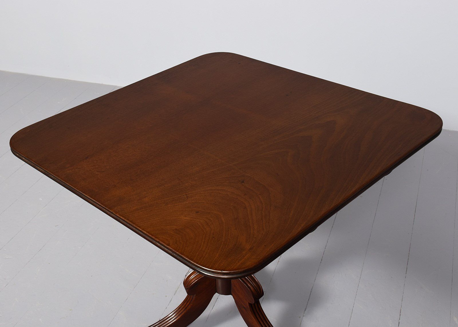 Circa 1815. A Regency mahogany square topped breakfast table of desirable proportions, the top in the finest figured mahogany and a reeded fore-edge, the back of the table has a brass clasp for opening and locking the top in position, resting on a mahogany block, supported on a turned and tapering bulbous stem, issuing three hipped and carved cabriole legs with reeding on the facings, finishing with a brass block with foliate casting on the top and the original castors underneath.