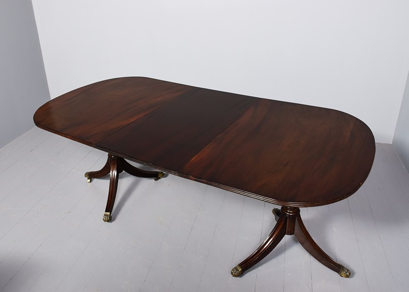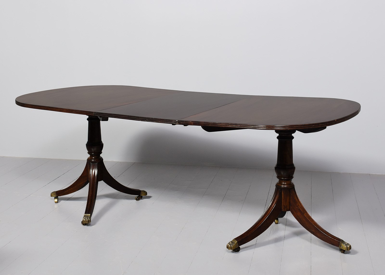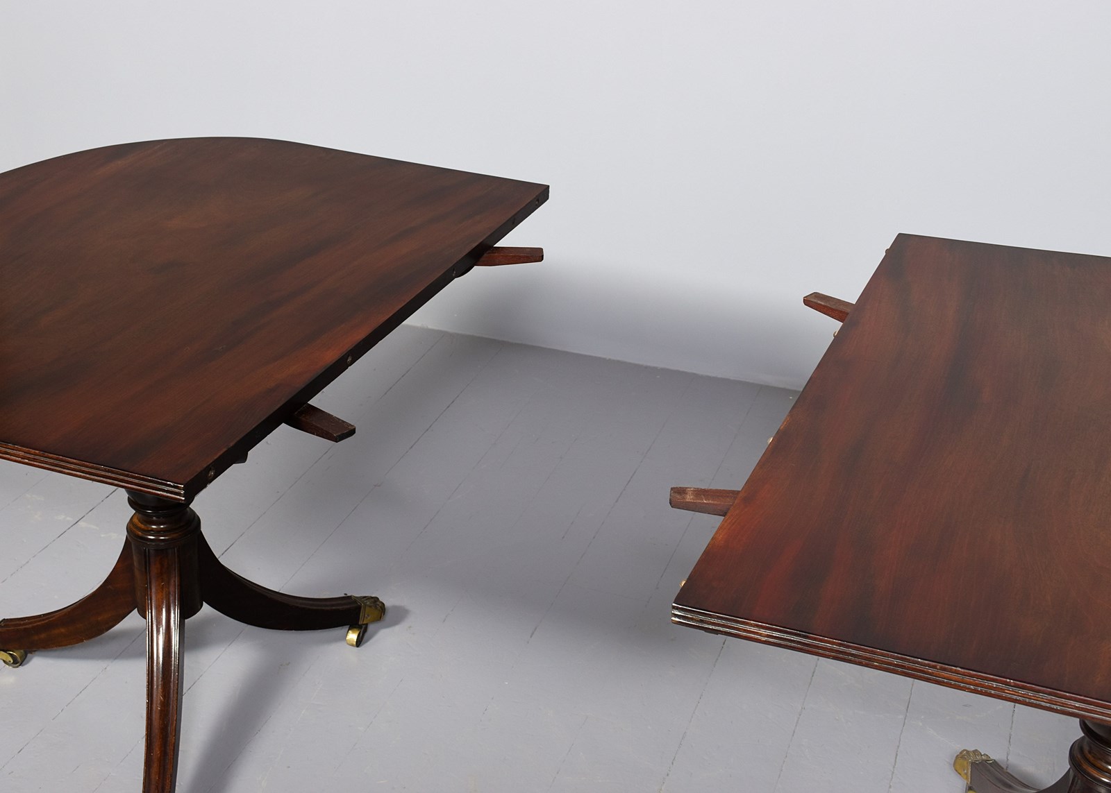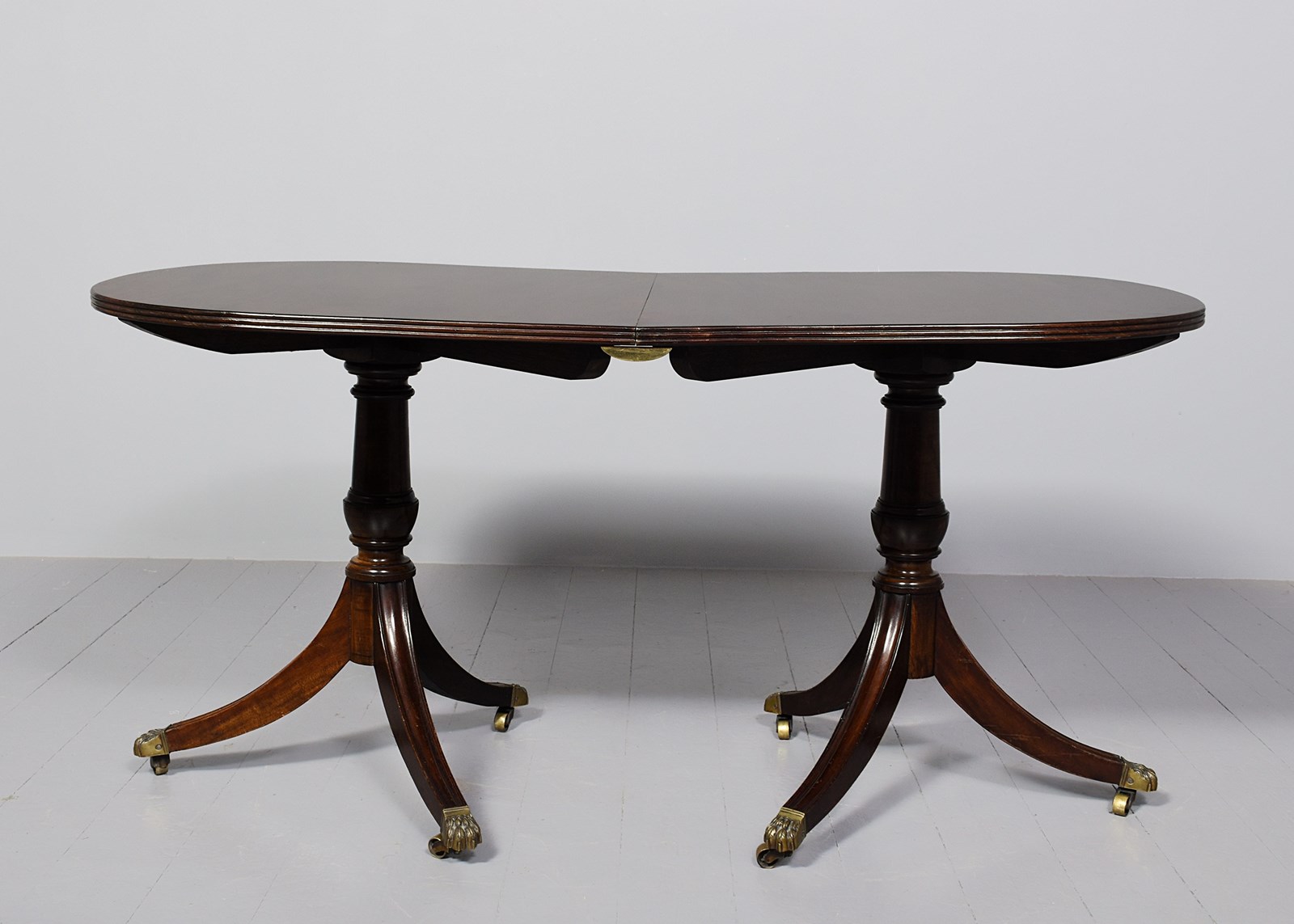 Circa 1900. A Regency style mahogany twin pillar dining table, plus one extra leaf, the D shaped tops in fine flame mahogany with a ribbed fore edge, supported with a stylish tapering stem with urn shaped section towards the base, issuing three ribbed saber legs finishing with a brass paw with original brass castors, the leaf is held in place by four cast brass keepers and forks.