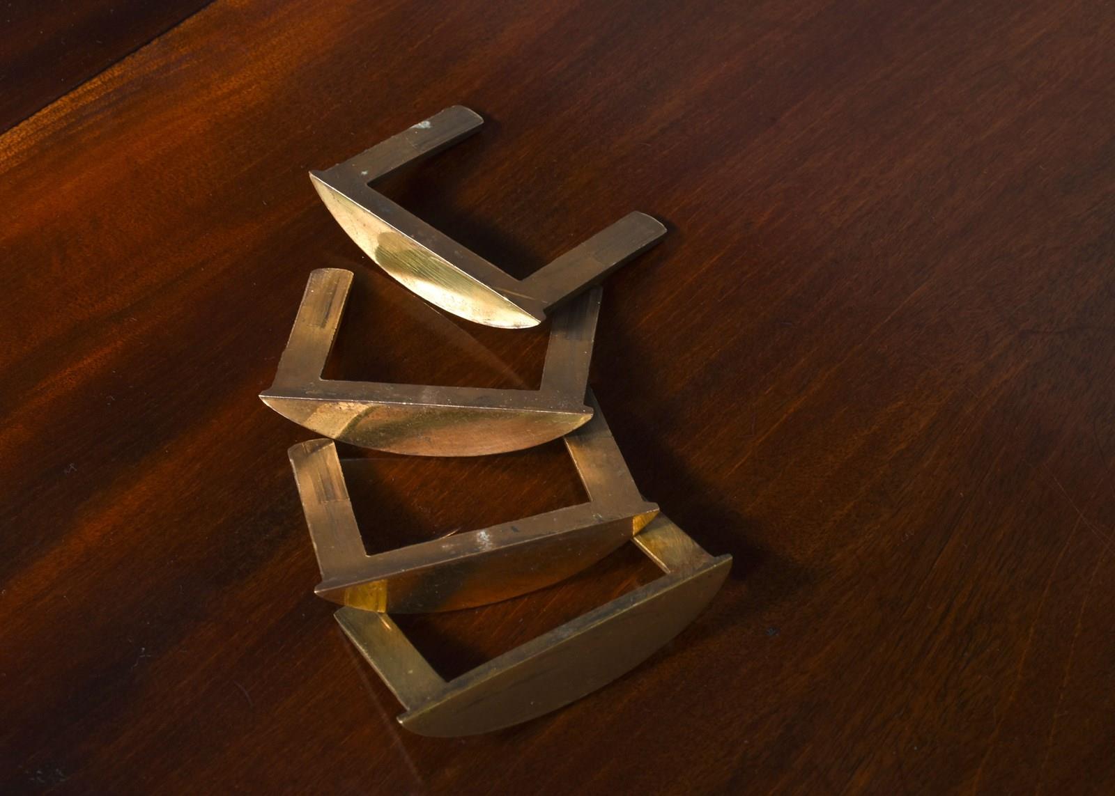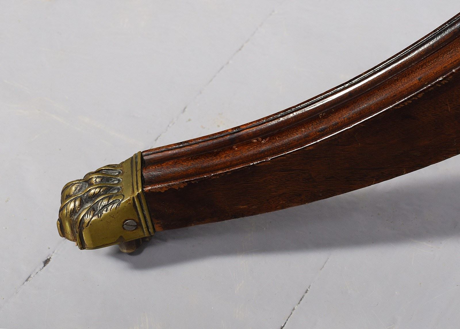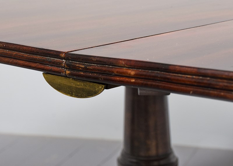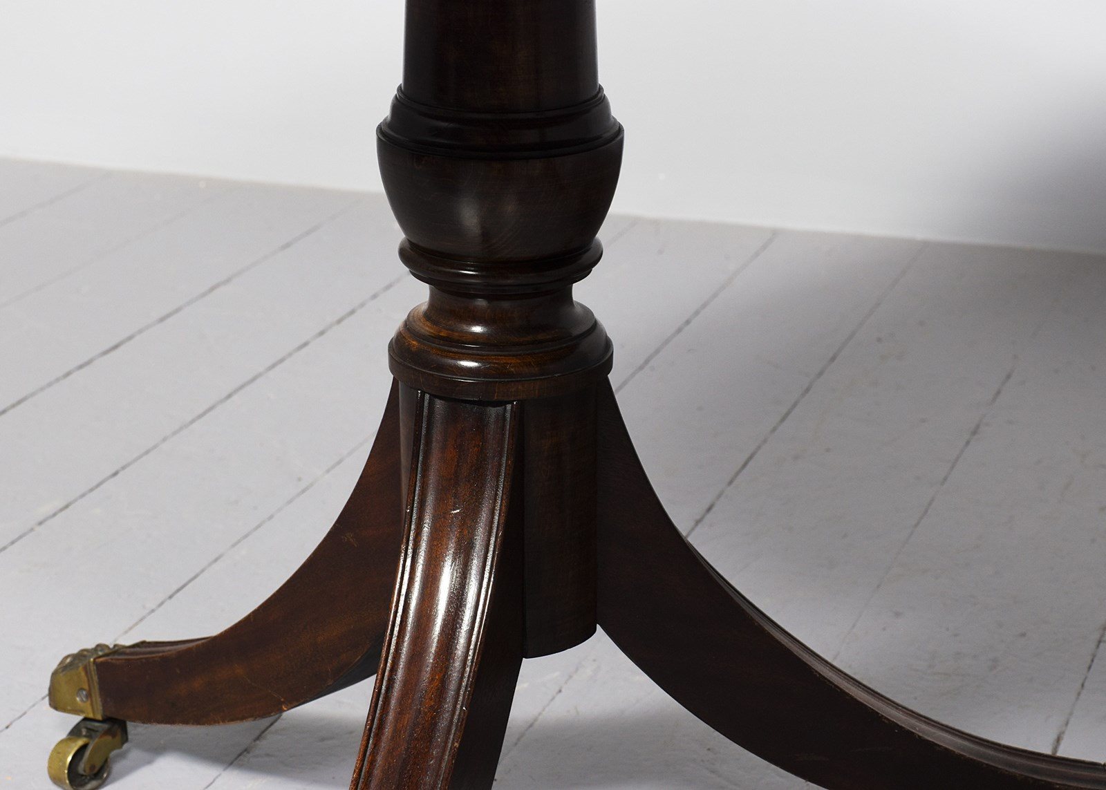 Circa 1900. A Regency style mahogany twin pillar dining table, plus one extra leaf, the D shaped tops in fine flame mahogany with a ribbed fore edge, supported with a stylish tapering stem with urn shaped section towards the base, issuing three ribbed saber legs finishing with a brass paw with original brass castors, the leaf is held in place by four cast brass keepers and forks.
