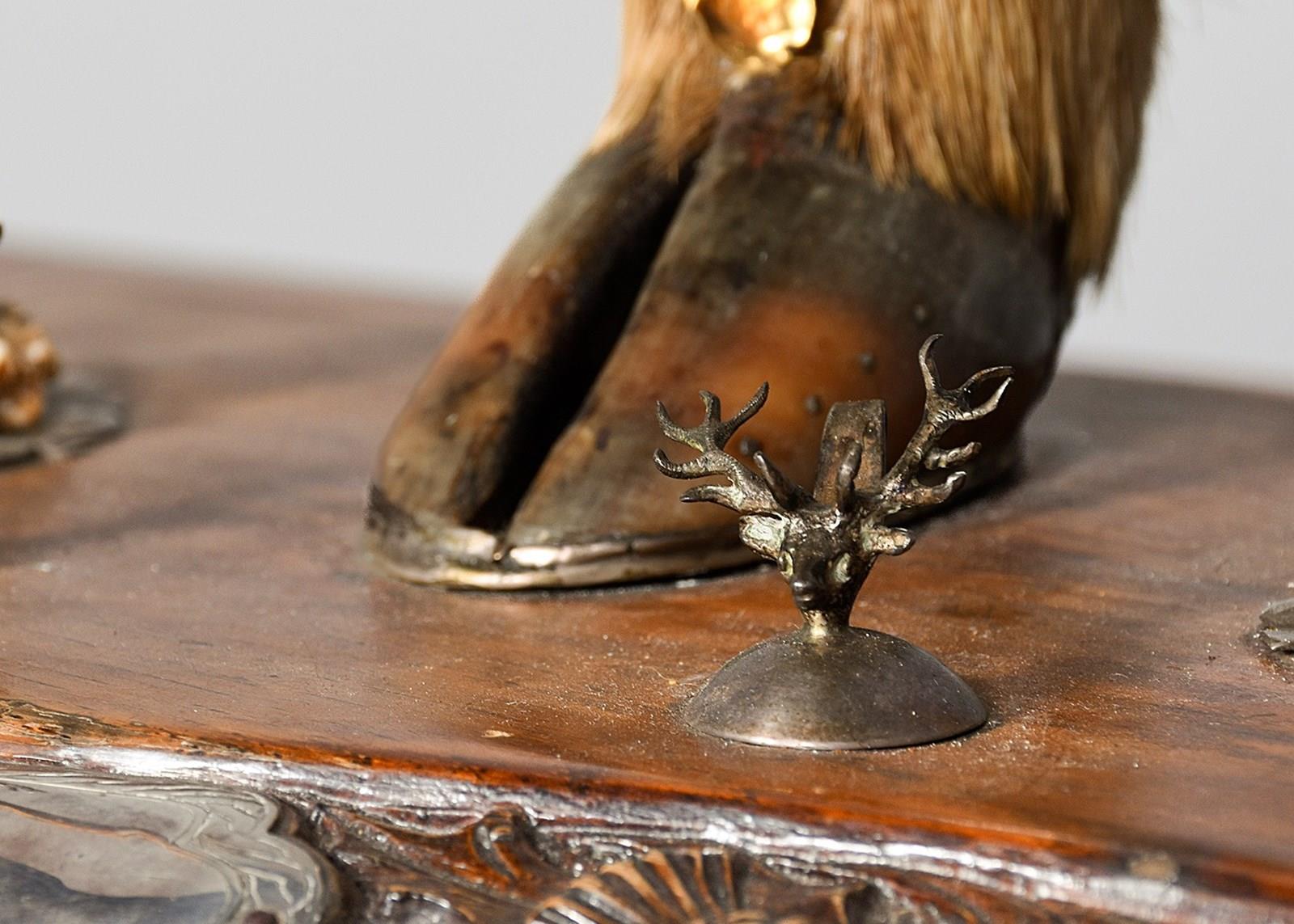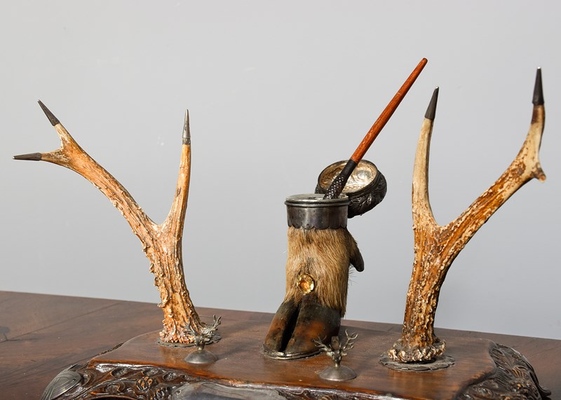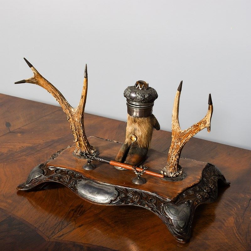 Dated 1859. A mid-Victorian oak and silver-mounted desk set. The center with a deer foot mounted in silver with cut stones, and a hallmarked lidded ink well, with two small antlers with silver mounts on the tips, and a small pair of metal deer heads holding a pen, all resting on a shaped carved base with thistle carving on all sides and five various silver mounts with Celtic patterns, resting on stylish feet, the underside covered in leather. One of the hallmarks is for Edinburgh in 1859.