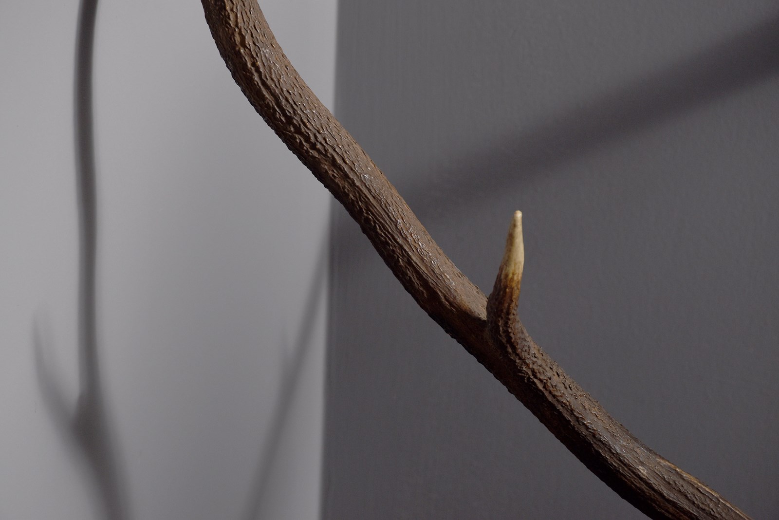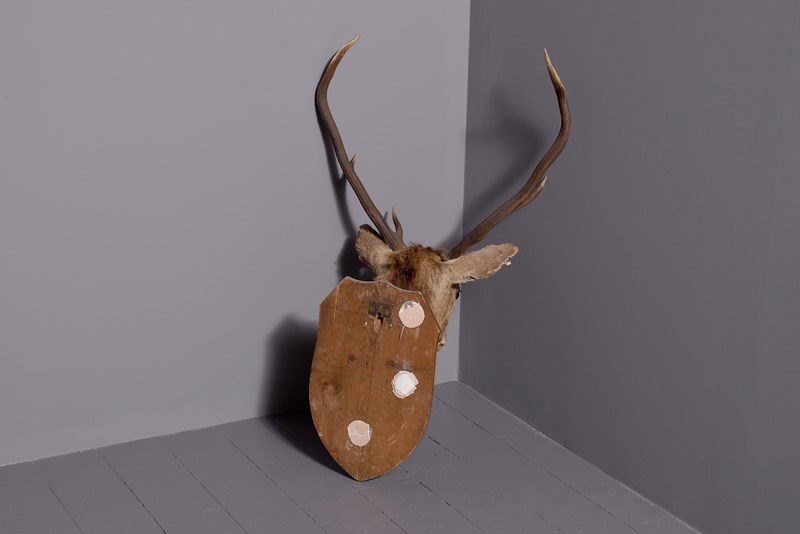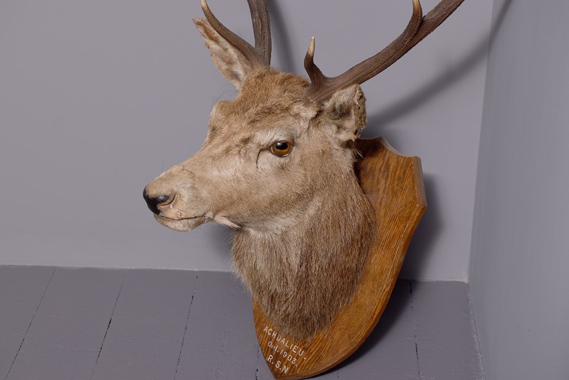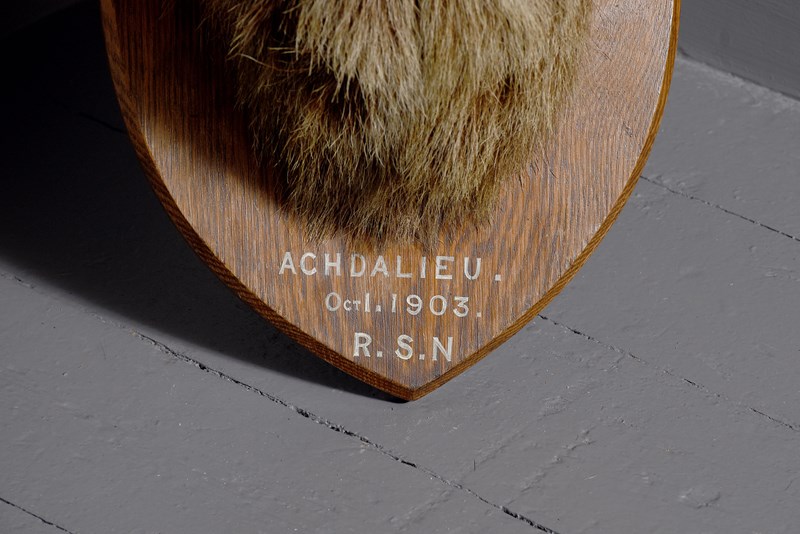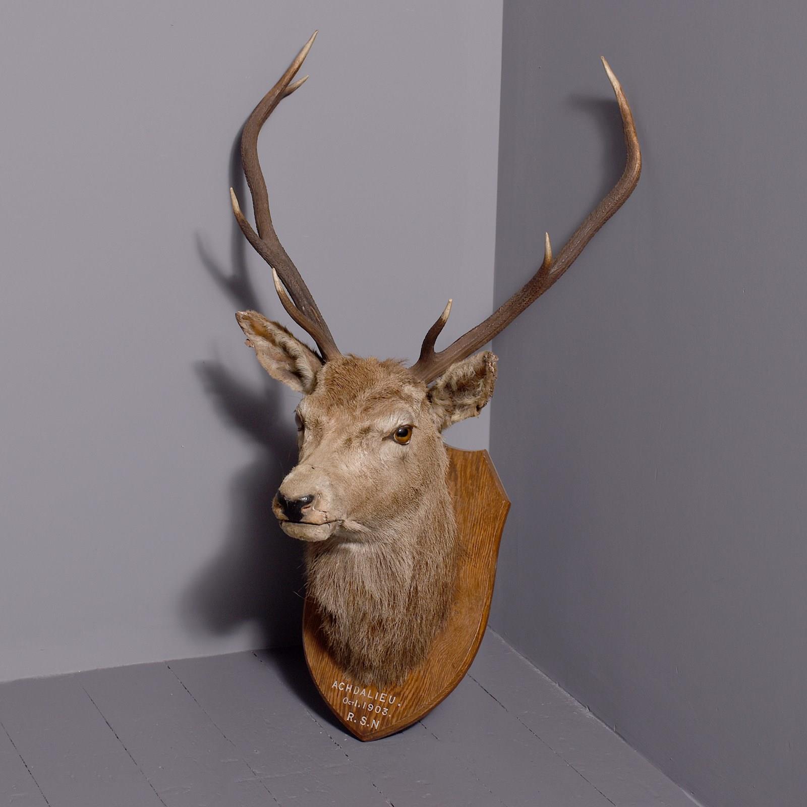 Scottish red deer stag taxidermy head with 9-point antlers. Excellent quality taxidermy with glass eyes, and head mounted on a heraldic oak shield bearing the name of the estate Achdalieu, October 1st 1903 and with initials R. S. N.