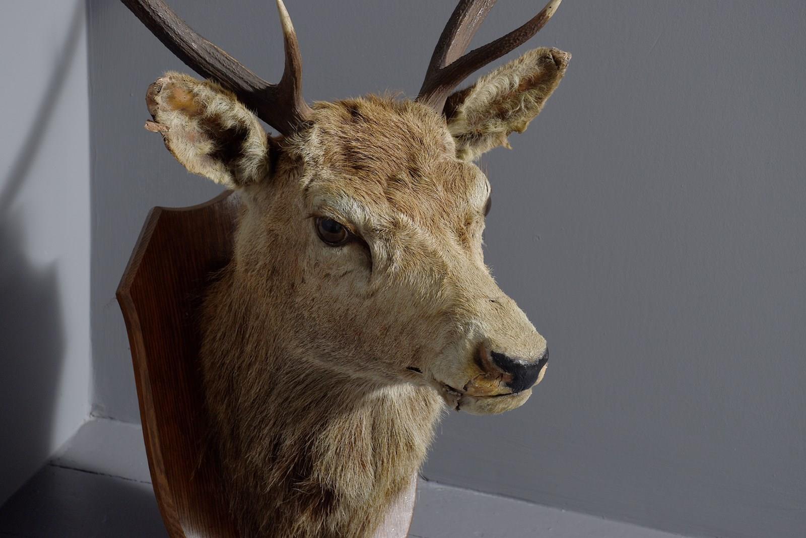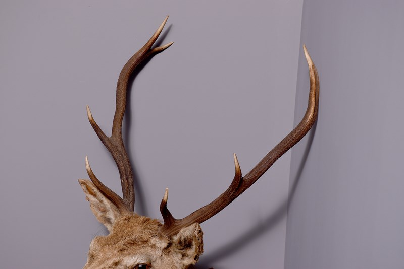 Scottish Red Deer Stag Taxidermy Head With 9-Point Antlers Mounted On An Oak Her