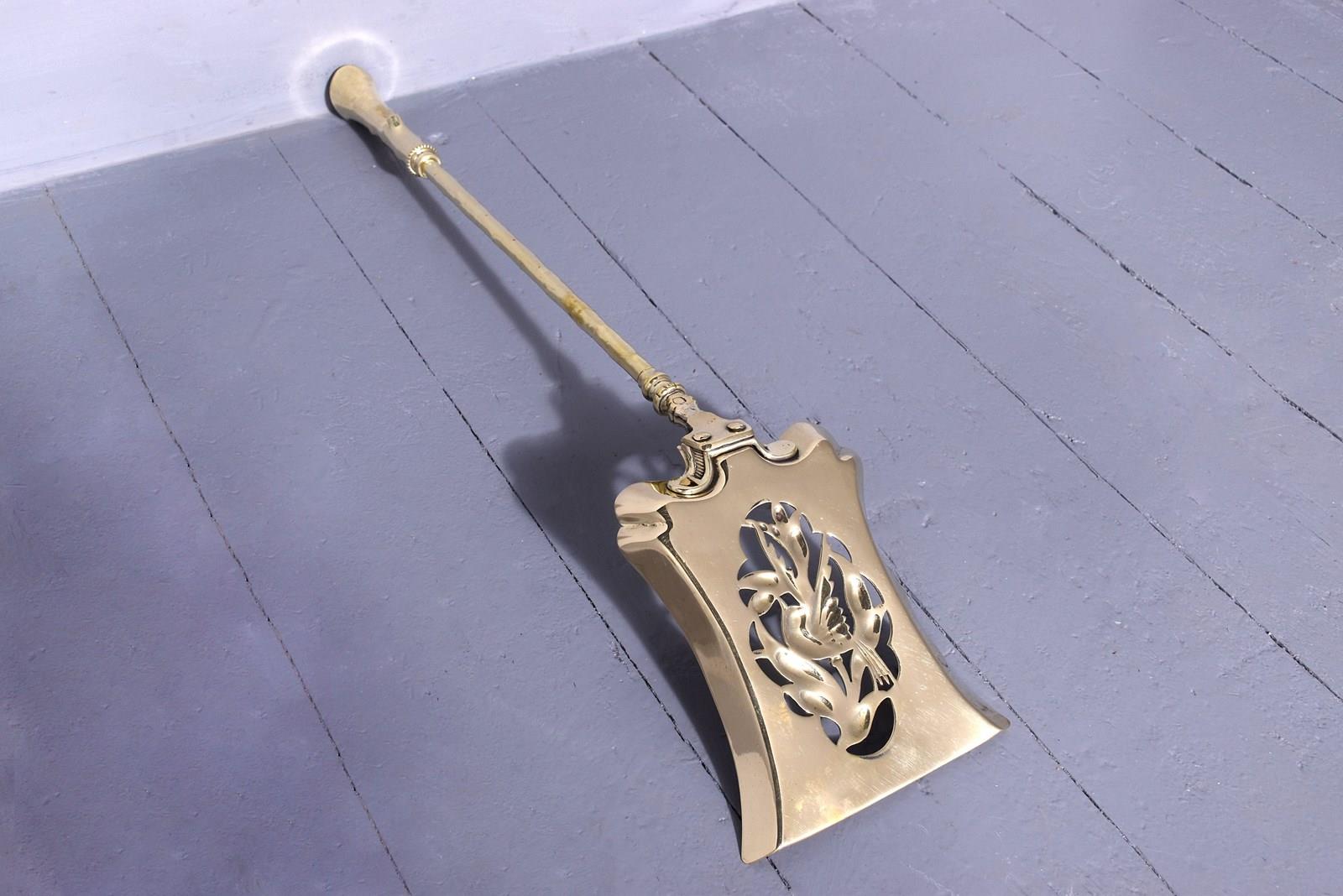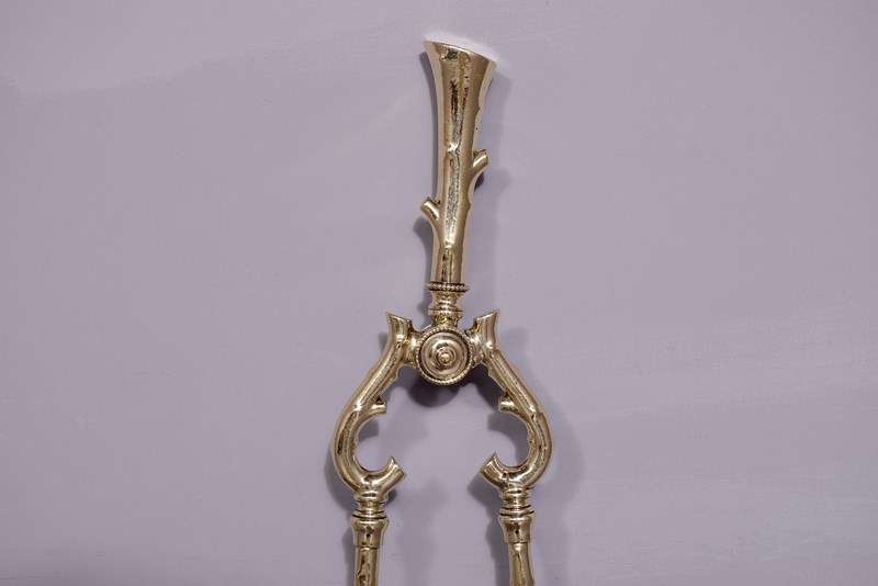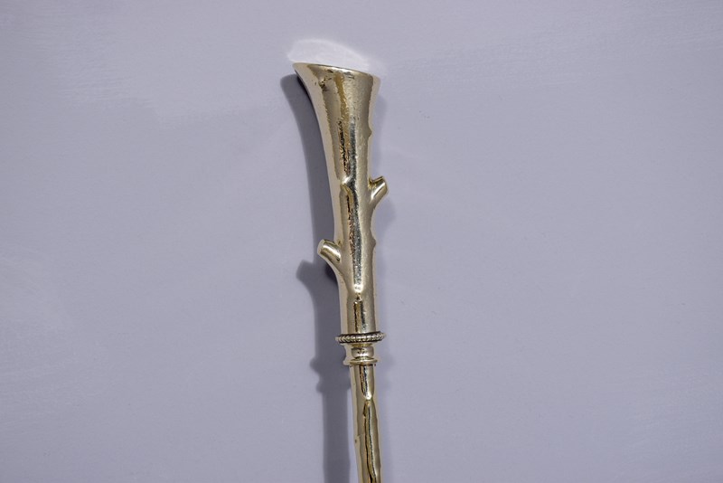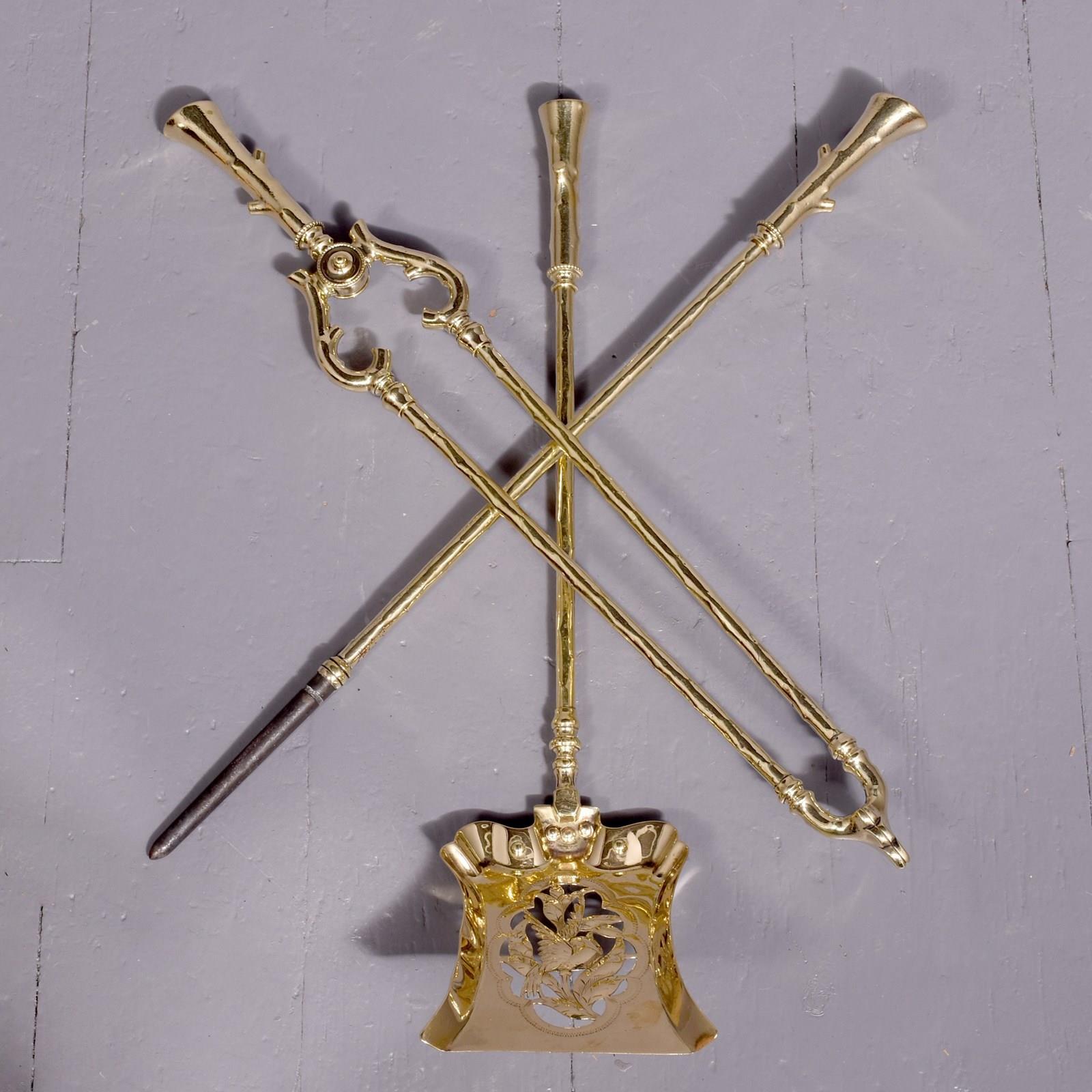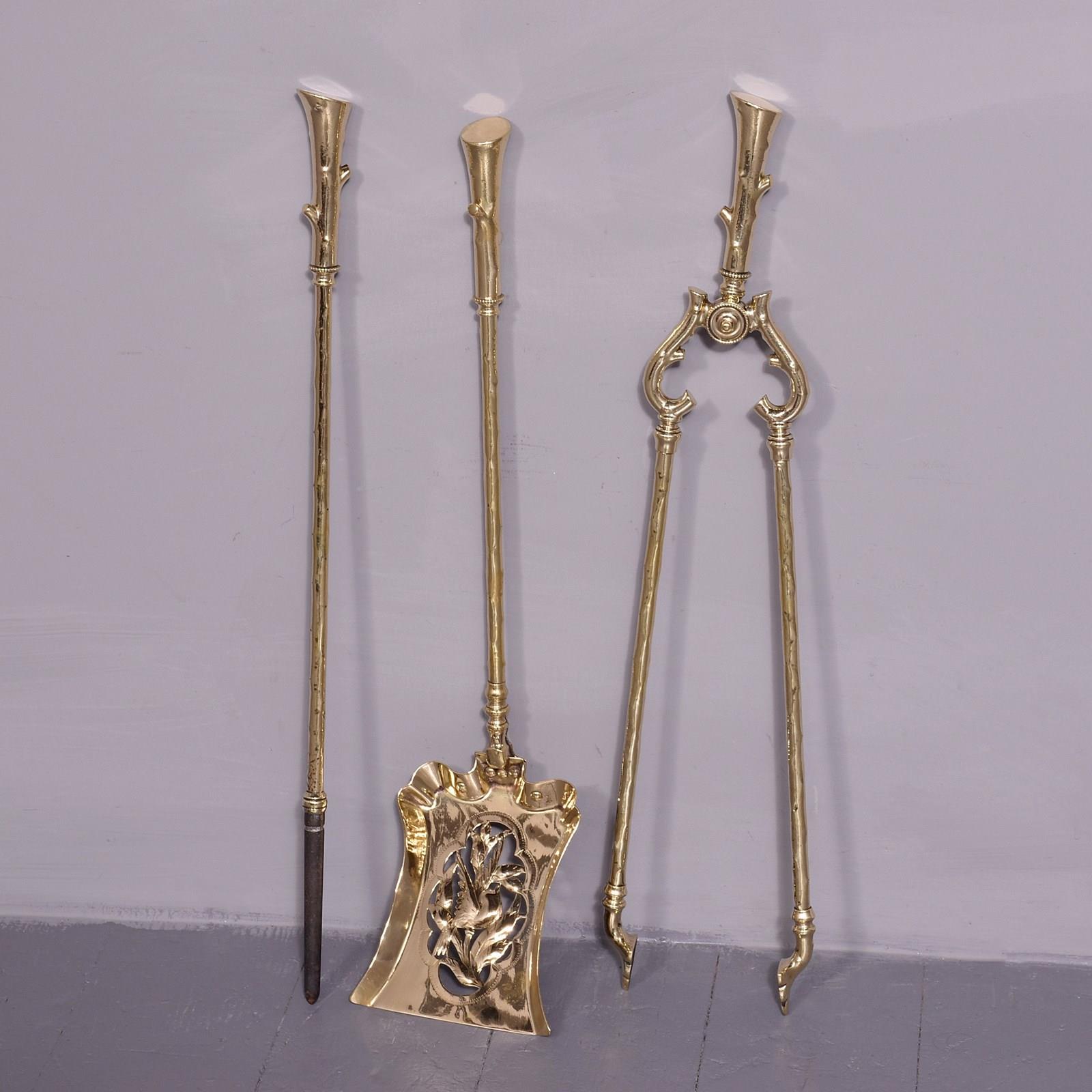 Circa 1880. A very unusual and stylish set of 3 brass fireside tools, each with a very stylish handle in the form of a tapering piece of wood, the shafts with a similar pattern, the set consisting of a poker, tongs and an elegant shovel with a pierced and engraved bird in the center.