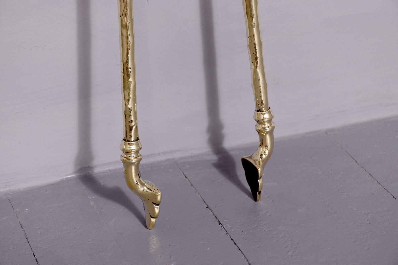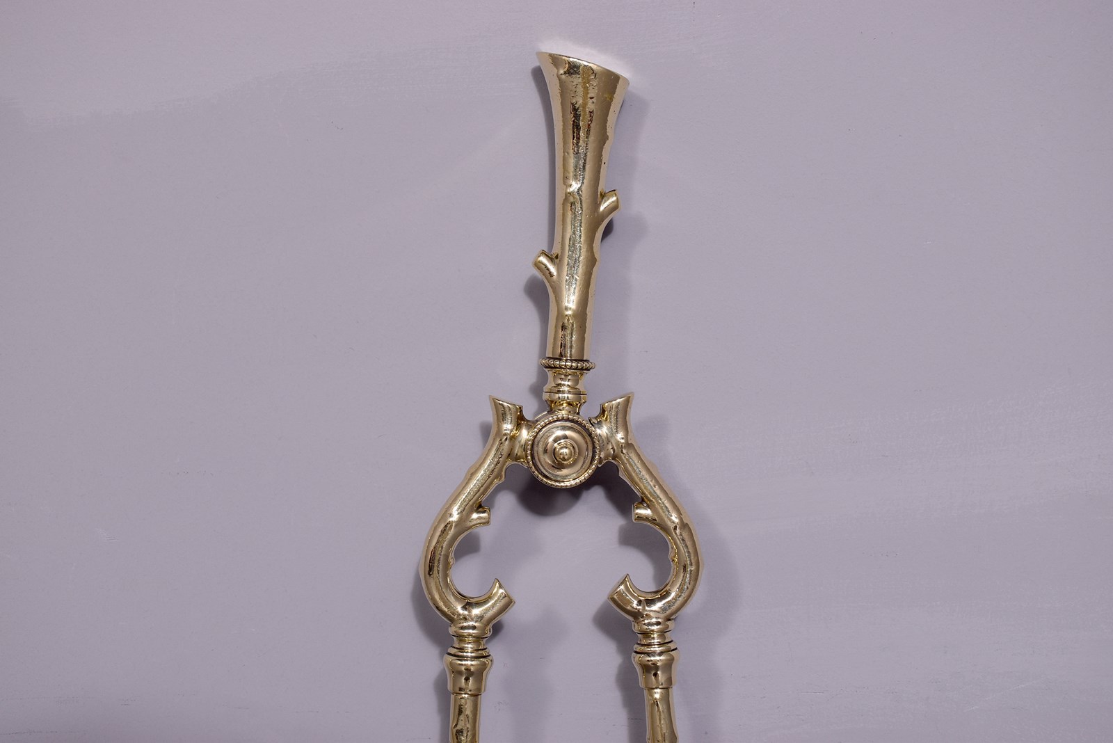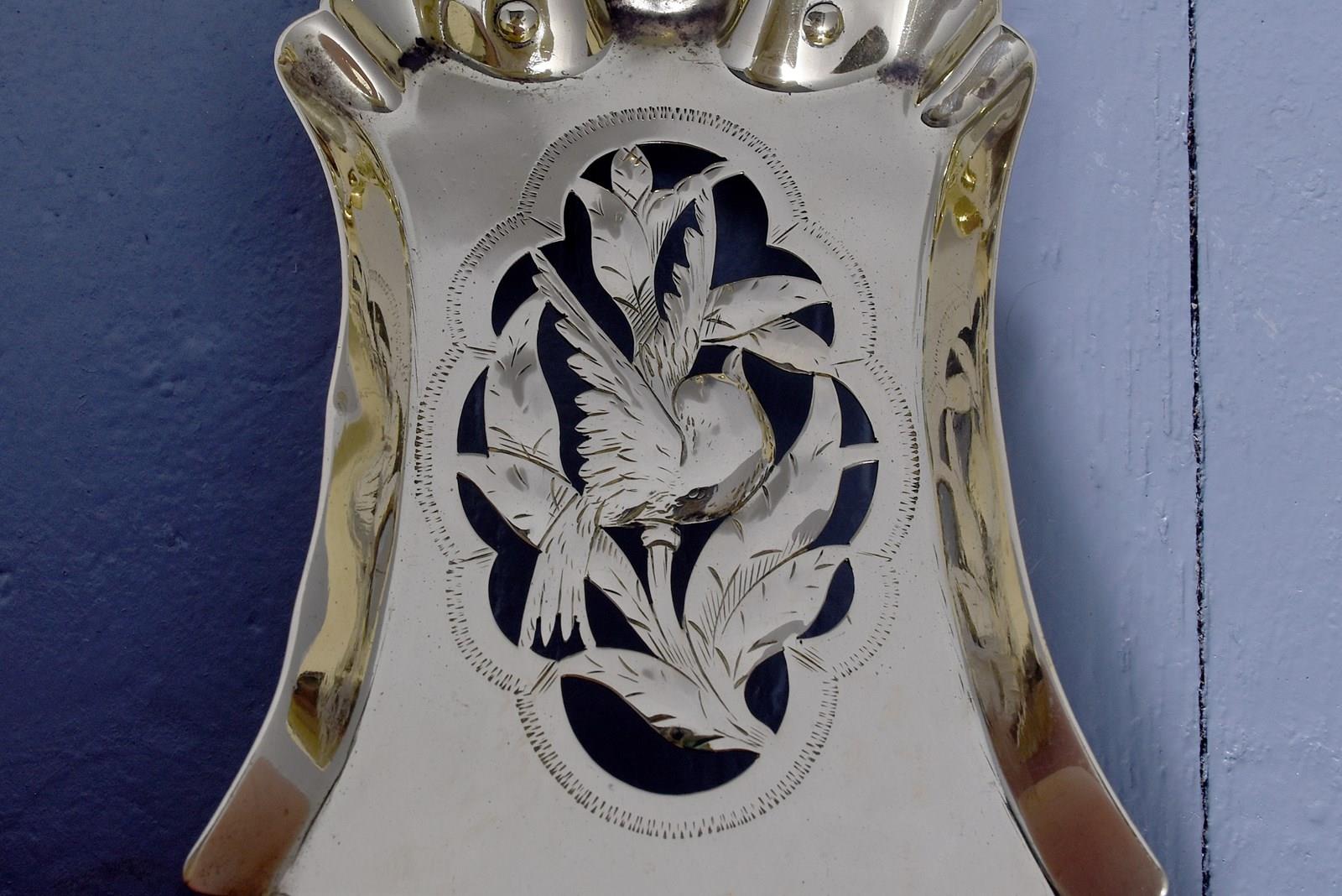 Circa 1880. A very unusual and stylish set of 3 brass fireside tools, each with a very stylish handle in the form of a tapering piece of wood, the shafts with a similar pattern, the set consisting of a poker, tongs and an elegant shovel with a pierced and engraved bird in the center.