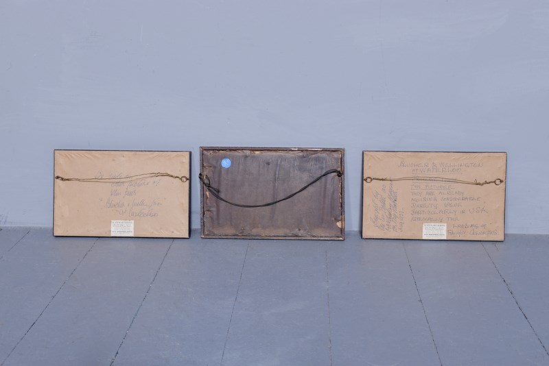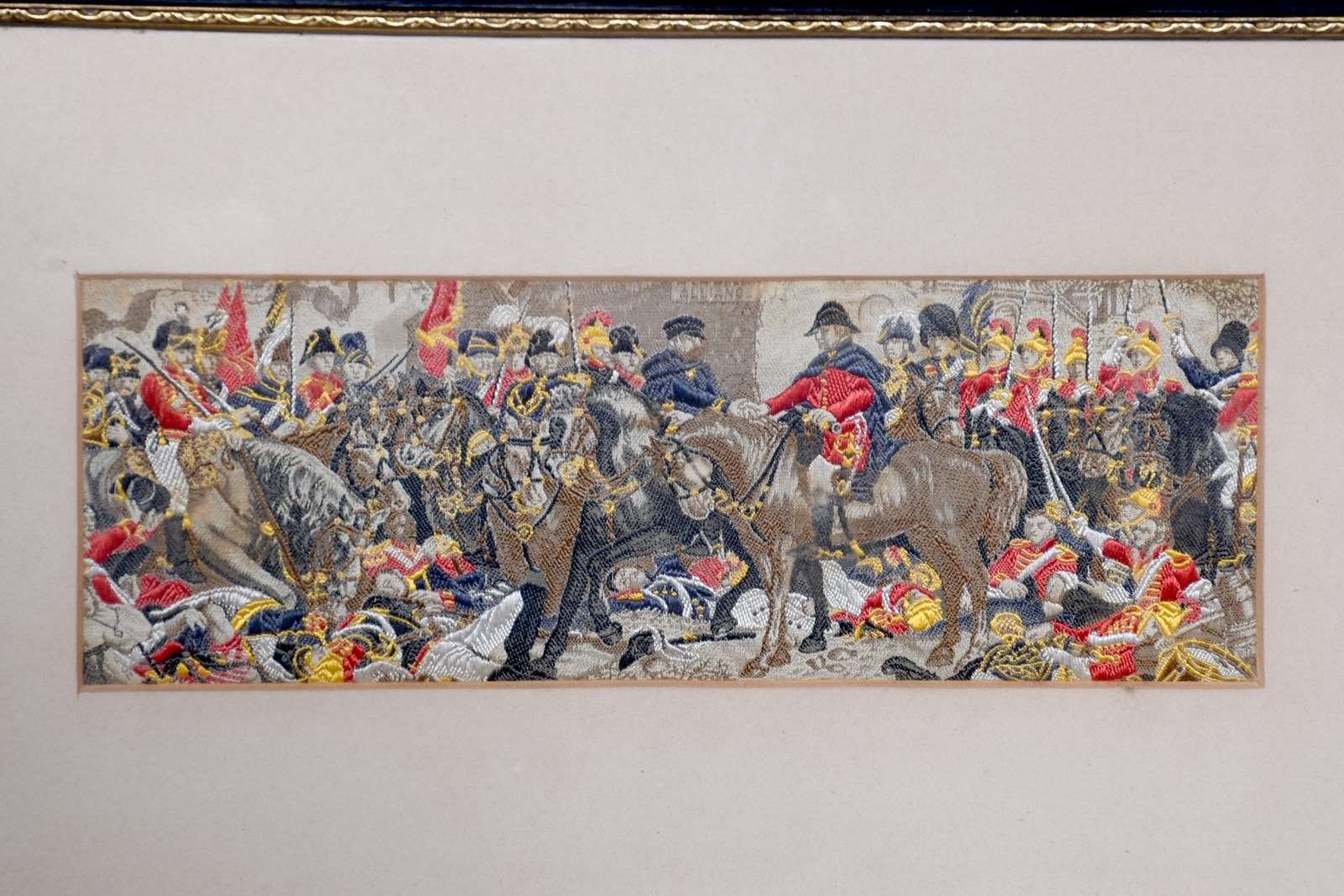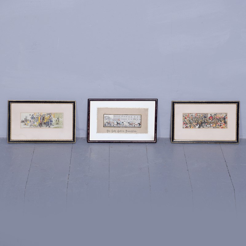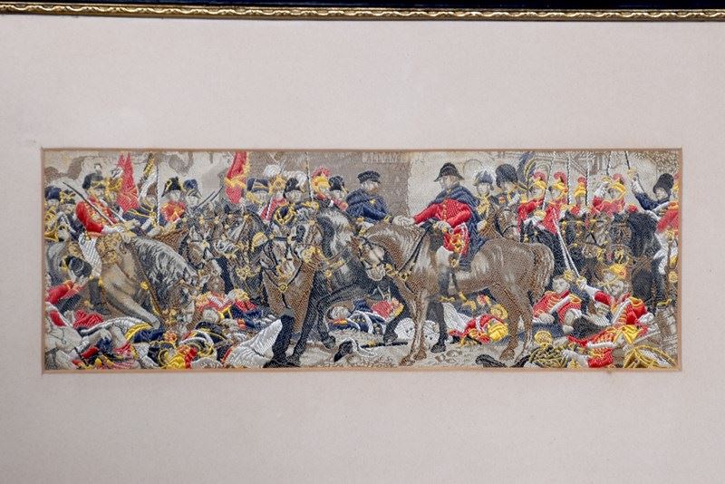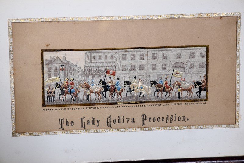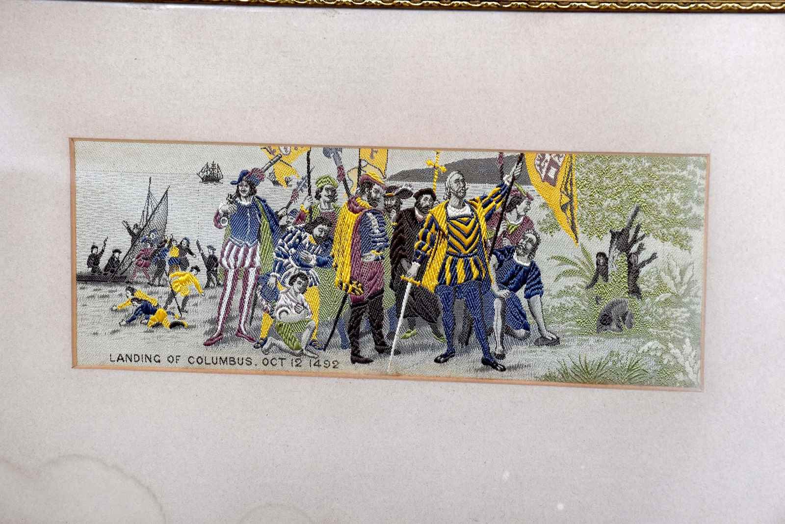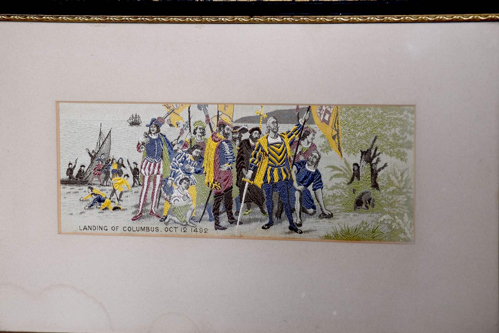 Circa 1890. A set of three small framed silk-work work panels, in a carved mount in a gilded and ebonized frame. The panels depict the following: ‘landing of Columbus on October 12th, 1492 ‘, then ‘Blucher & Wellington at Waterloo’, and the third panel ‘the Lady Godiva Procession’ verso with the trade label for R Stewart, St Johns Street, Perth, and various handwritten information on the scenes.