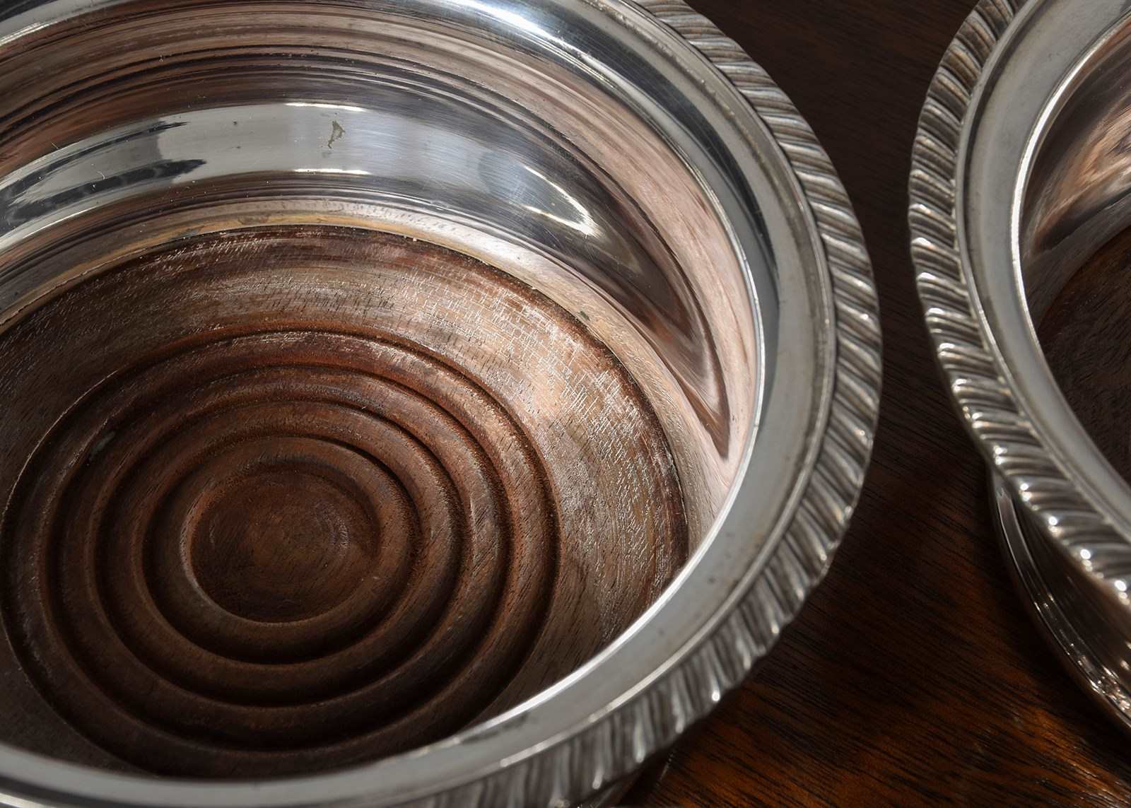 Circa 1900. Quality set of four large EPNS mahogany wine coasters, the circular coasters with a dragooned top edge and with curvaceous body, the insert mahogany base with concentric patterns on the inside and baize lined on the outside, all four coasters are in excellent condition with no blushing or damage.