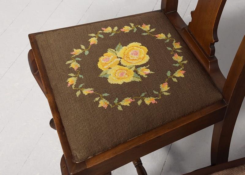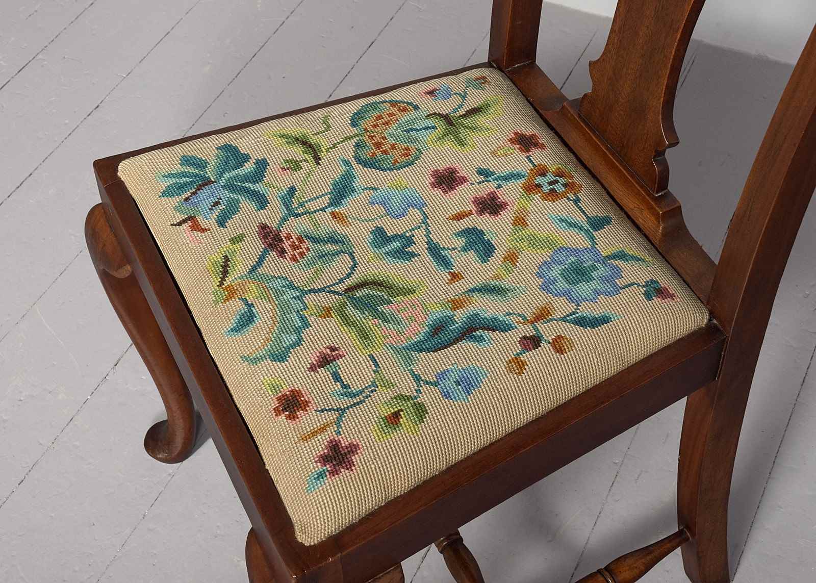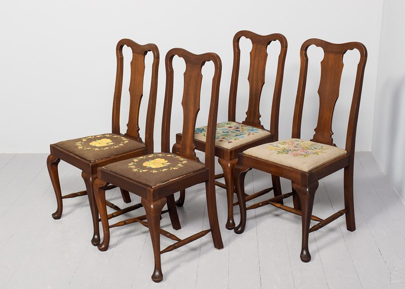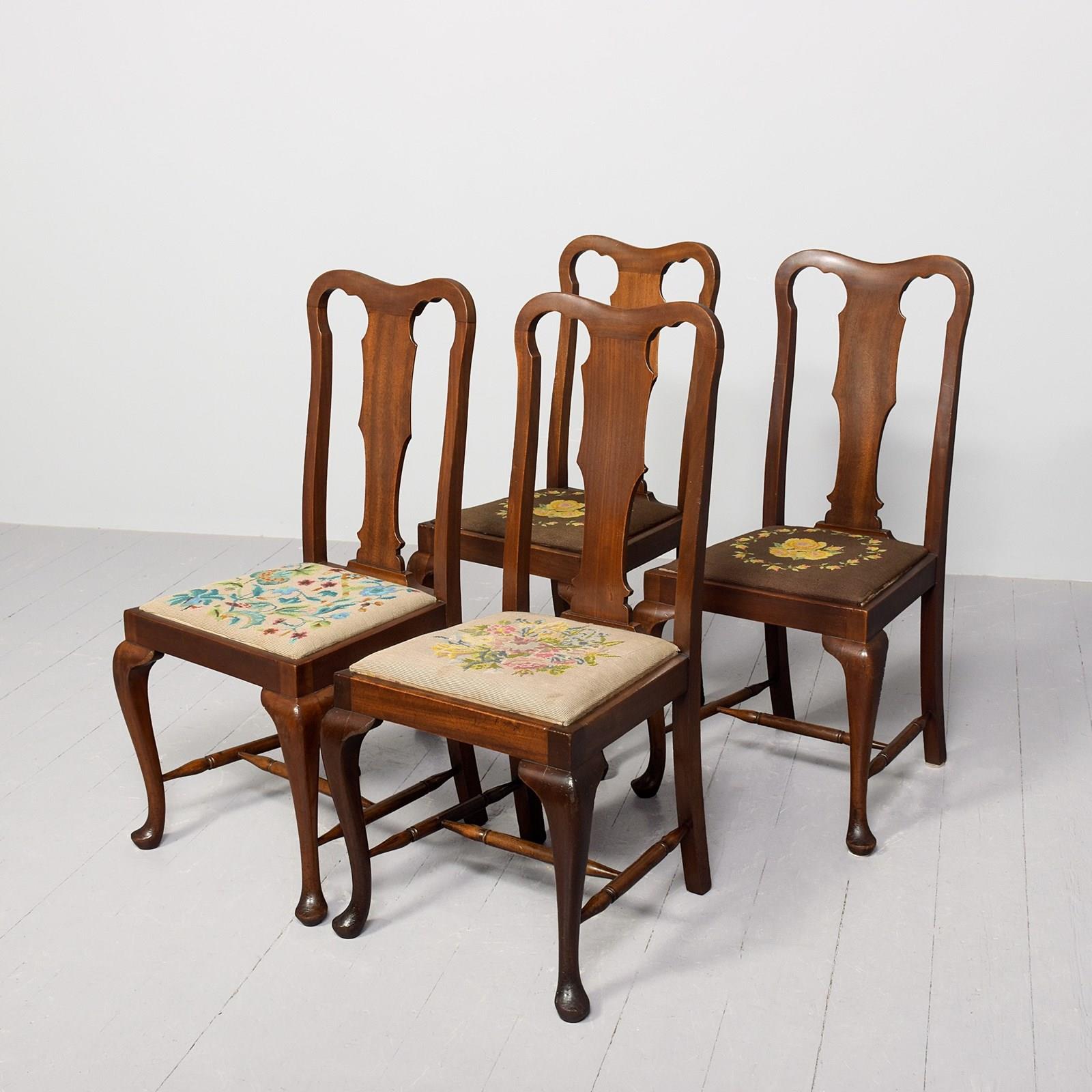 Circa 1920’s. A quality set of four mahogany tall back Queen Anne style dining chairs, the shaped cresting rail with solid shaped splat, drop-in needle point seats with a simple seat rail, back legs are square and slightly out swept, the front cabriole legs with solid quarter blocks, finishing on a pad foot, all braced by conforming turned stretchers