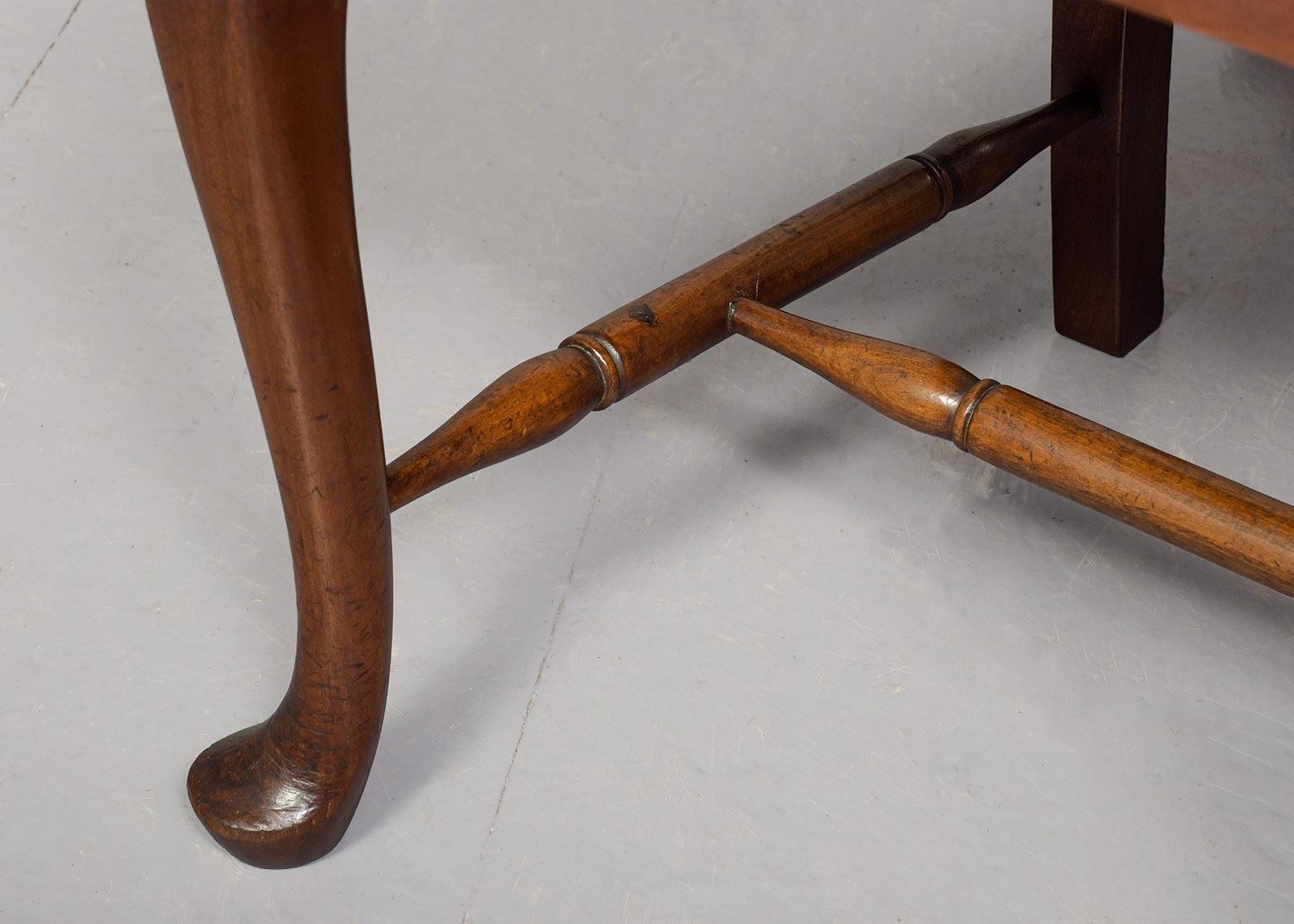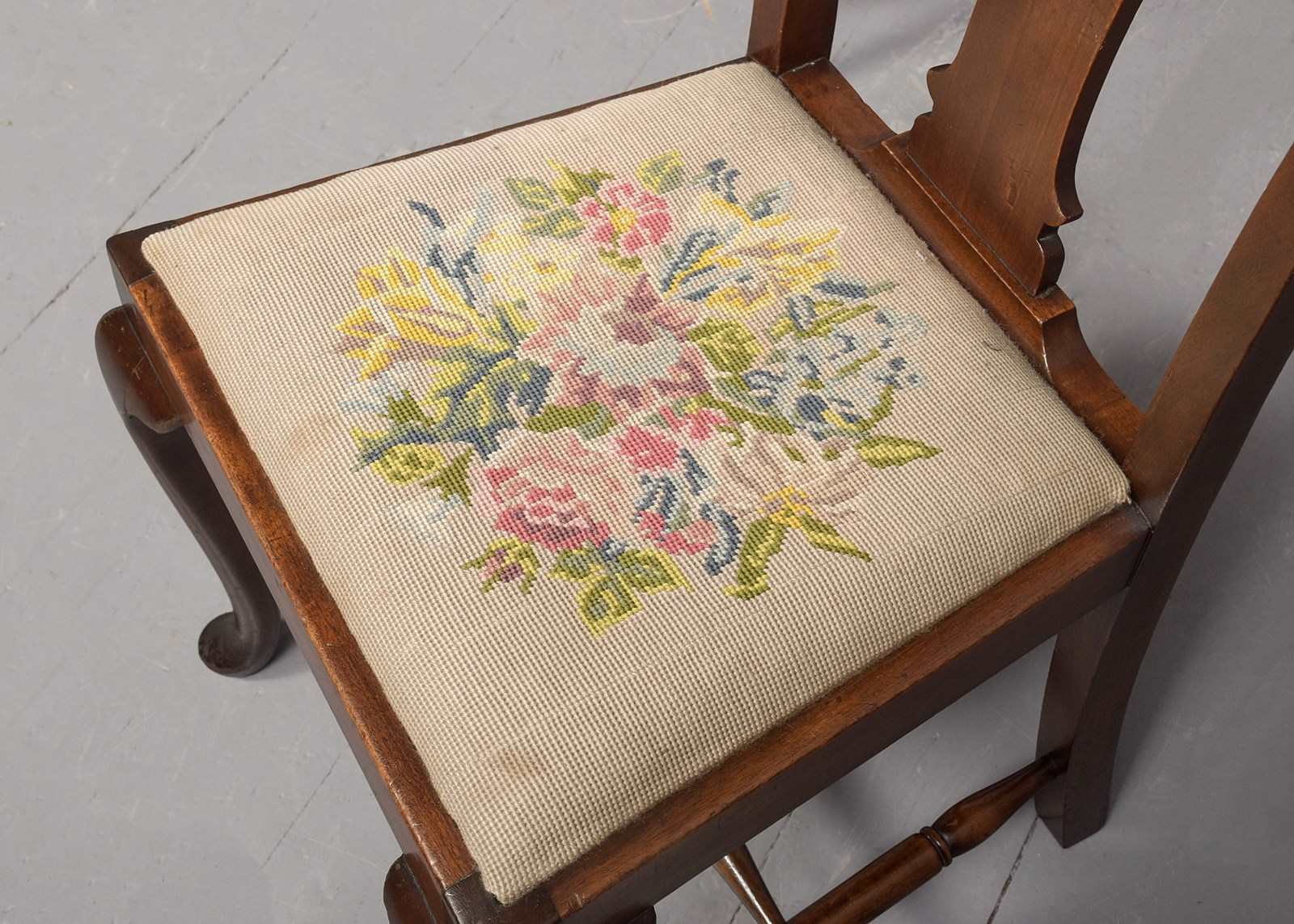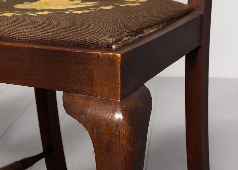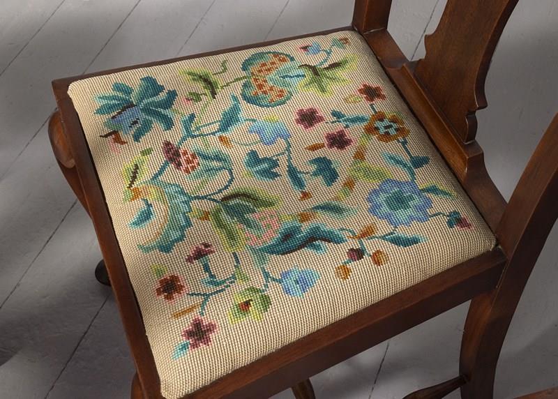 Circa 1920’s. A quality set of four mahogany tall back Queen Anne style dining chairs, the shaped cresting rail with solid shaped splat, drop-in needle point seats with a simple seat rail, back legs are square and slightly out swept, the front cabriole legs with solid quarter blocks, finishing on a pad foot, all braced by conforming turned stretchers