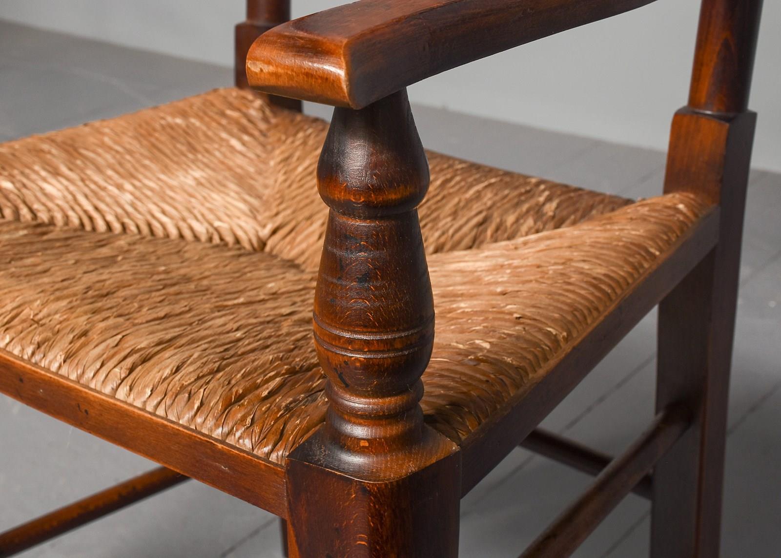 Circa 1970s. A quality set of 8 oak ladder back chairs, consisting of 6 side chairs and a pair of armchairs, each with a classic shaped rails forming the ladder back, supported on turned uprights with a simple finial, the shaped arms supported on bulbous balustrades, each with a handmade woven rush seat, the back legs are square, front legs are turned and ring turned, finishing on a bulbous foot, all are braced by multiple turned stretchers.