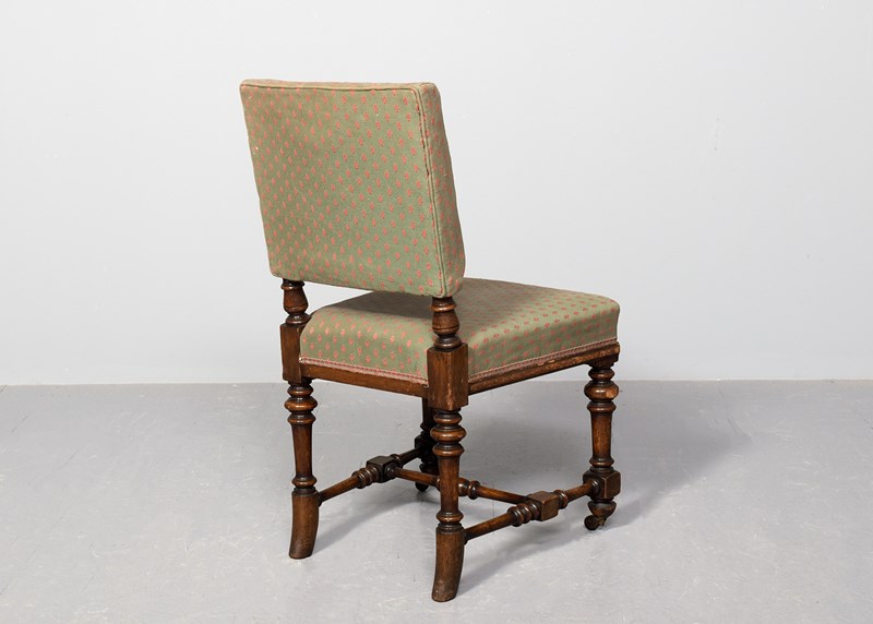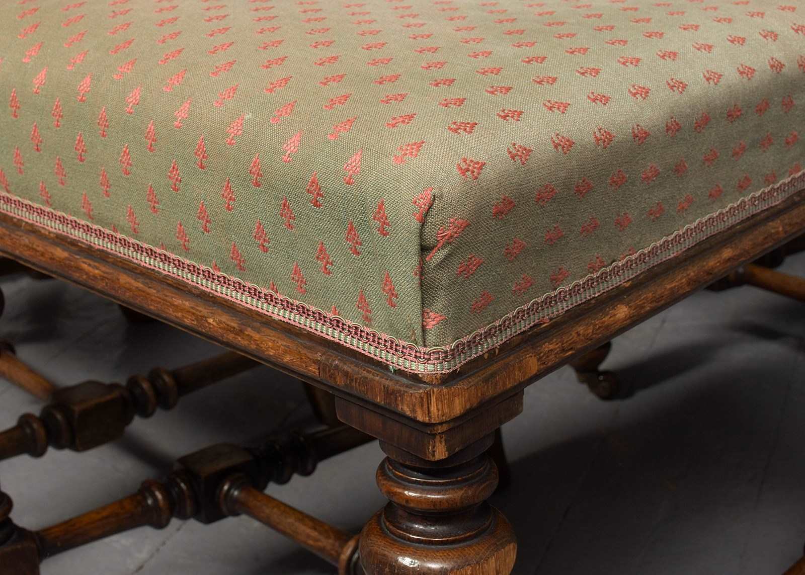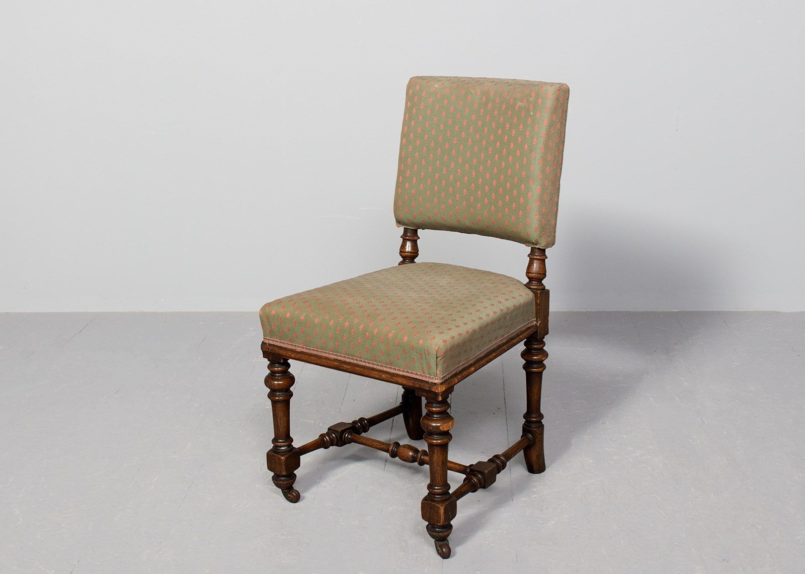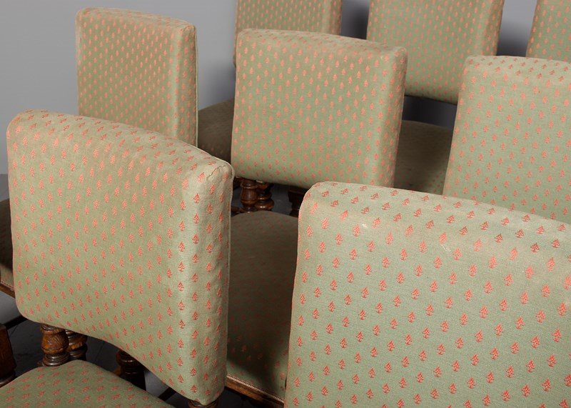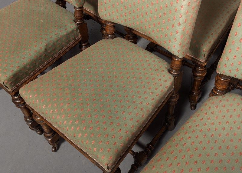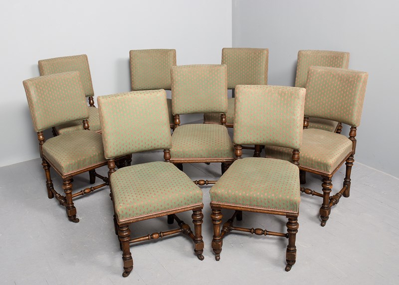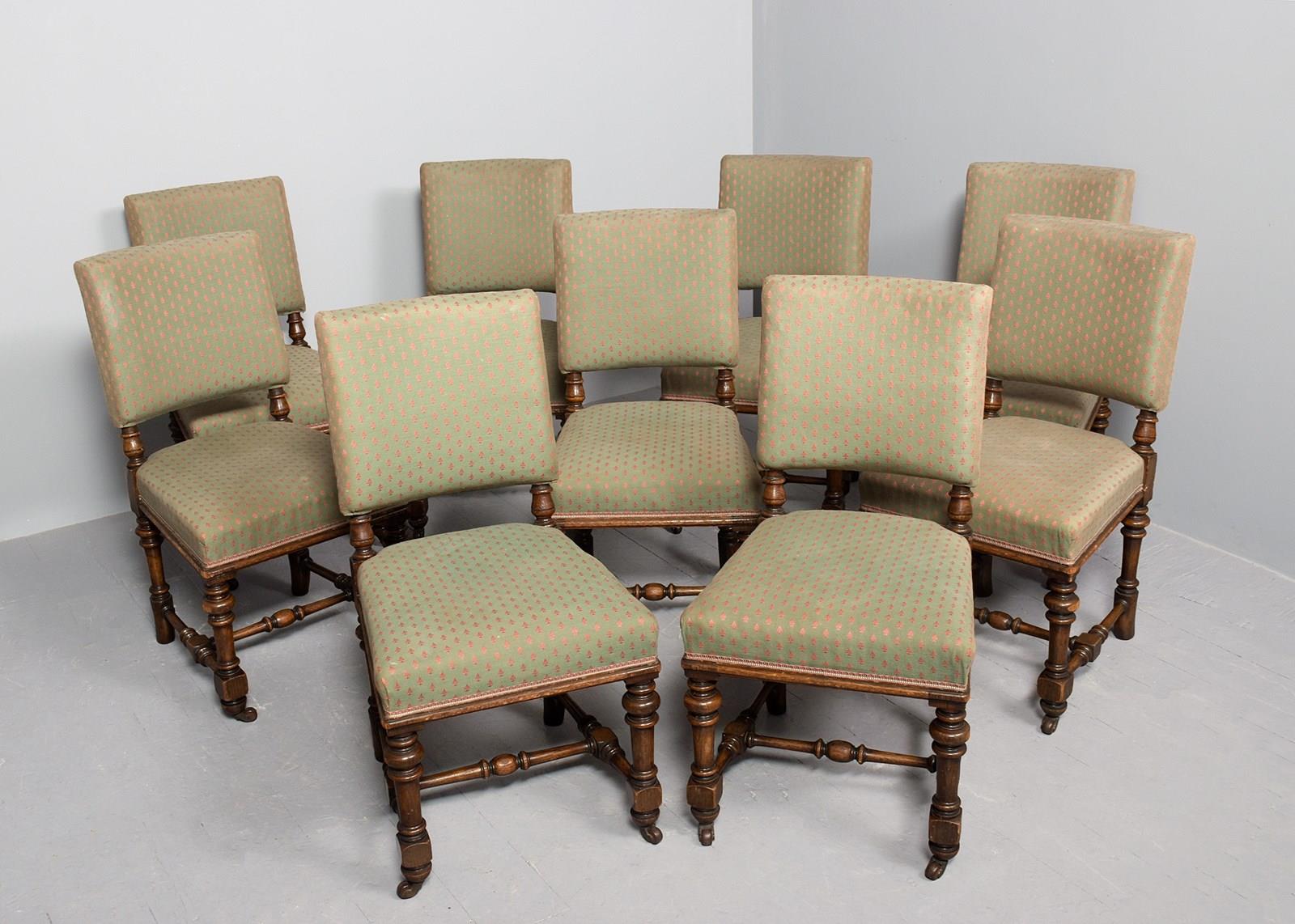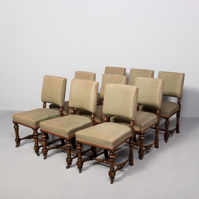 Circa 1880. A set of 9 Gillows-style oak-framed upholstered chairs, the upholstered curved backs supported on turned uprights with a large stuffed over seat, with beading beneath the fabric, resting on turned legs with the back ones slightly out swept at the base, all are braced by conforming turned stretchers, finishing on a bun foot with brown porcelain castors beneath.