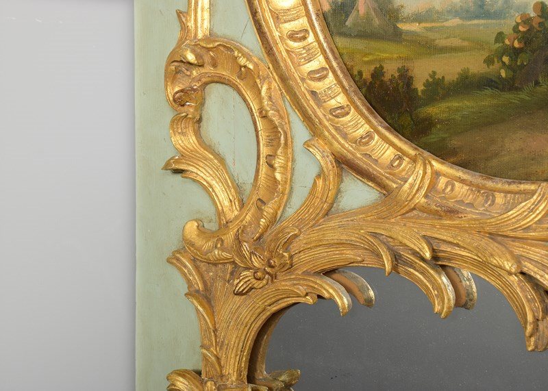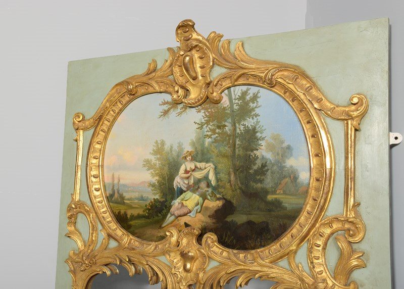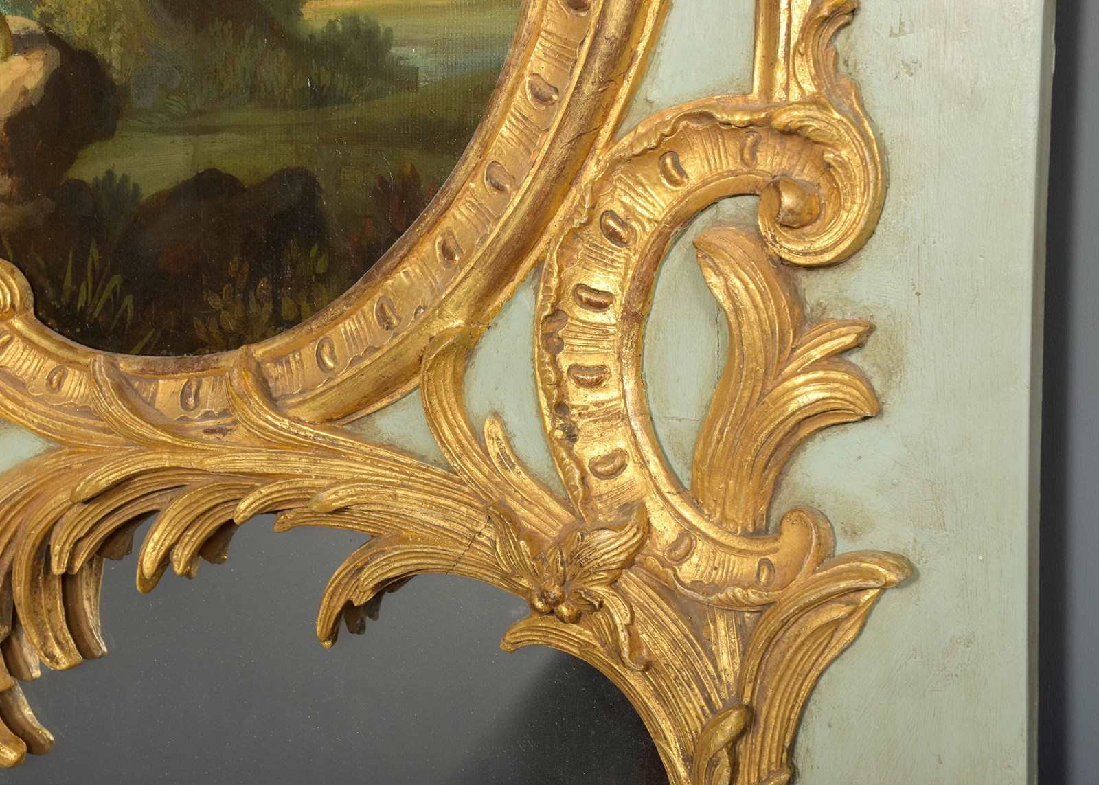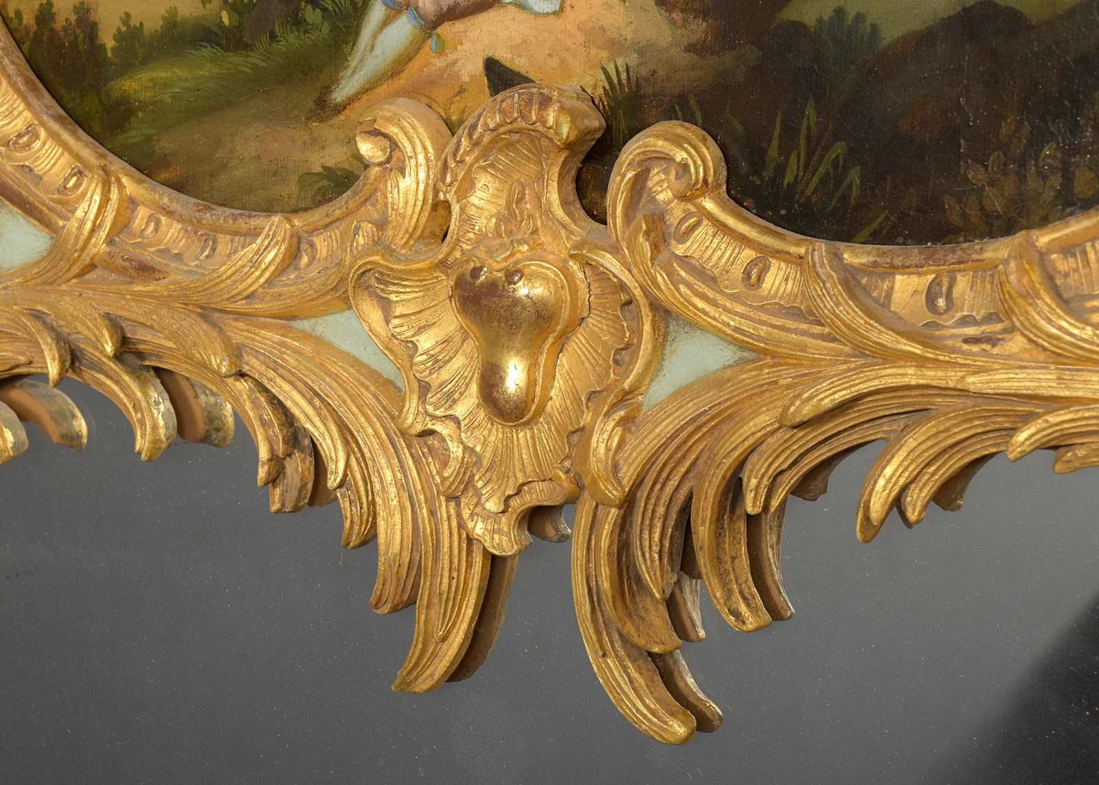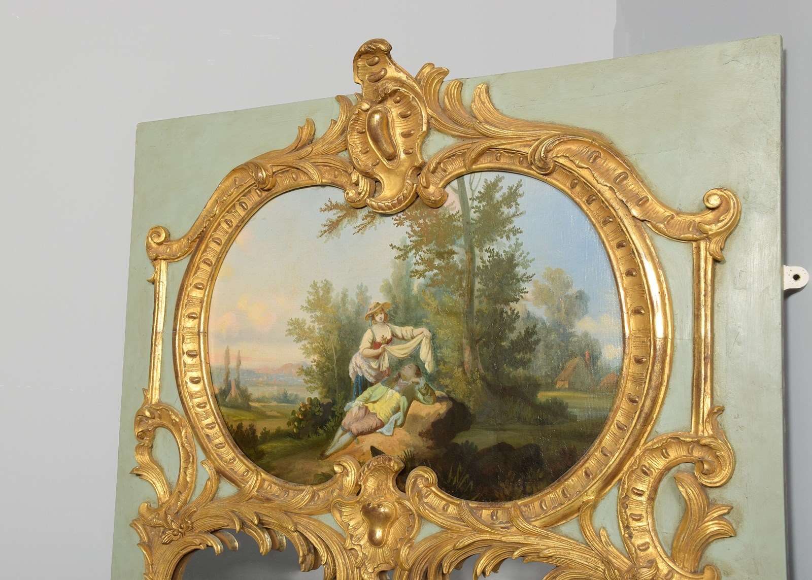 Circa 1870, a stylish French painted Trumeau mirror in the rococo style, with an oil on canvas panel after 'Boucher' above a shaped mirror plate enclosed by a foliate rococo frame on a green painted ground