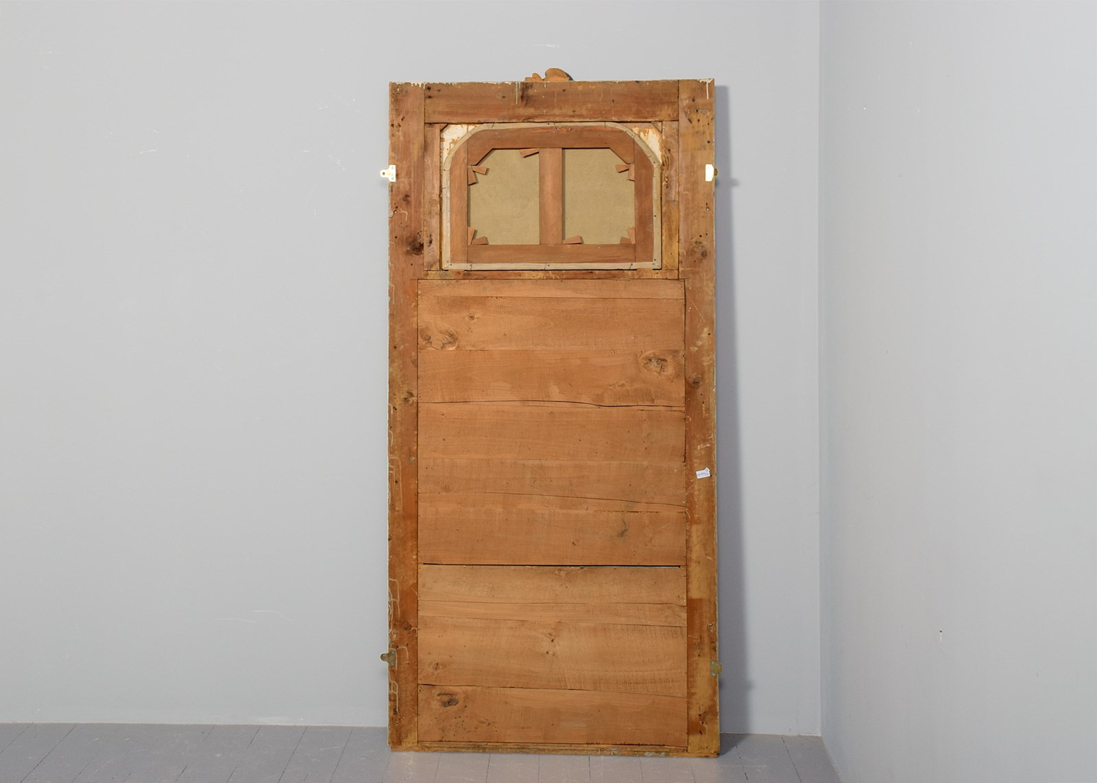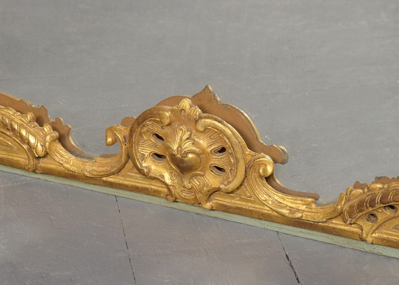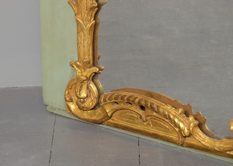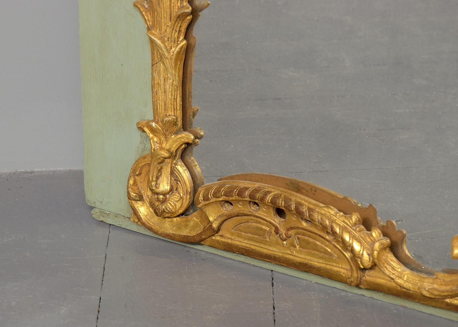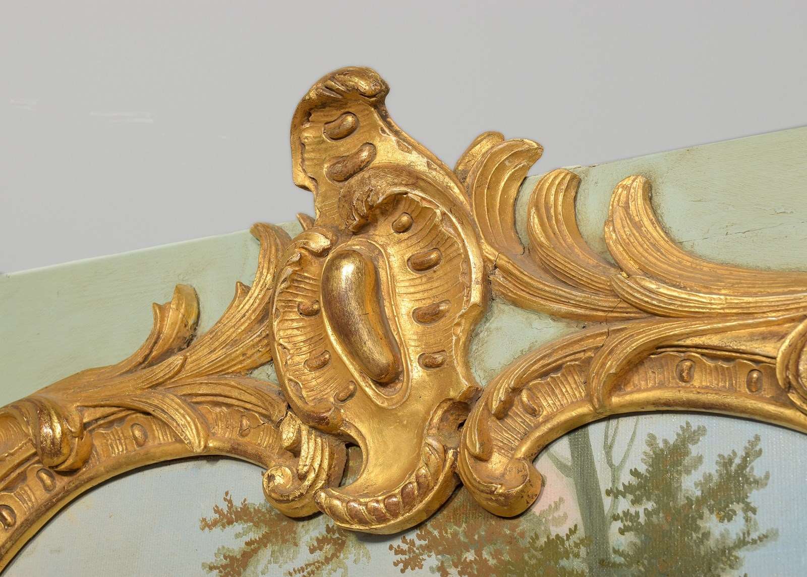 Circa 1870, a stylish French painted Trumeau mirror in the rococo style, with an oil on canvas panel after 'Boucher' above a shaped mirror plate enclosed by a foliate rococo frame on a green painted ground