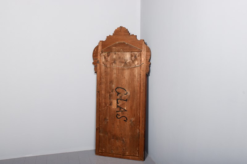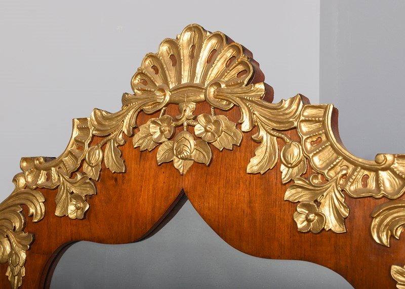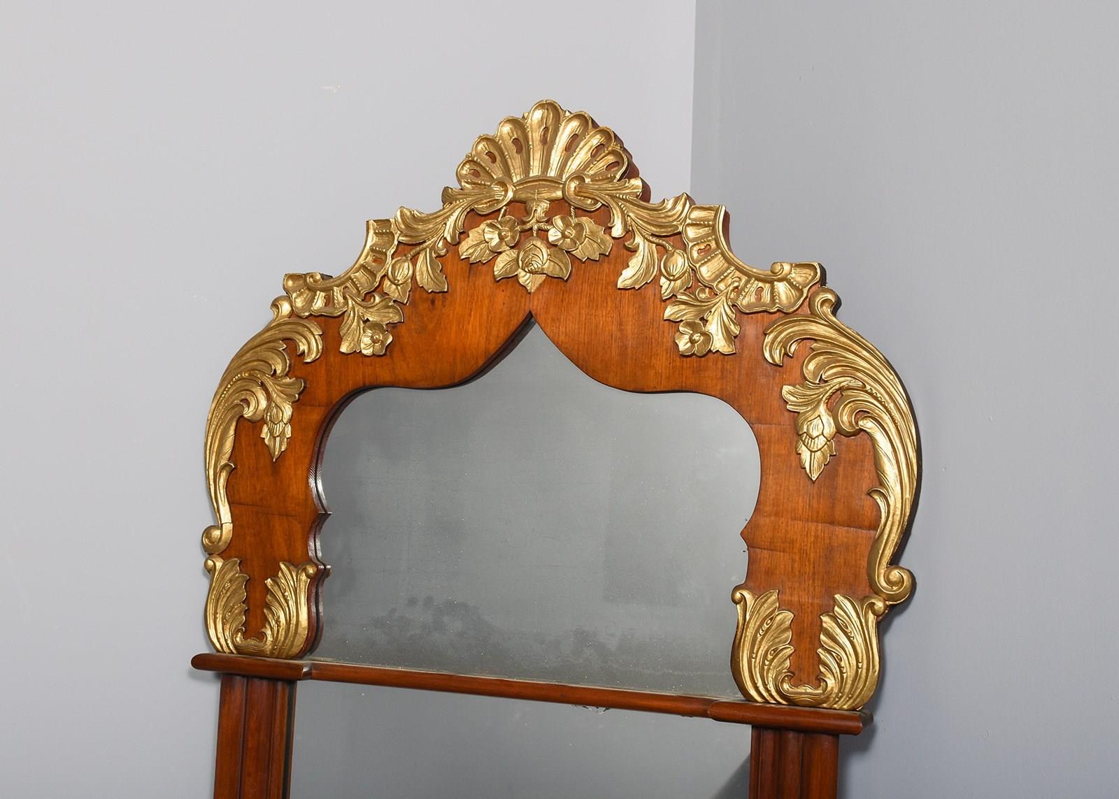 Circa 1870. Swedish mahogany and giltwood wall mirror with Rococo foliate carving to the shaped top section over a fluted frame to the rectangular base mirror. Solid back.